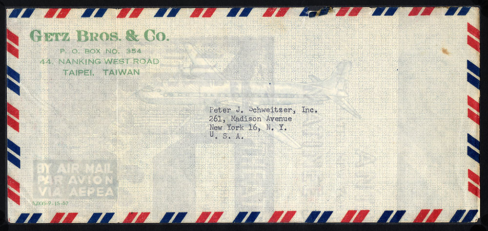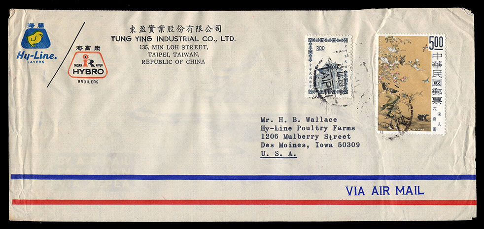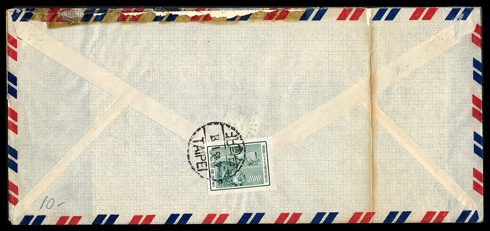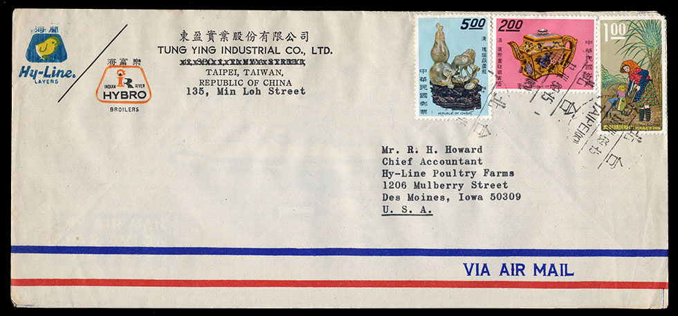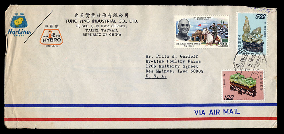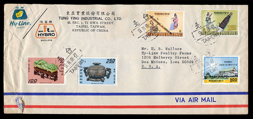 國際封五件:(1)1969年自台北寄美國航空封,貼鐵路75週年7元一枚,銷台北(戊二)戳;(2)1969年台北東盈實業股份有限公司寄美國航空封,貼台灣票三枚(郵資共計8元),銷台北戳;(3)1969年台北東盈實業股份有限公司寄美國航空封,貼台灣票三枚(郵資共計8元),銷台北(辛)戳;(4)1969年台北東盈實業股份有限公司寄美國航空封,貼台灣票五枚(郵資共計8元),銷台北戳;(5)1969年台北東盈實業股份有限公司寄美國航空封,貼花鳥圖5元一枚.三莒3元一枚,銷台北戳