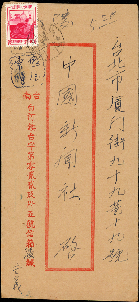 信封分類 大清郵政 1911年以前清代~國家郵政史(1082-1112)清代~商埠郵政史(1156-1158)在華客郵郵史(1168-1188)中華民國郵政 1912~1949年民國~郵政史(1424-1537)民國~名人封(1538-1547)民國~防盜(1548-1559)民國~首航封(1560-1570)民國~欠資封(1571-1574)民國~檢查封(1575-1599)民國~行動郵局/信櫃(1600-1613)兩岸通郵史(1933年-1989年)(1614-1632)民國~郵政匯兌(1633-1644)民國~民信局/僑批(1645-1651)民國~郵政明信片(1652-1659)民國~風景明信片(1660-1683)民國~國內及國際航空郵簡(1684-1703)日偽政權~郵政史(1714-1723)台灣 1888~2020年台灣~整批/整冊信封(3554-3583)日治時期~台灣郵史1895~1945(3601-3661)日治時期~台灣明信片(3662-3688)日治時期~台灣風景片(3689-3695)台灣老台幣時期~國父像火炬圖『限臺灣省用』明信片(3738-3739)台灣~老台幣時期郵政史1945~1949(3740-3815)台灣~自動化實寄封(4646-4647)台灣~新台幣時期郵政史(6001-6041)大陳島(6042)台灣~代辦所/欠資/首航(6043-6055)台灣~郵政匯兌(6056-6073)台灣~首日封(6074-6090)台灣~郵資封/郵政明信片(6091-6100)台灣~原圖卡(6101-6113)台灣~國內及國際航空郵簡(6114-6122)中國人民郵政 1949~2018年新中國~解放區郵史(6128-6140)新中國~郵政史(6277-6289)新中國~郵政匯兌/郵資封片(6290-6304)中國香港~郵政史(6314-6316)世界各國郵票日本郵政史(6327-6334)外國信封(A~Z)(6350-6365) 大清郵政 1911年以前 ↳清代~國家郵政史(1082-1112) ↳清代~商埠郵政史(1156-1158) ↳在華客郵郵史(1168-1188)中華民國郵政 1912~1949年 ↳民國~郵政史(1424-1537) ↳民國~名人封(1538-1547) ↳民國~防盜(1548-1559) ↳民國~首航封(1560-1570) ↳民國~欠資封(1571-1574) ↳民國~檢查封(1575-1599) ↳民國~行動郵局/信櫃(1600-1613) ↳兩岸通郵史(1933年-1989年)(1614-1632) ↳民國~郵政匯兌(1633-1644) ↳民國~民信局/僑批(1645-1651) ↳民國~郵政明信片(1652-1659) ↳民國~風景明信片(1660-1683) ↳民國~國內及國際航空郵簡(1684-1703) ↳日偽政權~郵政史(1714-1723)台灣 1888~2020年 ↳台灣~整批/整冊信封(3554-3583) ↳日治時期~台灣郵史1895~1945(3601-3661) ↳日治時期~台灣明信片(3662-3688) ↳日治時期~台灣風景片(3689-3695) ↳台灣老台幣時期~國父像火炬圖『限臺灣省用』明信片(3738-3739) ↳台灣~老台幣時期郵政史1945~1949(3740-3815) ↳台灣~自動化實寄封(4646-4647) ↳台灣~新台幣時期郵政史(6001-6041) ↳大陳島(6042) ↳台灣~代辦所/欠資/首航(6043-6055) ↳台灣~郵政匯兌(6056-6073) ↳台灣~首日封(6074-6090) ↳台灣~郵資封/郵政明信片(6091-6100) ↳台灣~原圖卡(6101-6113) ↳台灣~國內及國際航空郵簡(6114-6122)中國人民郵政 1949~2018年 ↳新中國~解放區郵史(6128-6140) ↳新中國~郵政史(6277-6289) ↳新中國~郵政匯兌/郵資封片(6290-6304) ↳中國香港~郵政史(6314-6316)世界各國郵票 ↳日本郵政史(6327-6334) ↳外國信封(A~Z)(6350-6365) 點大圖放大展示,點小圖切換 1947年台南寄台北封,貼蔣總統七秩4角1枚,銷台灣白河/仙草埔(代)四六年十月七日,背銷台北46.11.7機宣到戳(Page 120) 結標時間 2025-12-16 10:14:00 拍品編號:6043 起拍價:NT$100 當前價:NT$100 自動出價 直接出價 出價 系統將按出價級數,依序為您比(出)價至上限金額 提醒您:直接出價後不可將金額改低,只能改高,蟠龍無法降低您的出價,最高出價者無法取消出價 (查看出價說明) 得標說明:需按得標價另加10%佣金 當前加價幅度:NT$0元 (查看加價級數表) 回上頁 線上出價記錄 線上 0 人次,書面 0 人次 競價客戶 所在地 出價時間 出價金額 出價方式 問與答 目前尚無提問 我要提問 請先登入會員