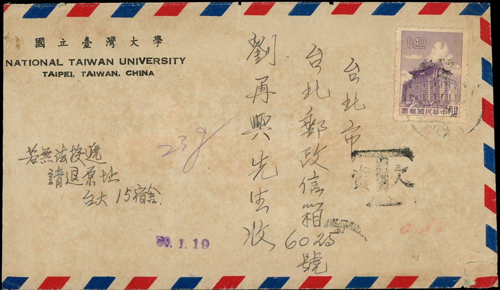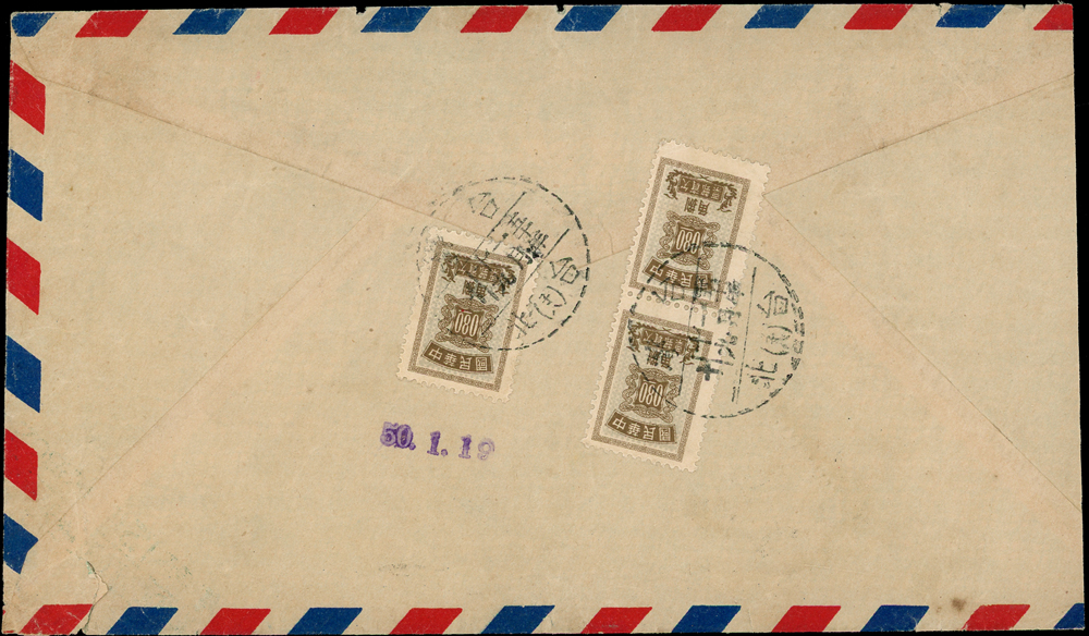 超重欠資封二封:(1)1961年台北寄本埠封,貼二莒4角1枚,銷戳不清,旁另銷『T/欠資』章,背補貼台北版欠資8角3枚,銷台北(子八)五十年一月十九;(2)1962年台中寄澎湖四健會首日低值封,貼票8角1枚,銷台中臨時郵局五十一年十二月七日首日戳,旁另銷『T/欠資』章,背補貼台北版欠資8角2枚,銷澎湖五十一年十二月九日(Page 121)