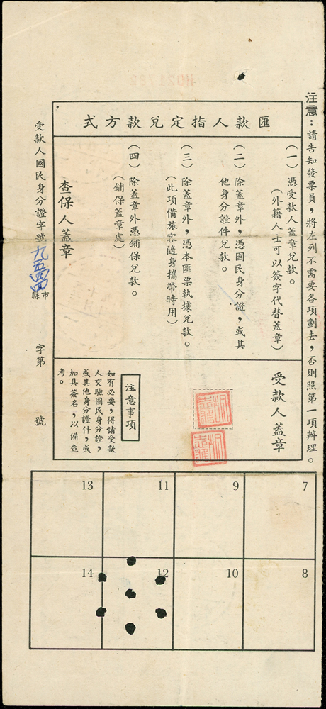 信封分類 大清郵政 1911年以前清代~國家郵政史(1082-1112)清代~商埠郵政史(1156-1158)在華客郵郵史(1168-1188)中華民國郵政 1912~1949年民國~郵政史(1424-1537)民國~名人封(1538-1547)民國~防盜(1548-1559)民國~首航封(1560-1570)民國~欠資封(1571-1574)民國~檢查封(1575-1599)民國~行動郵局/信櫃(1600-1613)兩岸通郵史(1933年-1989年)(1614-1632)民國~郵政匯兌(1633-1644)民國~民信局/僑批(1645-1651)民國~郵政明信片(1652-1659)民國~風景明信片(1660-1683)民國~國內及國際航空郵簡(1684-1703)日偽政權~郵政史(1714-1723)台灣 1888~2020年台灣~整批/整冊信封(3554-3583)日治時期~台灣郵史1895~1945(3601-3661)日治時期~台灣明信片(3662-3688)日治時期~台灣風景片(3689-3695)台灣老台幣時期~國父像火炬圖『限臺灣省用』明信片(3738-3739)台灣~老台幣時期郵政史1945~1949(3740-3815)台灣~自動化實寄封(4646-4647)台灣~新台幣時期郵政史(6001-6041)大陳島(6042)台灣~代辦所/欠資/首航(6043-6055)台灣~郵政匯兌(6056-6073)台灣~首日封(6074-6090)台灣~郵資封/郵政明信片(6091-6100)台灣~原圖卡(6101-6113)台灣~國內及國際航空郵簡(6114-6122)中國人民郵政 1949~2018年新中國~解放區郵史(6128-6140)新中國~郵政史(6277-6289)新中國~郵政匯兌/郵資封片(6290-6304)中國香港~郵政史(6314-6316)世界各國郵票日本郵政史(6327-6334)外國信封(A~Z)(6350-6365) 大清郵政 1911年以前 ↳清代~國家郵政史(1082-1112) ↳清代~商埠郵政史(1156-1158) ↳在華客郵郵史(1168-1188)中華民國郵政 1912~1949年 ↳民國~郵政史(1424-1537) ↳民國~名人封(1538-1547) ↳民國~防盜(1548-1559) ↳民國~首航封(1560-1570) ↳民國~欠資封(1571-1574) ↳民國~檢查封(1575-1599) ↳民國~行動郵局/信櫃(1600-1613) ↳兩岸通郵史(1933年-1989年)(1614-1632) ↳民國~郵政匯兌(1633-1644) ↳民國~民信局/僑批(1645-1651) ↳民國~郵政明信片(1652-1659) ↳民國~風景明信片(1660-1683) ↳民國~國內及國際航空郵簡(1684-1703) ↳日偽政權~郵政史(1714-1723)台灣 1888~2020年 ↳台灣~整批/整冊信封(3554-3583) ↳日治時期~台灣郵史1895~1945(3601-3661) ↳日治時期~台灣明信片(3662-3688) ↳日治時期~台灣風景片(3689-3695) ↳台灣老台幣時期~國父像火炬圖『限臺灣省用』明信片(3738-3739) ↳台灣~老台幣時期郵政史1945~1949(3740-3815) ↳台灣~自動化實寄封(4646-4647) ↳台灣~新台幣時期郵政史(6001-6041) ↳大陳島(6042) ↳台灣~代辦所/欠資/首航(6043-6055) ↳台灣~郵政匯兌(6056-6073) ↳台灣~首日封(6074-6090) ↳台灣~郵資封/郵政明信片(6091-6100) ↳台灣~原圖卡(6101-6113) ↳台灣~國內及國際航空郵簡(6114-6122)中國人民郵政 1949~2018年 ↳新中國~解放區郵史(6128-6140) ↳新中國~郵政史(6277-6289) ↳新中國~郵政匯兌/郵資封片(6290-6304) ↳中國香港~郵政史(6314-6316)世界各國郵票 ↳日本郵政史(6327-6334) ↳外國信封(A~Z)(6350-6365) 點大圖放大展示,點小圖切換 民國53年郵政國內匯票,貼匯兌印紙3枚計450元,銷台灣水裏/一代五三年十月九日,兌款局銷大甲五三年十月十三(Page 122) 結標時間 2025-12-16 10:21:20 拍品編號:6065 起拍價:NT$500 當前價:NT$500 自動出價 直接出價 出價 系統將按出價級數,依序為您比(出)價至上限金額 提醒您:直接出價後不可將金額改低,只能改高,蟠龍無法降低您的出價,最高出價者無法取消出價 (查看出價說明) 得標說明:需按得標價另加10%佣金 當前加價幅度:NT$0元 (查看加價級數表) 回上頁 線上出價記錄 線上 0 人次,書面 0 人次 競價客戶 所在地 出價時間 出價金額 出價方式 問與答 目前尚無提問 我要提問 請先登入會員