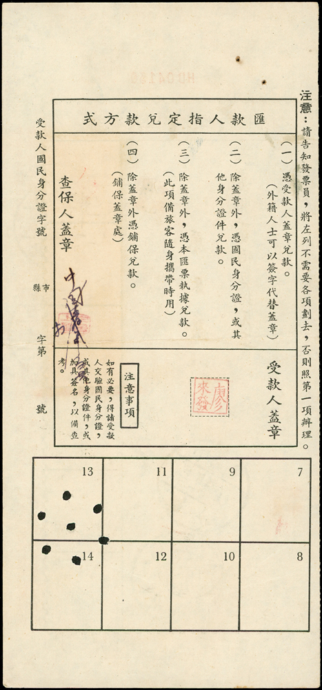 信封分類 大清郵政 1911年以前清代~國家郵政史(1082-1112)清代~商埠郵政史(1156-1158)在華客郵郵史(1168-1188)中華民國郵政 1912~1949年民國~郵政史(1424-1537)民國~名人封(1538-1547)民國~防盜(1548-1559)民國~首航封(1560-1570)民國~欠資封(1571-1574)民國~檢查封(1575-1599)民國~行動郵局/信櫃(1600-1613)兩岸通郵史(1933年-1989年)(1614-1632)民國~郵政匯兌(1633-1644)民國~民信局/僑批(1645-1651)民國~郵政明信片(1652-1659)民國~風景明信片(1660-1683)民國~國內及國際航空郵簡(1684-1703)日偽政權~郵政史(1714-1723)台灣 1888~2020年台灣~整批/整冊信封(3554-3583)日治時期~台灣郵史1895~1945(3601-3661)日治時期~台灣明信片(3662-3688)日治時期~台灣風景片(3689-3695)台灣老台幣時期~國父像火炬圖『限臺灣省用』明信片(3738-3739)台灣~老台幣時期郵政史1945~1949(3740-3815)台灣~自動化實寄封(4646-4647)台灣~新台幣時期郵政史(6001-6041)大陳島(6042)台灣~代辦所/欠資/首航(6043-6055)台灣~郵政匯兌(6056-6073)台灣~首日封(6074-6090)台灣~郵資封/郵政明信片(6091-6100)台灣~原圖卡(6101-6113)台灣~國內及國際航空郵簡(6114-6122)中國人民郵政 1949~2018年新中國~解放區郵史(6128-6140)新中國~郵政史(6277-6289)新中國~郵政匯兌/郵資封片(6290-6304)中國香港~郵政史(6314-6316)世界各國郵票日本郵政史(6327-6334)外國信封(A~Z)(6350-6365) 大清郵政 1911年以前 ↳清代~國家郵政史(1082-1112) ↳清代~商埠郵政史(1156-1158) ↳在華客郵郵史(1168-1188)中華民國郵政 1912~1949年 ↳民國~郵政史(1424-1537) ↳民國~名人封(1538-1547) ↳民國~防盜(1548-1559) ↳民國~首航封(1560-1570) ↳民國~欠資封(1571-1574) ↳民國~檢查封(1575-1599) ↳民國~行動郵局/信櫃(1600-1613) ↳兩岸通郵史(1933年-1989年)(1614-1632) ↳民國~郵政匯兌(1633-1644) ↳民國~民信局/僑批(1645-1651) ↳民國~郵政明信片(1652-1659) ↳民國~風景明信片(1660-1683) ↳民國~國內及國際航空郵簡(1684-1703) ↳日偽政權~郵政史(1714-1723)台灣 1888~2020年 ↳台灣~整批/整冊信封(3554-3583) ↳日治時期~台灣郵史1895~1945(3601-3661) ↳日治時期~台灣明信片(3662-3688) ↳日治時期~台灣風景片(3689-3695) ↳台灣老台幣時期~國父像火炬圖『限臺灣省用』明信片(3738-3739) ↳台灣~老台幣時期郵政史1945~1949(3740-3815) ↳台灣~自動化實寄封(4646-4647) ↳台灣~新台幣時期郵政史(6001-6041) ↳大陳島(6042) ↳台灣~代辦所/欠資/首航(6043-6055) ↳台灣~郵政匯兌(6056-6073) ↳台灣~首日封(6074-6090) ↳台灣~郵資封/郵政明信片(6091-6100) ↳台灣~原圖卡(6101-6113) ↳台灣~國內及國際航空郵簡(6114-6122)中國人民郵政 1949~2018年 ↳新中國~解放區郵史(6128-6140) ↳新中國~郵政史(6277-6289) ↳新中國~郵政匯兌/郵資封片(6290-6304) ↳中國香港~郵政史(6314-6316)世界各國郵票 ↳日本郵政史(6327-6334) ↳外國信封(A~Z)(6350-6365) 點大圖放大展示,點小圖切換 1 民國53年郵政國內匯票,貼匯兌印紙3枚計250元,銷台灣玉井/北寮(代)五三年十月二日,兌款局銷鳳山(儲匯)五三年十月三日(Page 122) 結標時間 2025-12-16 10:22:00 拍品編號:6067 起拍價:NT$500 當前價:NT$500 自動出價 直接出價 出價 系統將按出價級數,依序為您比(出)價至上限金額 提醒您:直接出價後不可將金額改低,只能改高,蟠龍無法降低您的出價,最高出價者無法取消出價 (查看出價說明) 得標說明:需按得標價另加10%佣金 當前加價幅度:NT$0元 (查看加價級數表) 回上頁 線上出價記錄 線上 0 人次,書面 0 人次 競價客戶 所在地 出價時間 出價金額 出價方式 問與答 目前尚無提問 我要提問 請先登入會員