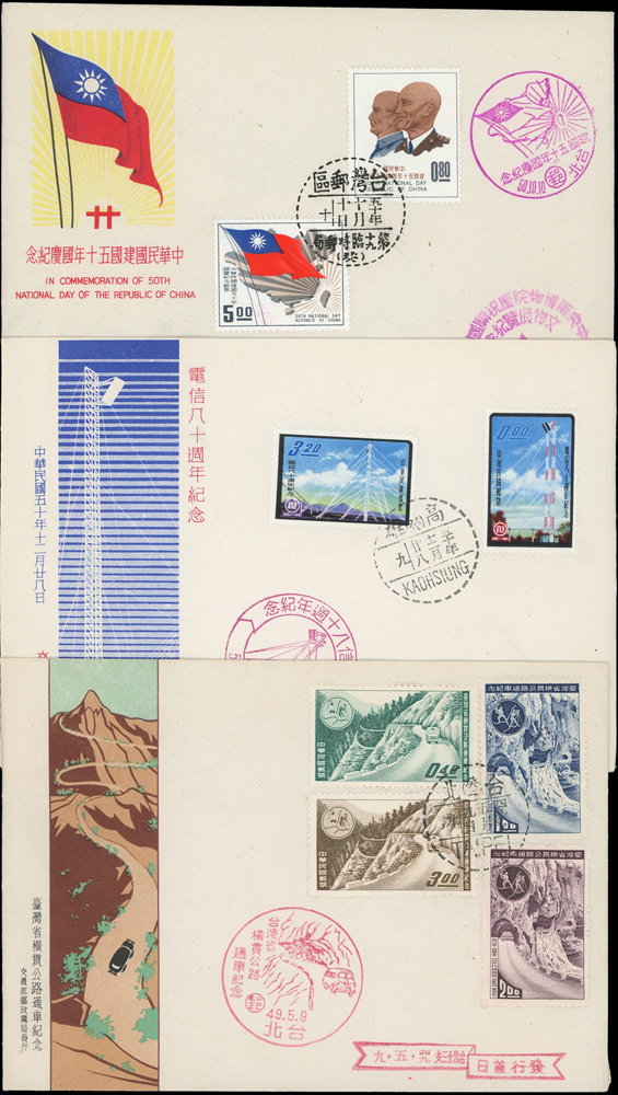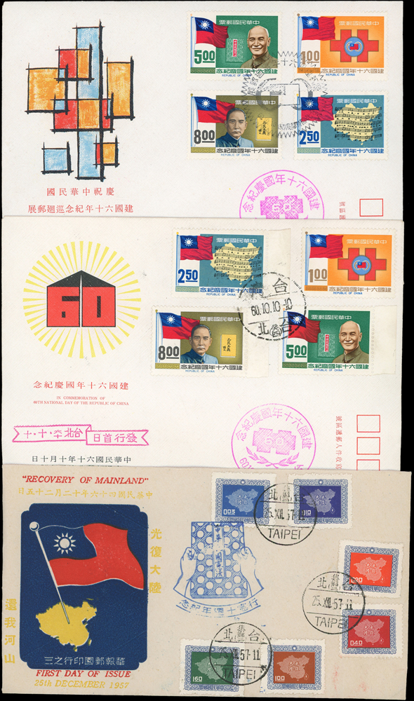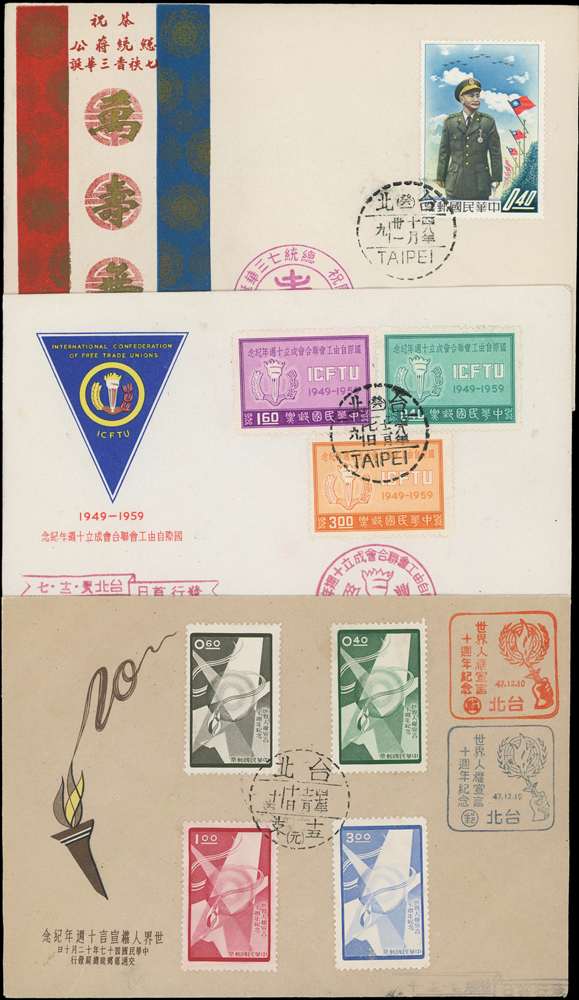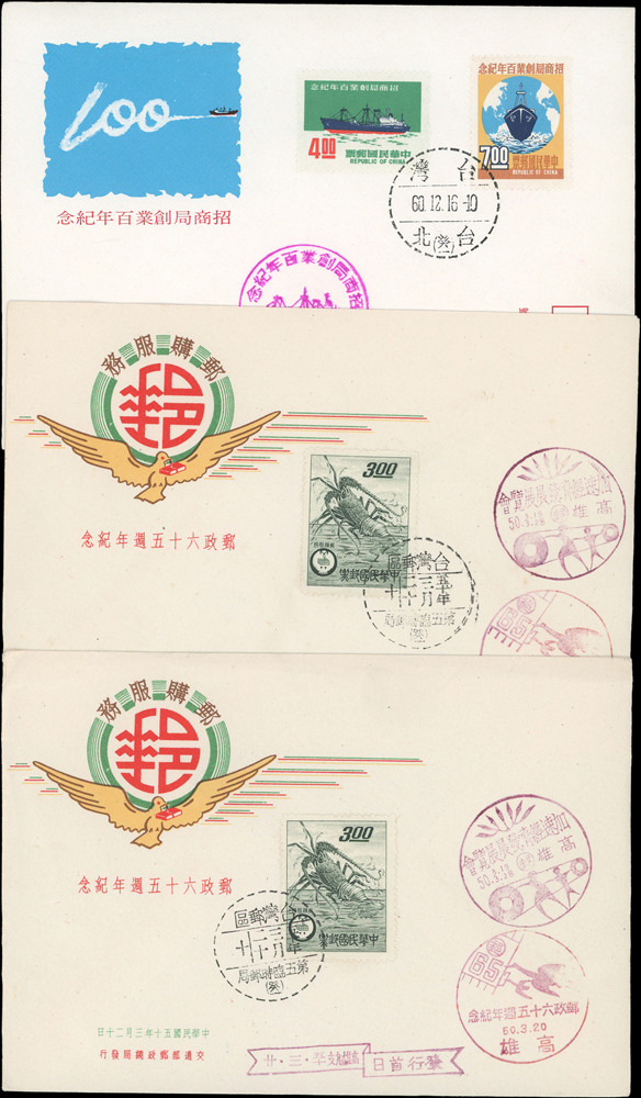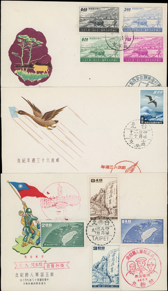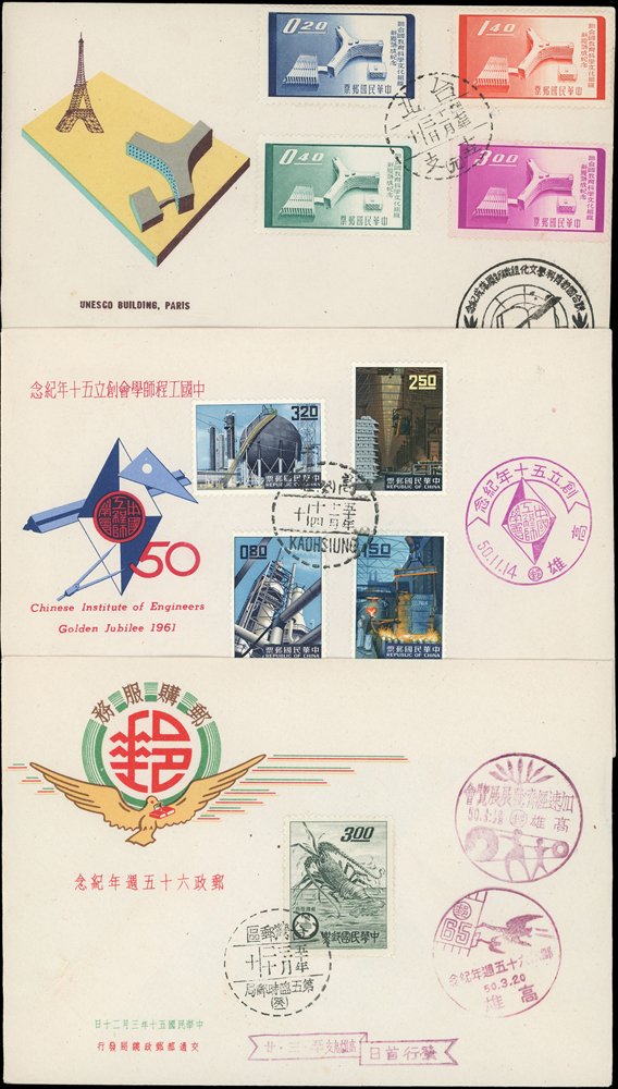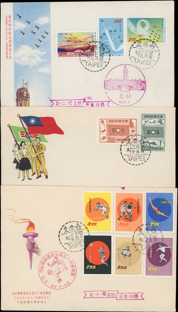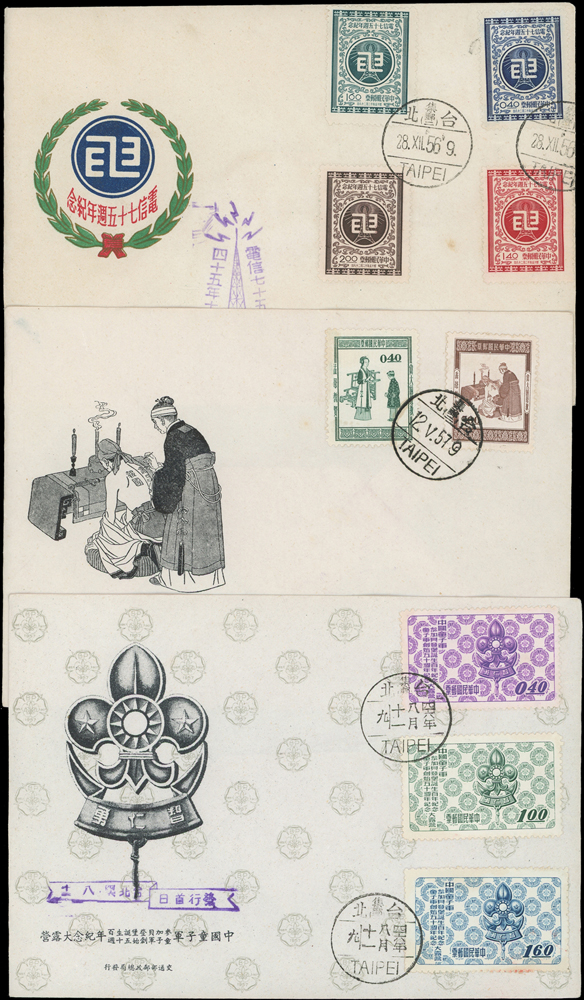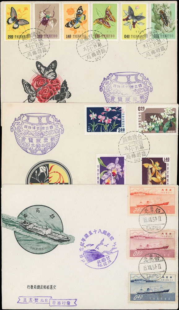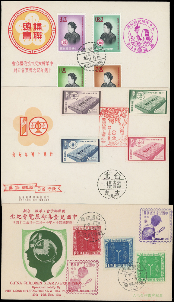 台灣中早期套票首日封57封(51套),包括有:反共義士(分貼3封).蔣總統七秩華誕..兒童節.電信七十五週年.臺灣省橫貫路通車紀念.中華婦女反共抗俄聯合會十週年.行憲十週年.體育(49年版).雷虎小組.招商局八十五週年.臺灣昆蟲(47年版).臺灣花卉(47年版).工業建設(50年版).第三任總統就職週年.電信八十週年.民用航空四十週年.保衛金馬.中國農村復興聯合委員會十週年.母教.郵購服務.一輪鼠.台北版航空改值.清瓷(分貼5封).出警圖.入蹕圖等等;品種豐富,品像混合或有重複,VF-F,歡迎至官網瀏覽全貌