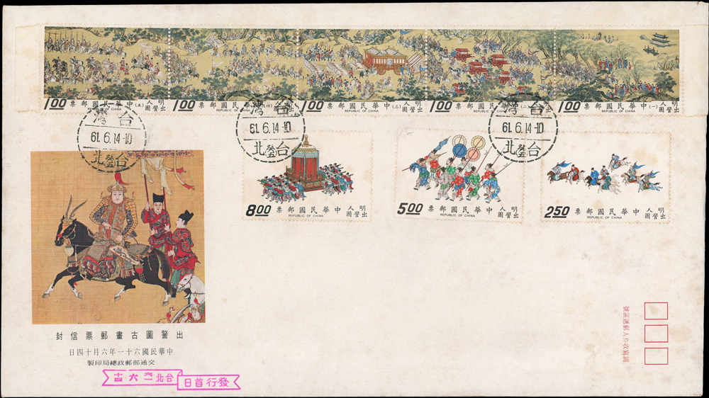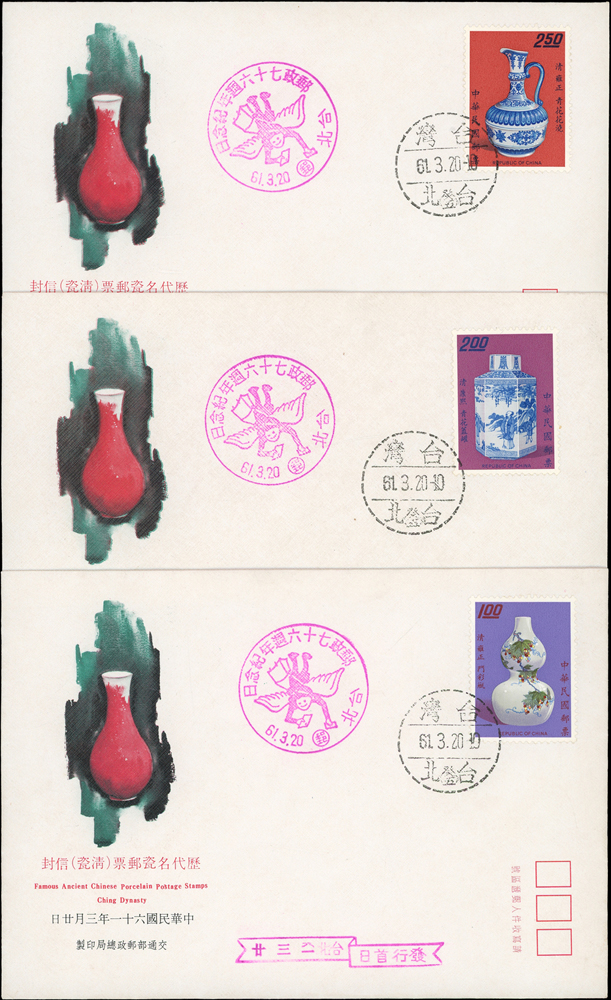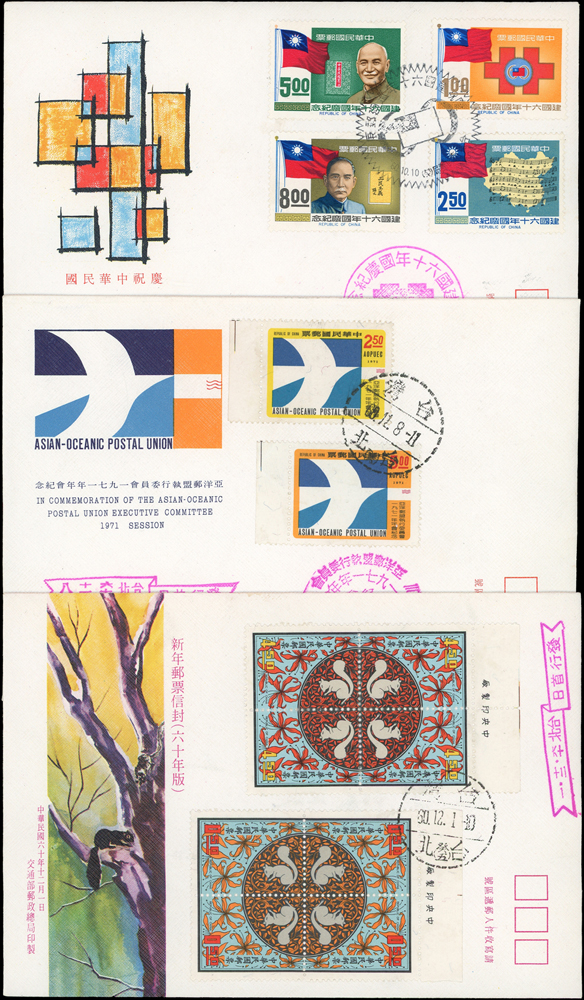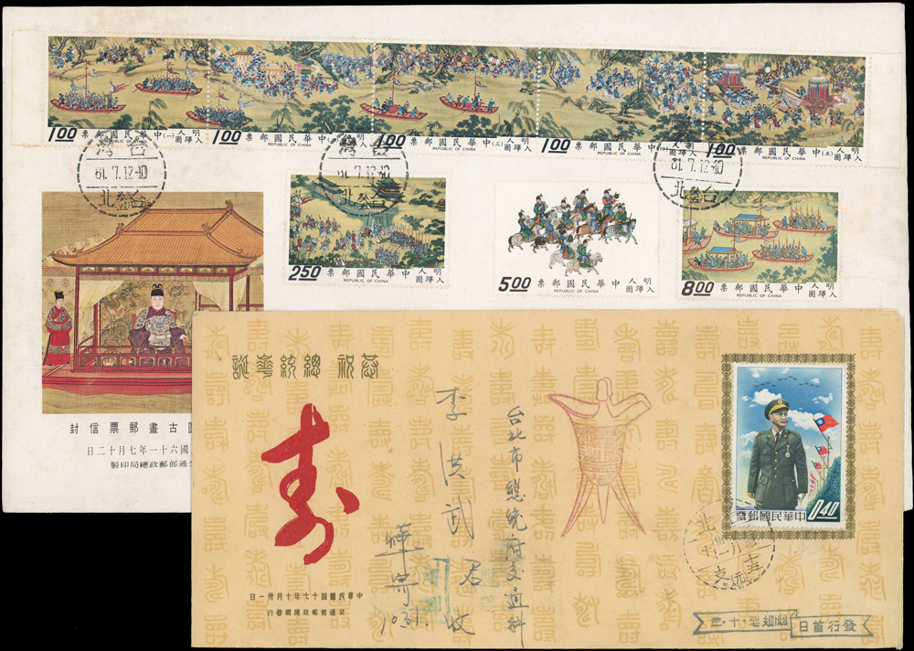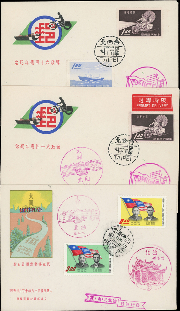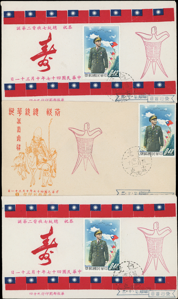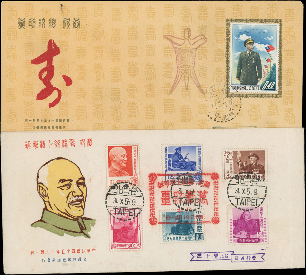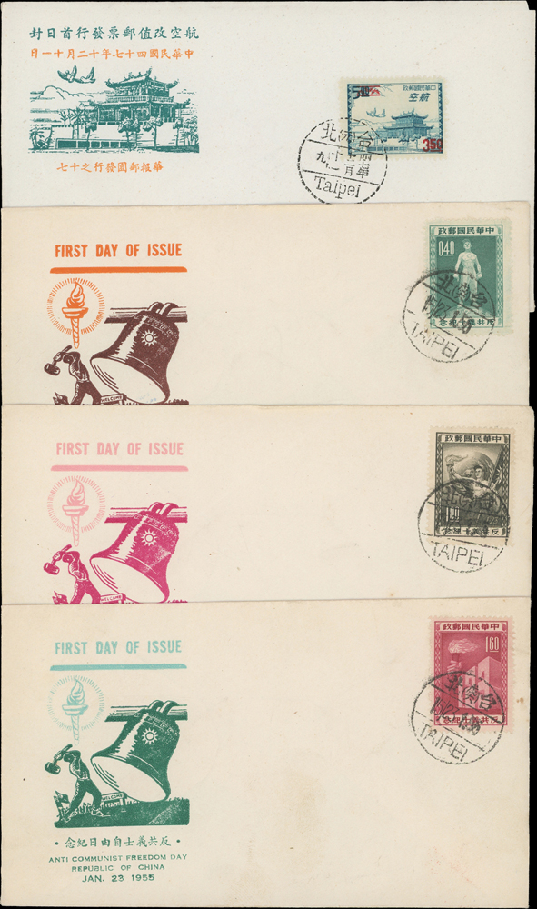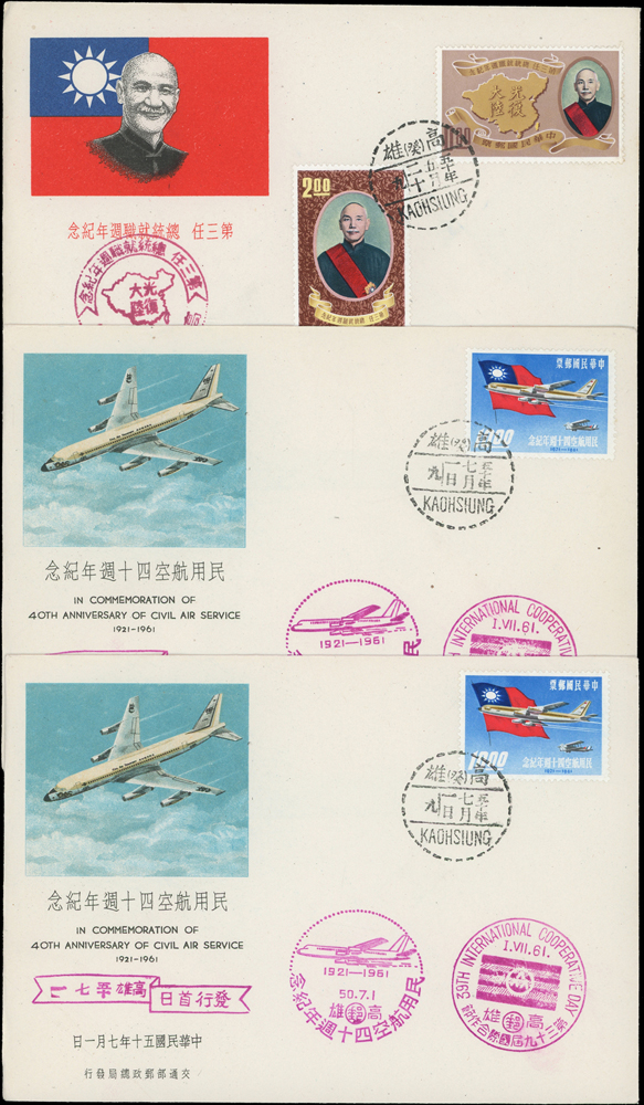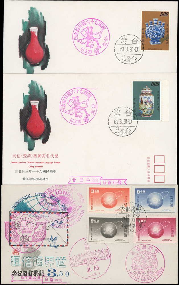 台灣中早期套票首日封57封(51套),包括有:反共義士(分貼3封).蔣總統七秩華誕..兒童節.電信七十五週年.臺灣省橫貫路通車紀念.中華婦女反共抗俄聯合會十週年.行憲十週年.體育(49年版).雷虎小組.招商局八十五週年.臺灣昆蟲(47年版).臺灣花卉(47年版).工業建設(50年版).第三任總統就職週年.電信八十週年.民用航空四十週年.保衛金馬.中國農村復興聯合委員會十週年.母教.郵購服務.一輪鼠.台北版航空改值.清瓷(分貼5封).出警圖.入蹕圖等等;品種豐富,品像混合或有重複,VF-F,歡迎至官網瀏覽全貌