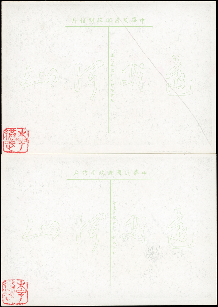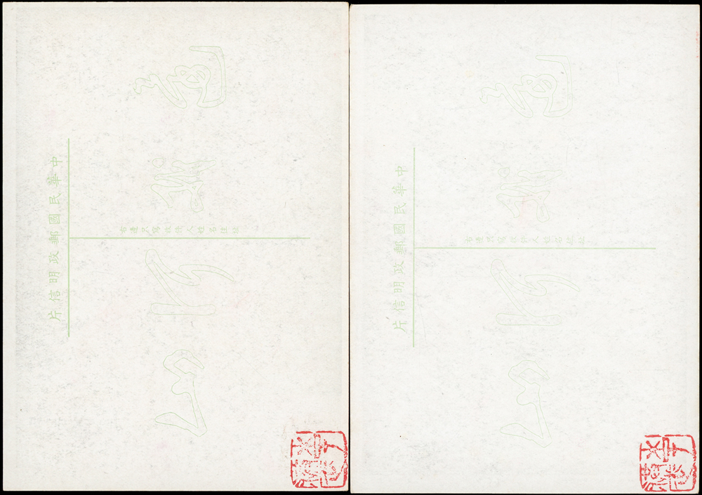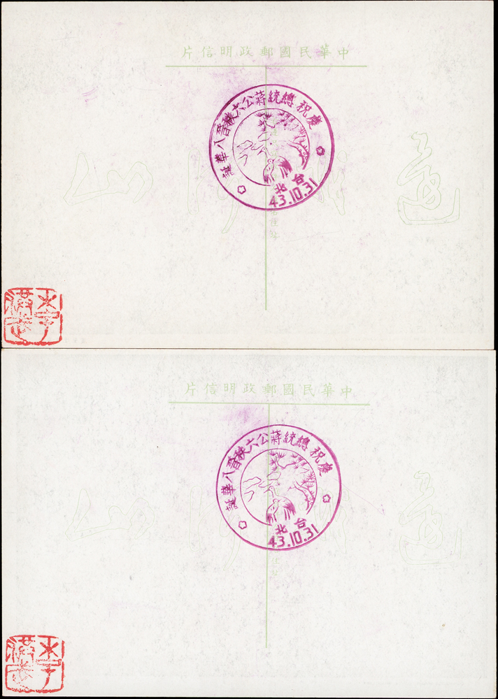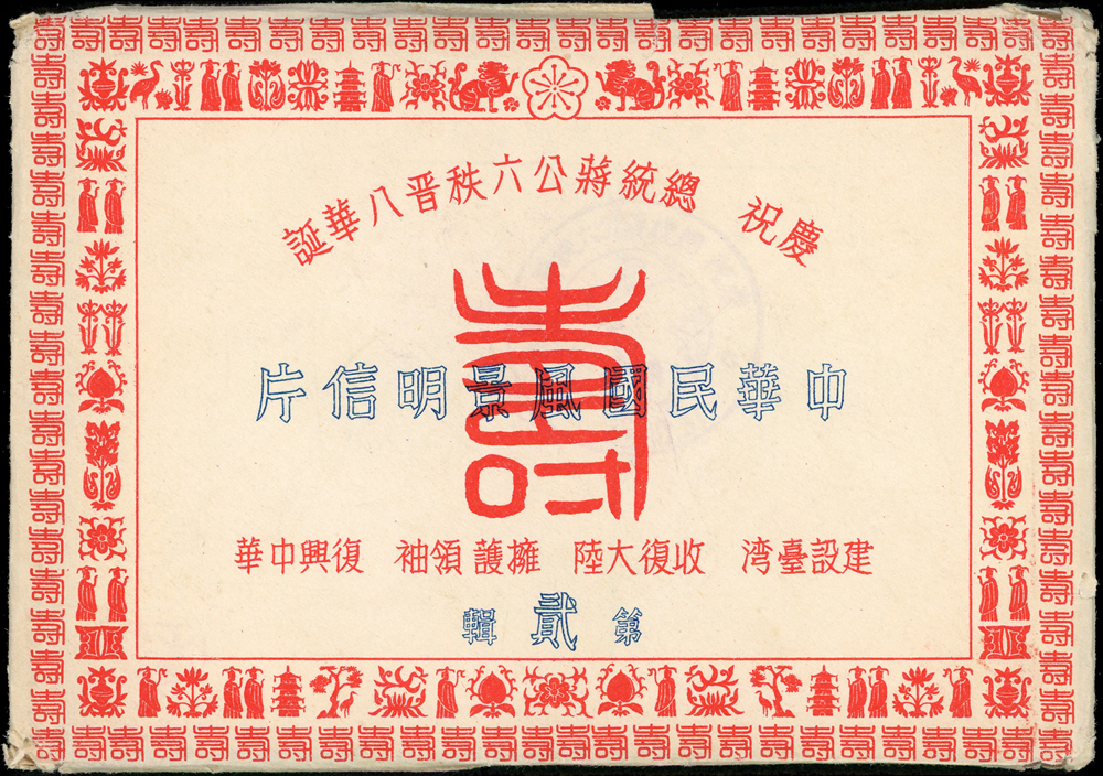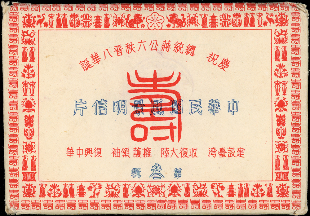 韓目#25~#60.蔣公六秩晉八華誕紀念明信片36片全,附封套,每片格式面及封套均蓋收藏章,第二.三輯格式面及封套銷其紀念戳,其中台灣嘉義回歸線標格式面左上揭薄銷嘉義日戳,江西廬山左邊一道原紙皺痕,部分圖案面微沾染紀戳紅色(Page 124)