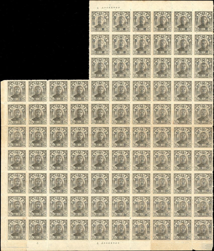 華北區:國父像北京加蓋暫作票零散新票大方連共568枚,含:(1)二元18方連,VF;(2)六元/北平中央一版50方連帶雙邊紙廠銘二件共100枚,VF;(3)六元/北平中央二版50方連帶雙邊紙廠銘二件共100枚,VF;(4)一元50方連帶雙邊紙廠銘,VF,40方連帶三邊紙微黃折痕,88方連帶廠銘微黃,VF-F;(5)拾圓40方連二件,VF;(6)80元22方連,VF;(7)20元/20元18方連,20方連,10方連各一件,VF;(8)300元22方連,VF;楊目#NC352,NC355,NC357,NC358,NC361,NC362,NC363,NC367;Cat.US$2621.1(Page 126)