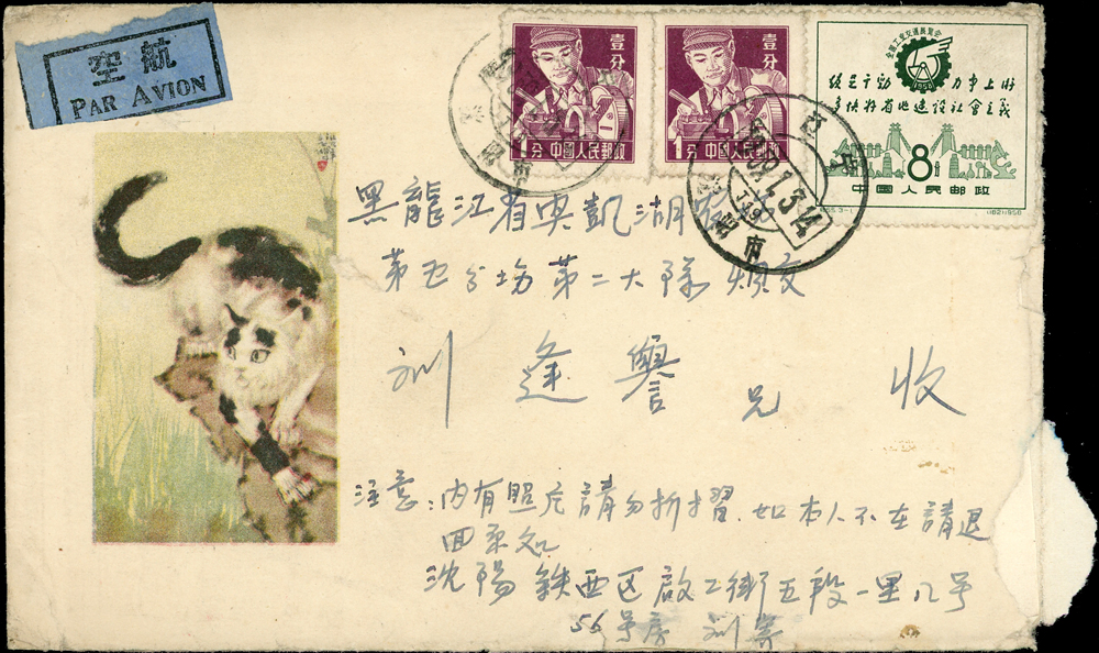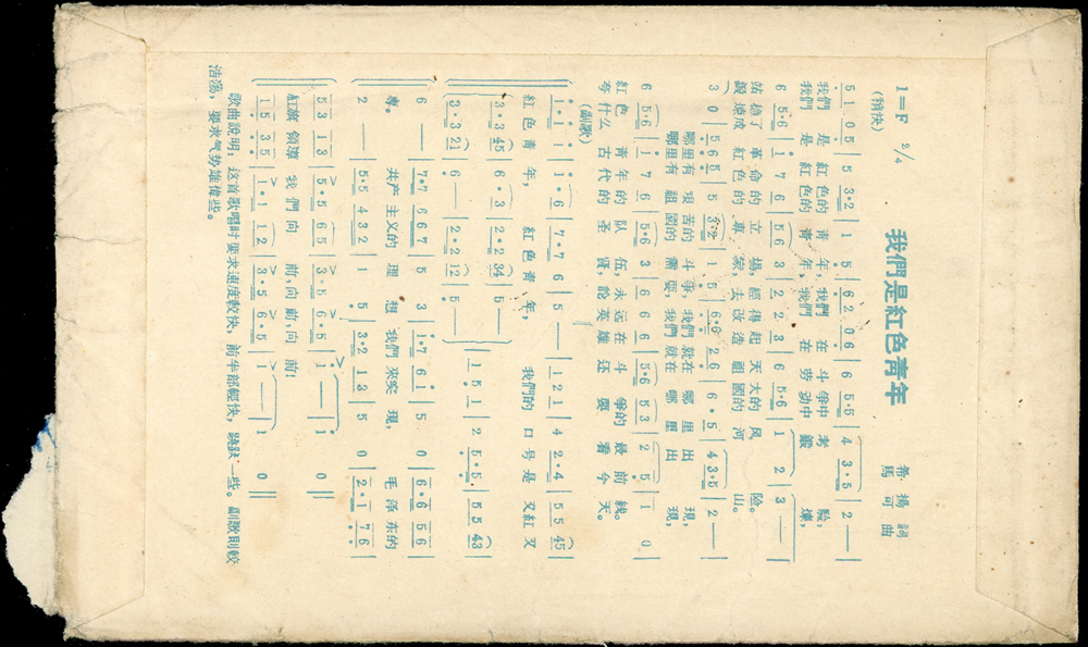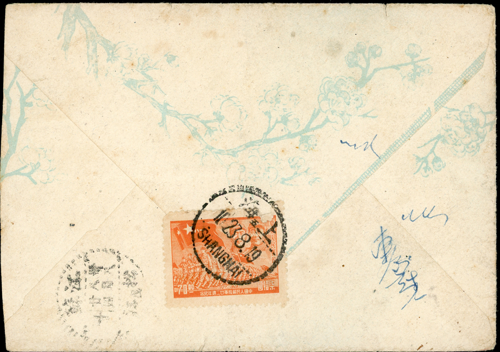 實寄封二件:(1)1949年上海寄松江封,背貼解放軍22週年紀念70元1枚,銷上海23.8.49,松江卅八年八月卄四到戳;(2)1959年瀋陽寄黑龍江美術航空封,貼票3枚寄10分,銷遼寧瀋陽1959.1.3,背印『我們是紅色青年』歌詞(Page 127)