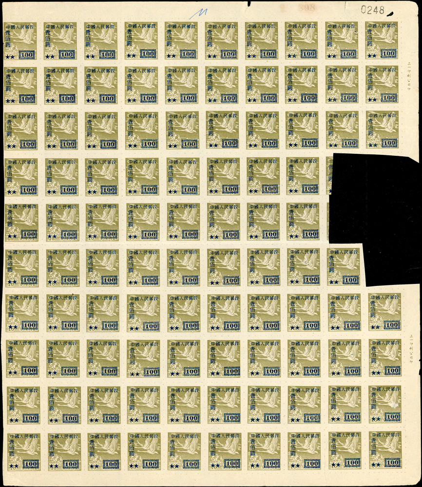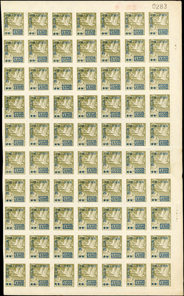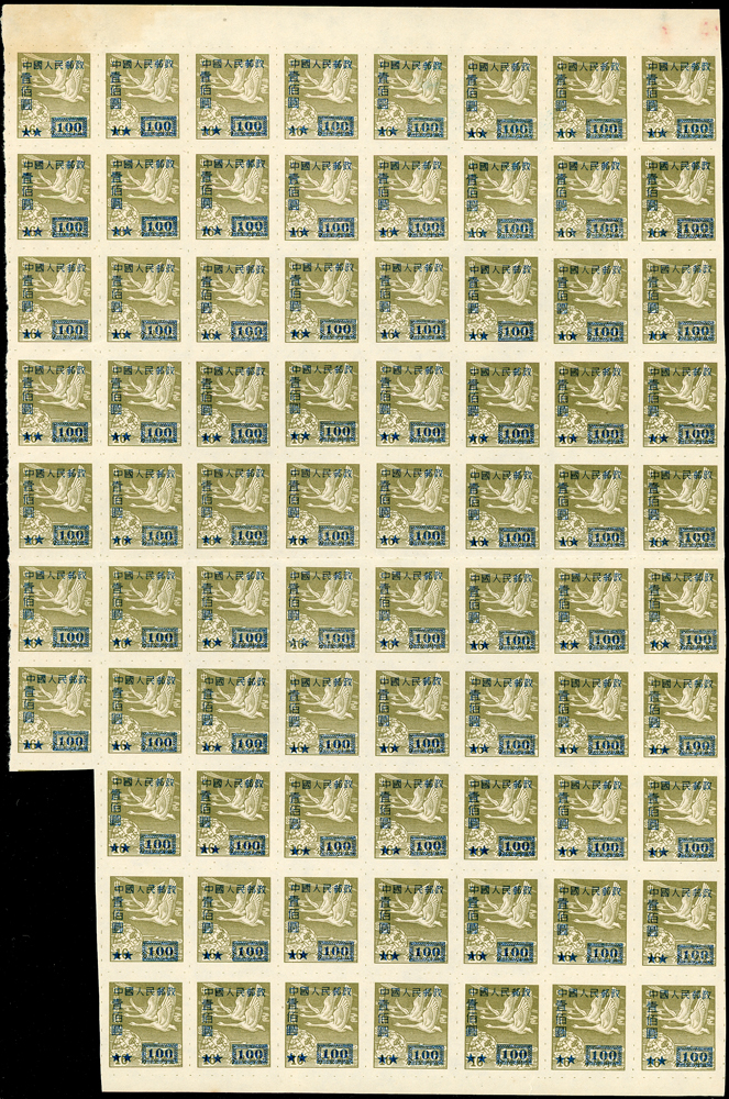改5.飛雁圖基數無齒16分加蓋改值100元新票共331枚,含70方連1件,77方連1件,91方連1件及93方連1件,有5個廠銘,少部份微黃及摺痕,整體中上品(Page 129)
