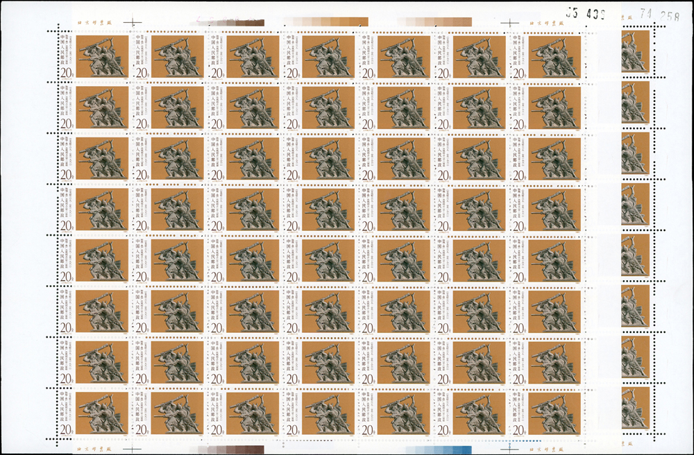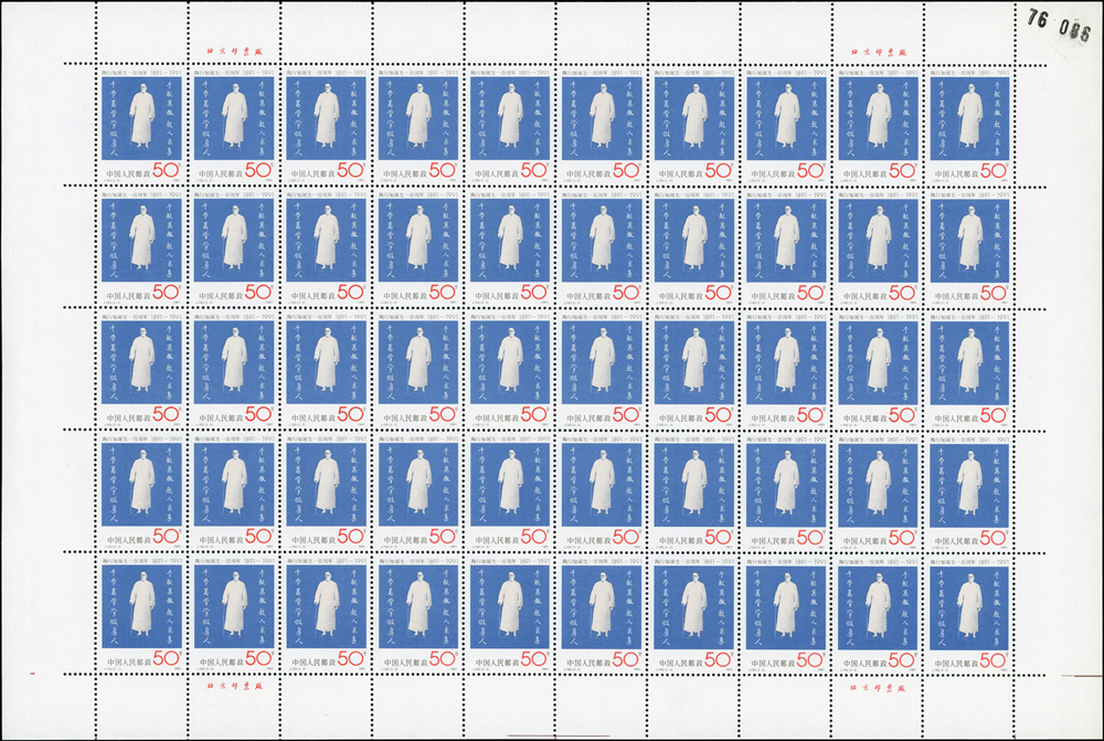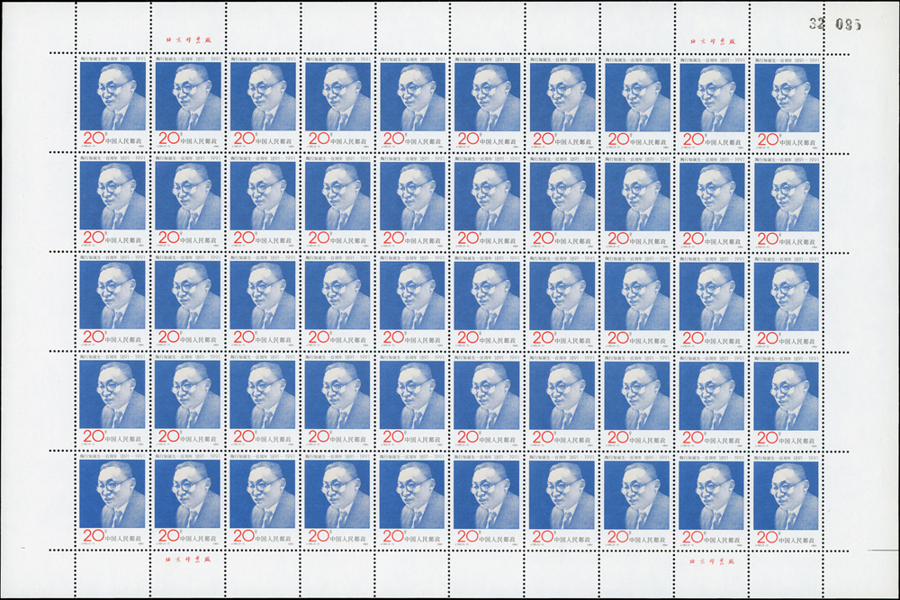 新中國J票版張5版,均為新票,包括:(1)J179.陳勝.吳廣農民起義2200年1全2版,共112套,原膠挺版,少許軟印痕,VF;(2)J180.第十三屆國際第四紀研究聯合會大會1全2版,共80套,原膠折版,VF;(3)J183.陶行知誕生一百週年2全1版50套,原膠挺版,右上角原廠壓痕,VF