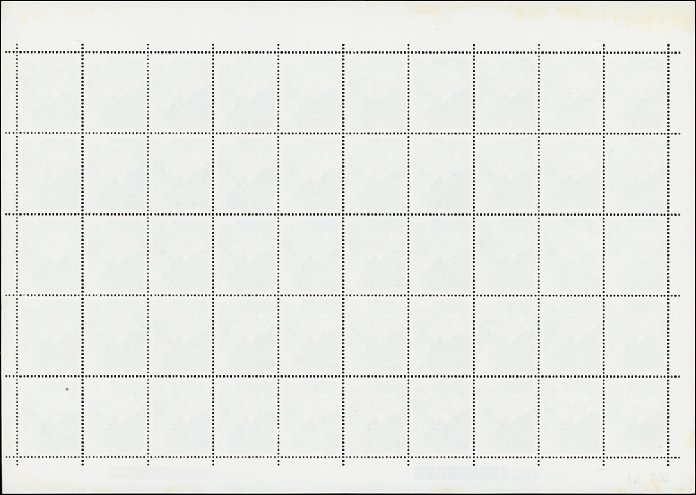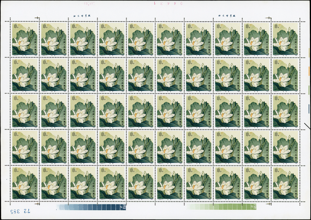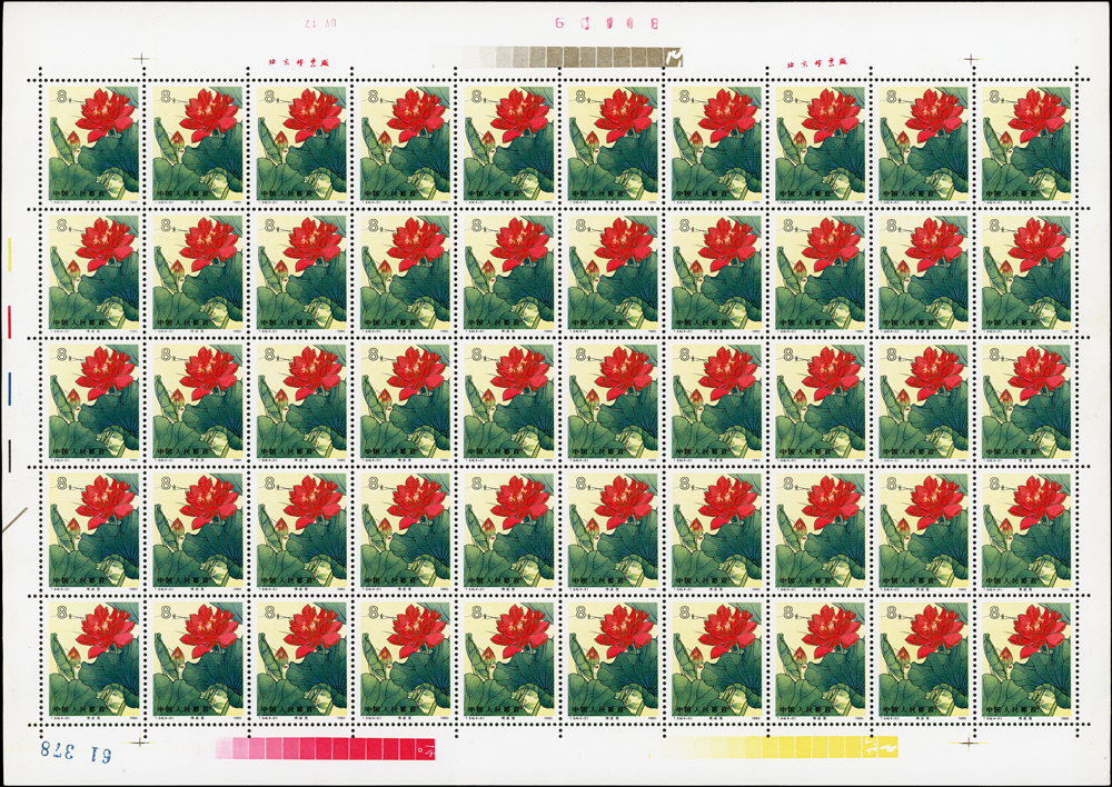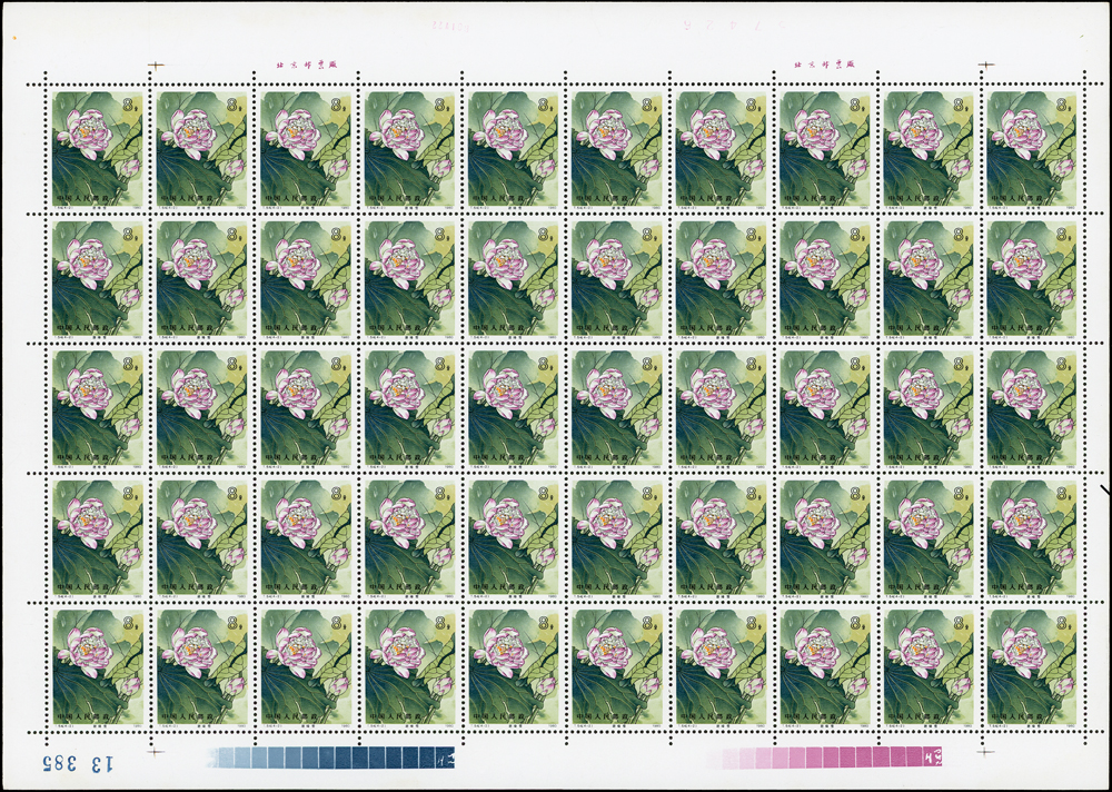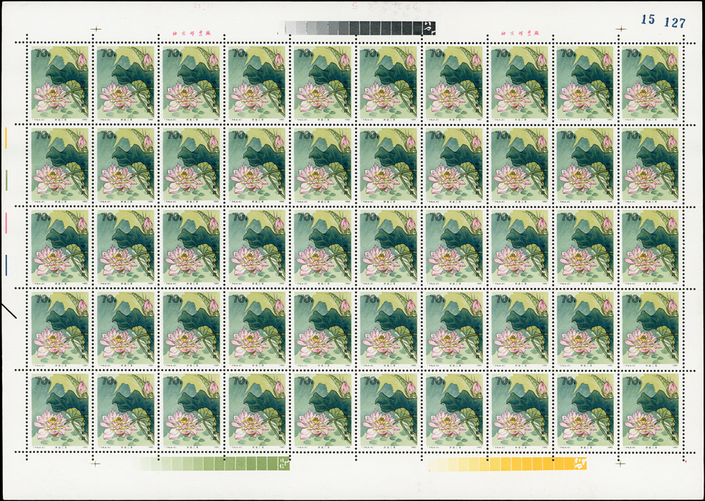 T54.荷花新票4全一全張50套,原膠折版,正面金色無氧化現象,背面上邊紙.右邊紙局部淡黃,(4-4)背面左上1個齒緣淡黃,(4-2)(4-4)背面各有1個原紙雜點,無嚴重黃斑,VF-F(Page 134)