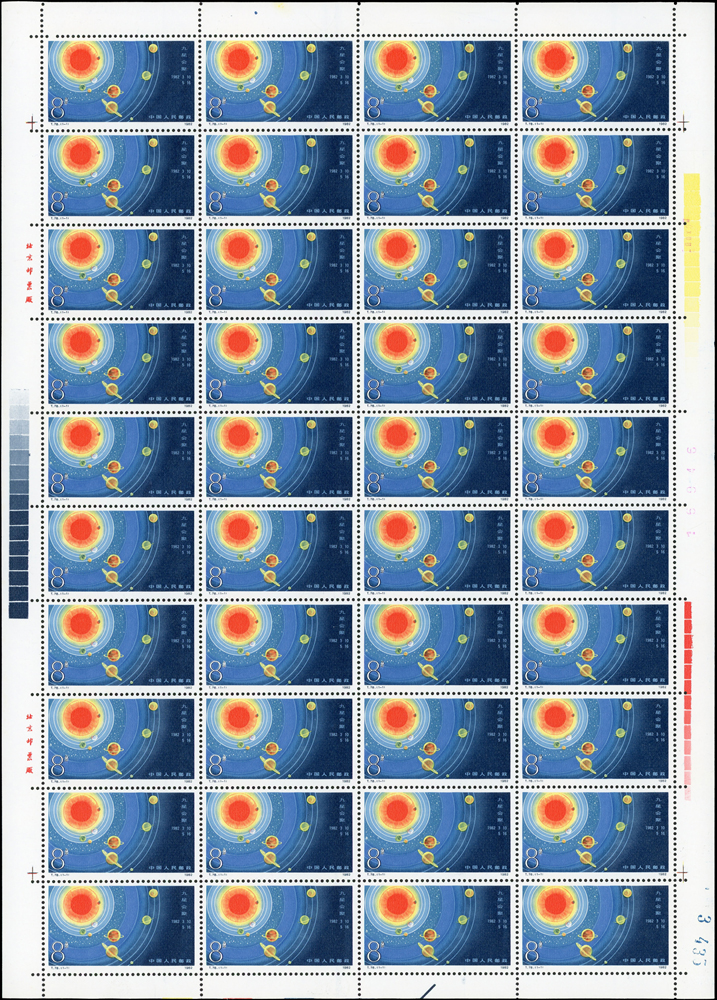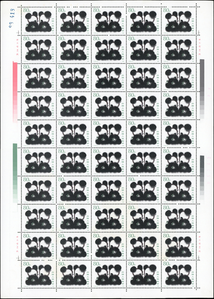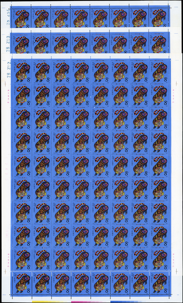 新中國T票版張5版,均為新票,包括:(1)T78.九星會聚1全1版40套,原膠挺版,VF;(2)T106.熊貓4全1版50套,原膠挺版,(4-2)(4-4)背面少許淡黃,VF-F;(3)T107.一輪虎1全3版,共240套,原膠挺版,其中2版背面少數齒淡黃,VF-F