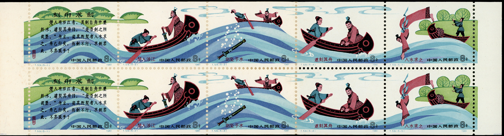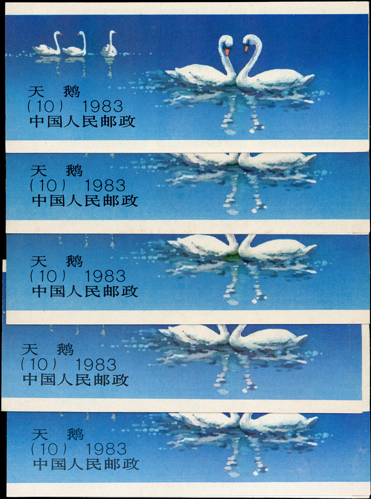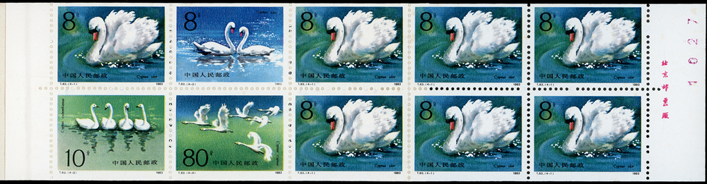 新中國小本票9本,包括:(SB4)刻舟求劍1本,內票局部黃,封面色淡微斑點F-VF;(SB9)秦始皇陵兵馬俑3本,內票少數齒緣淡黃,金色輕微氧化,VF-F;(SB10)天鵝5本,內票上紙緣極淡黃,不易看出,VF-F(Page 135)