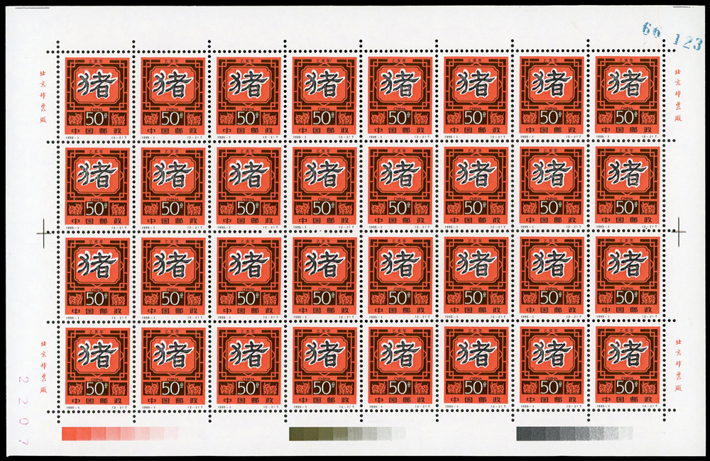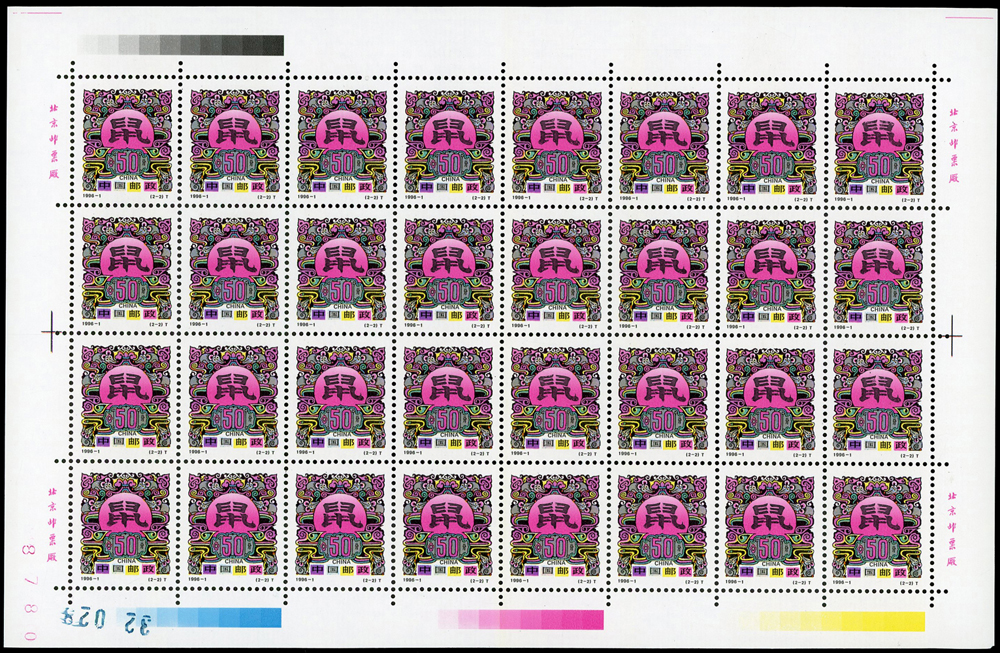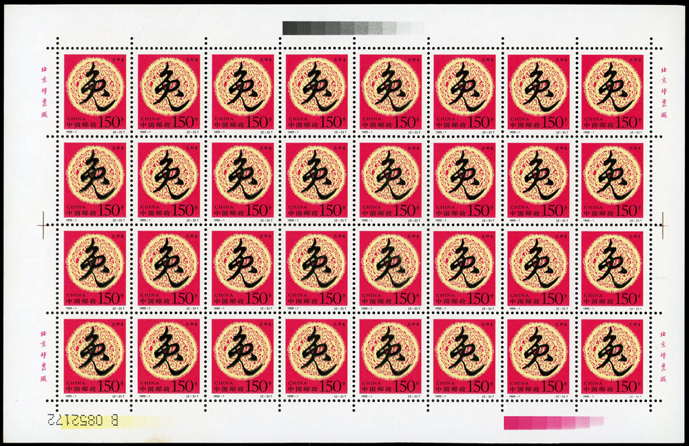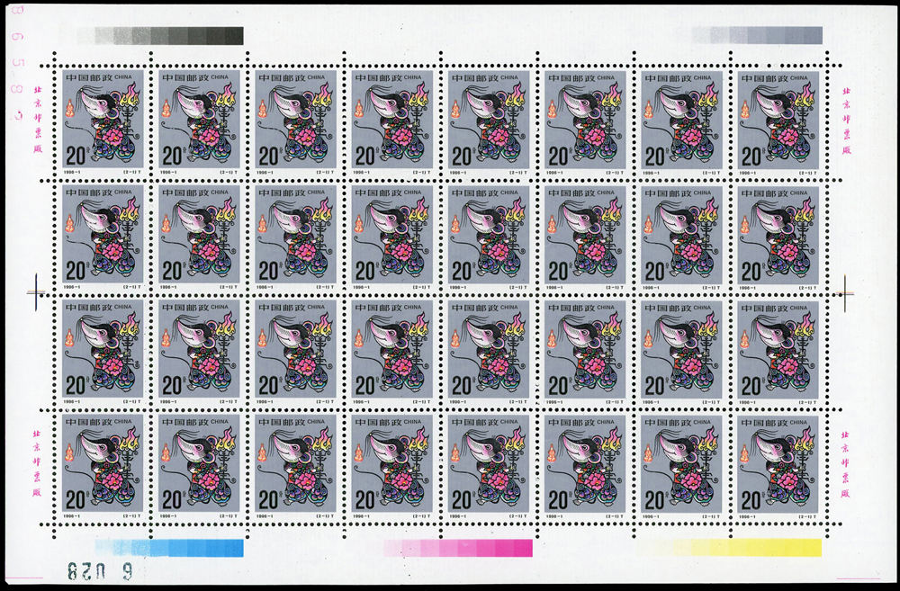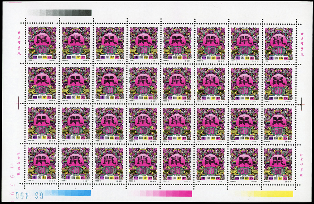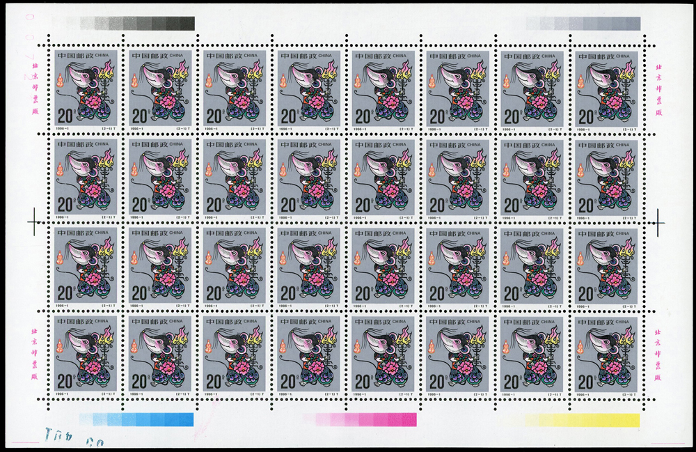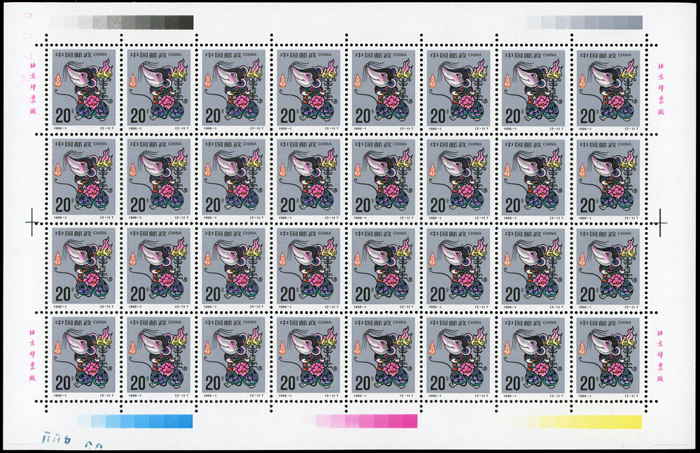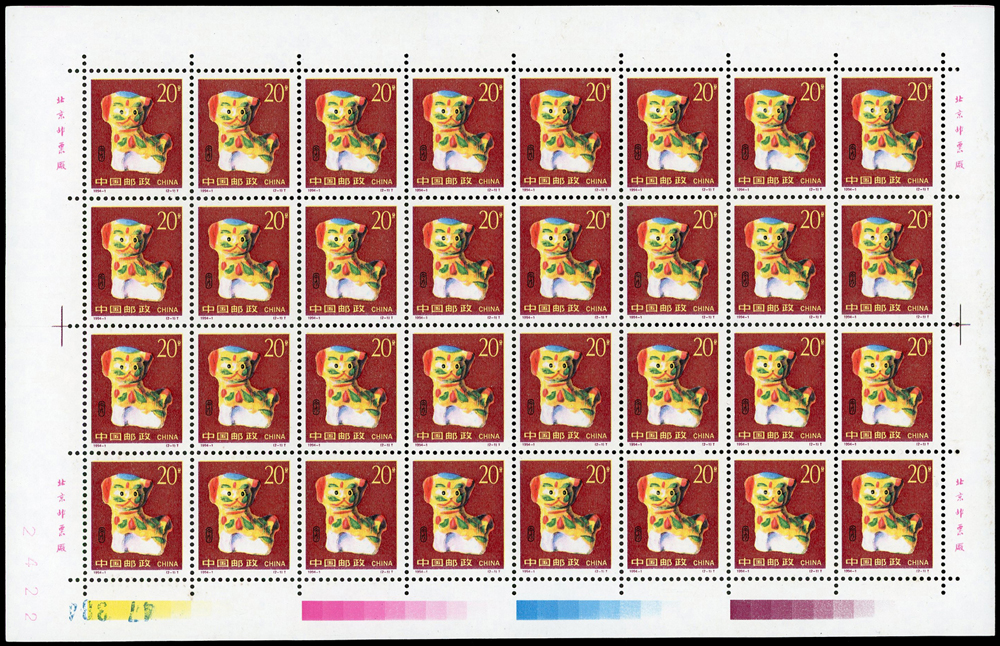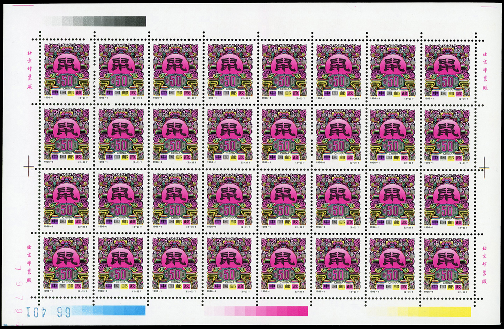 新中國十二生肖:1993-1雞年.1994-1狗年.1995-1豬年.1997-1牛年.1998-1虎年.1999-1兔年各2全1版,1996-1鼠年2全3版,均原膠挺版,其中狗年(2-2)背面上邊白1個淡黃點無損票,虎年(2-2)背面左下1個齒淡黃,兔年邊紙緣局部淡黃無損票,其餘VF(Page 136)