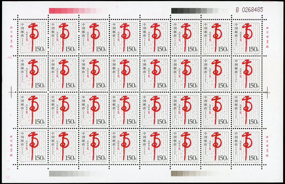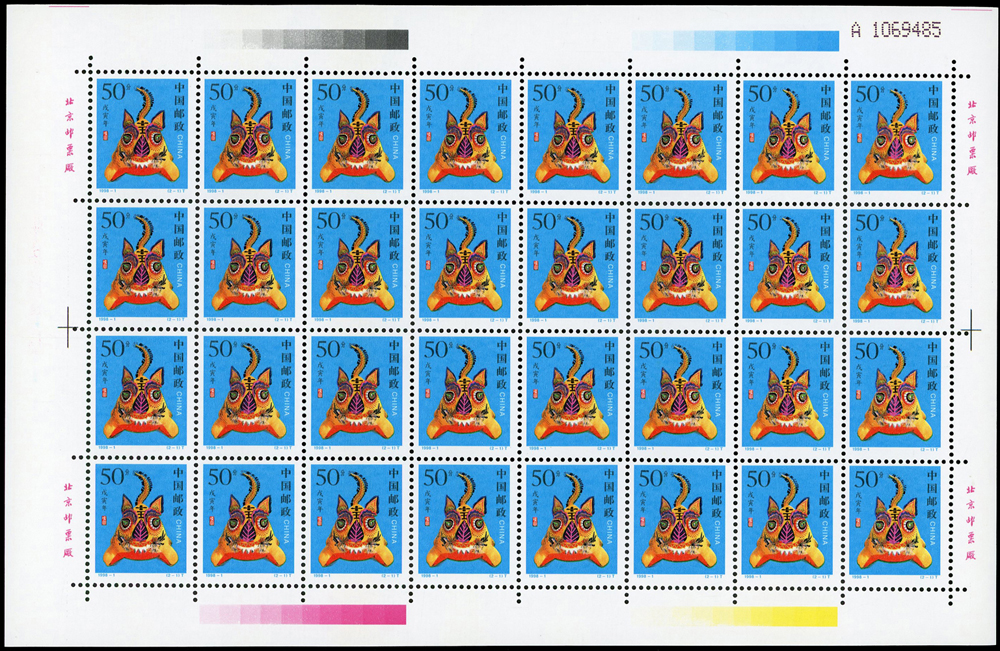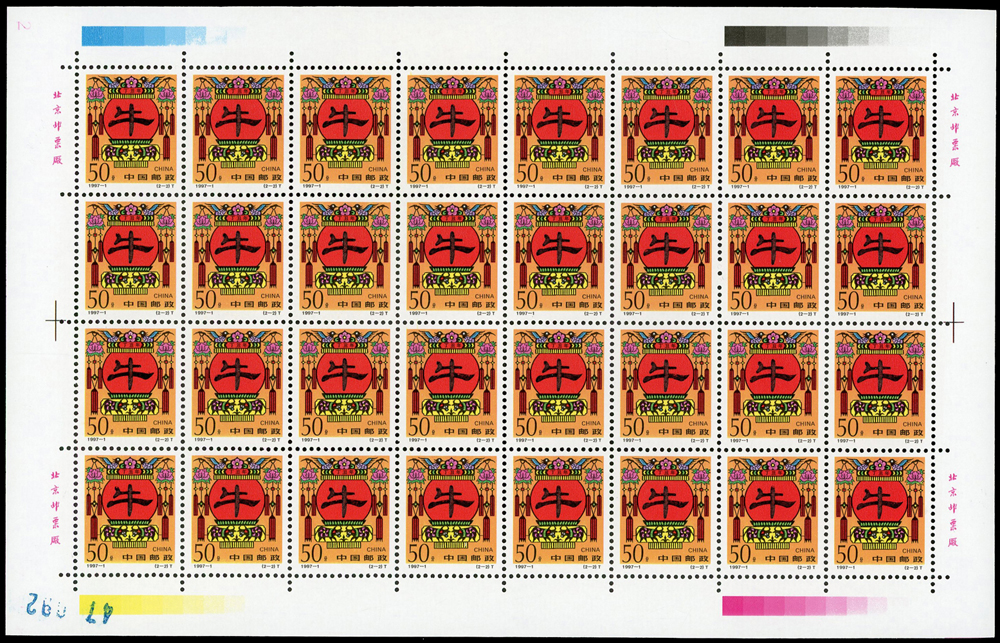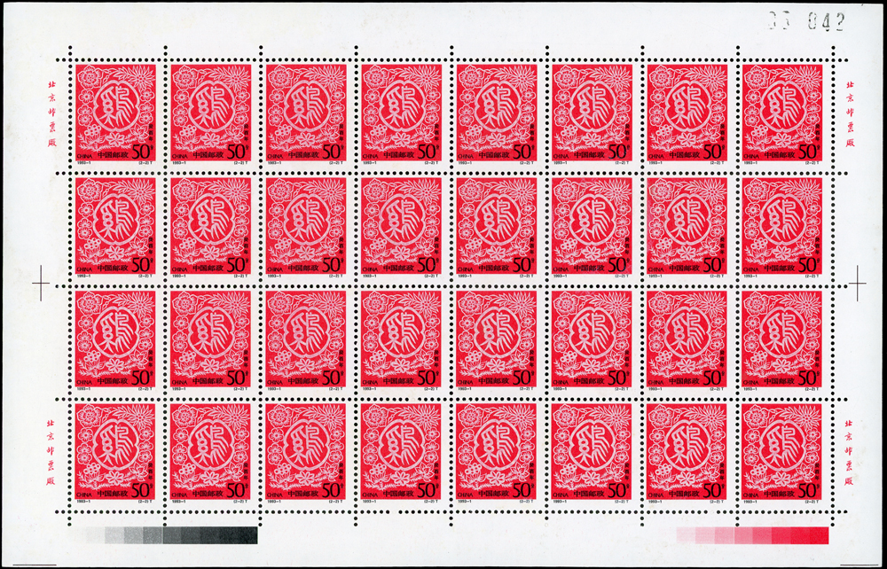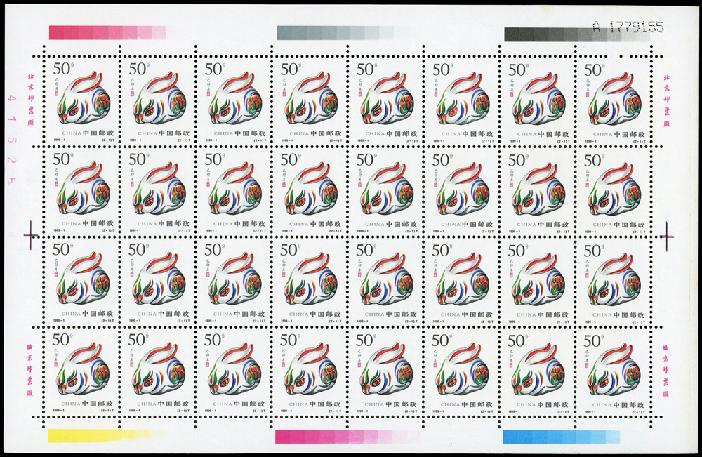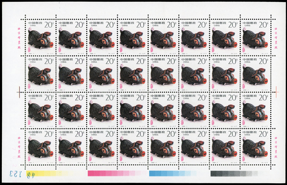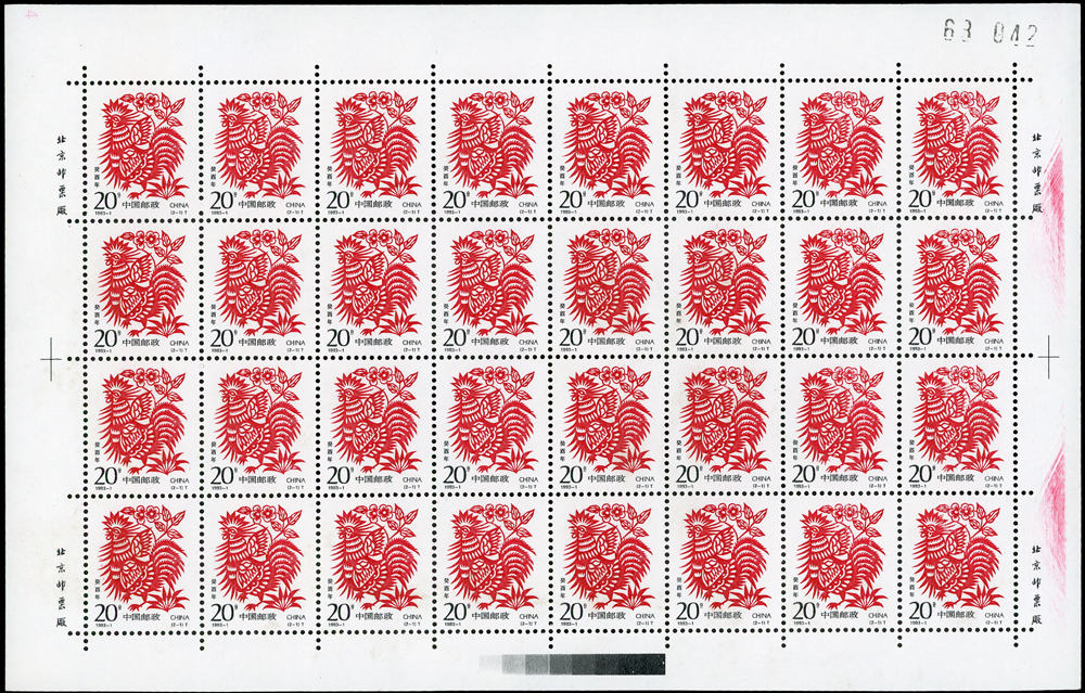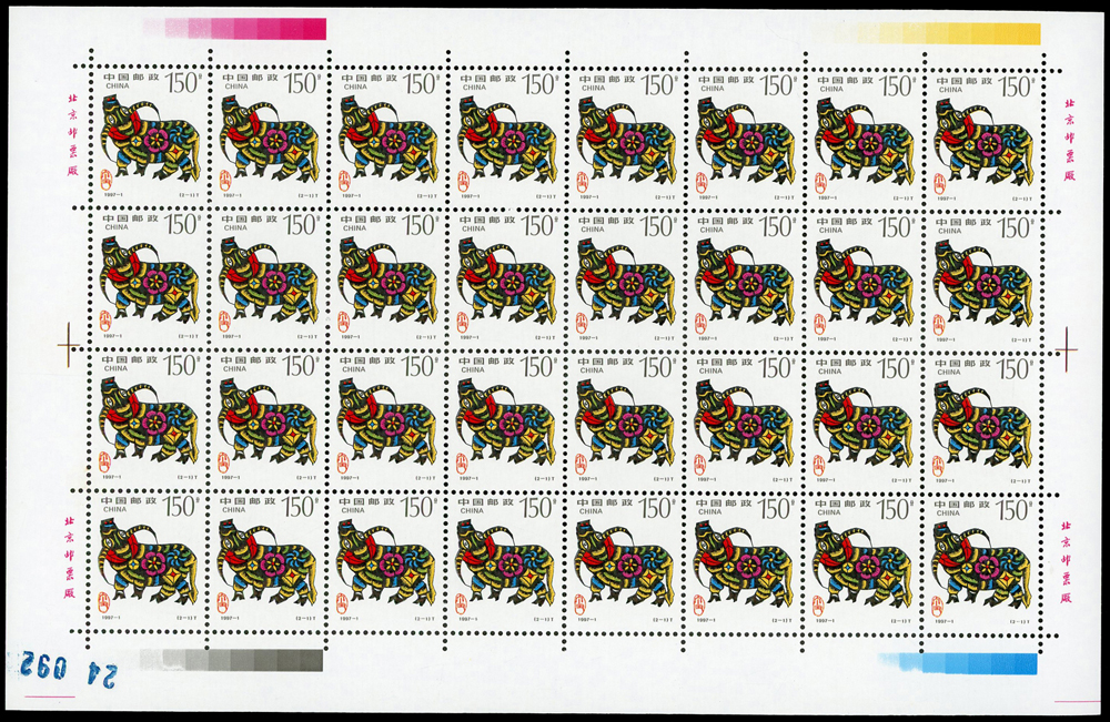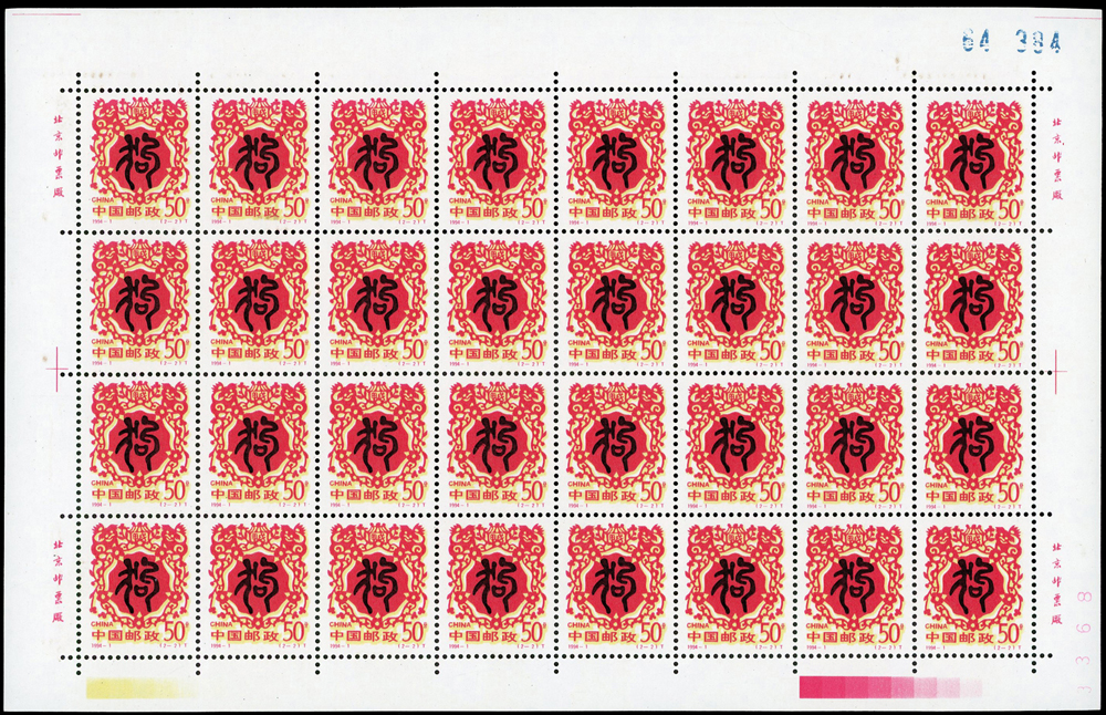新中國十二生肖:1993-1雞年.1994-1狗年.1995-1豬年.1997-1牛年.1998-1虎年.1999-1兔年各2全1版,1996-1鼠年2全3版,均原膠挺版,其中狗年(2-2)背面上邊白1個淡黃點無損票,虎年(2-2)背面左下1個齒淡黃,兔年邊紙緣局部淡黃無損票,其餘VF(Page 136)