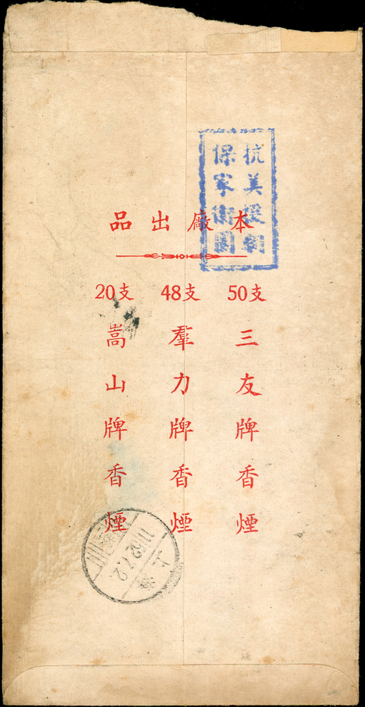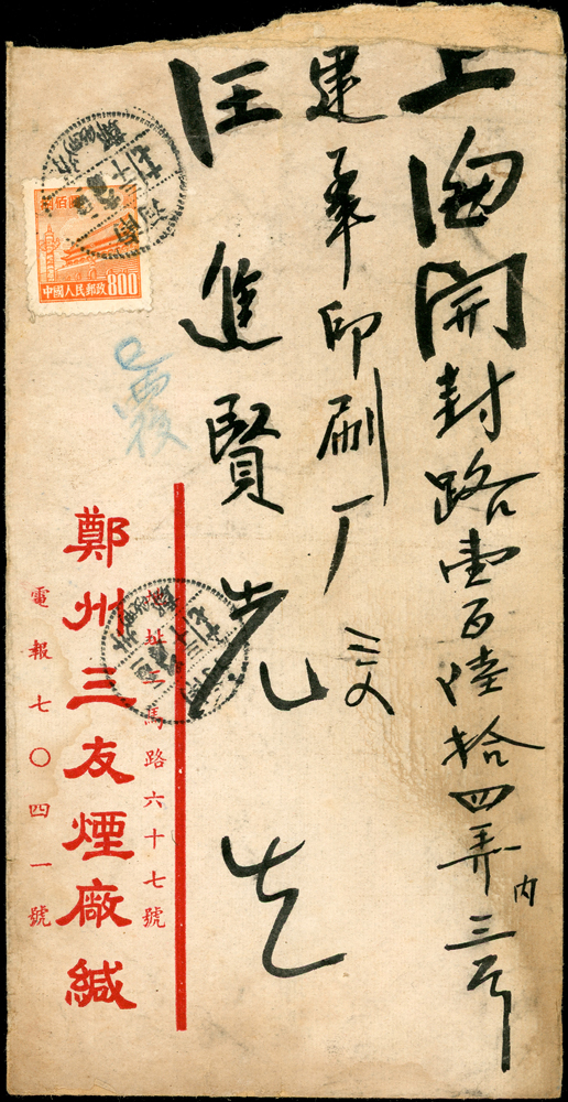 信封分類 大清郵政 1911年以前清代~國家郵政史(1082-1112)清代~商埠郵政史(1156-1158)在華客郵郵史(1168-1188)中華民國郵政 1912~1949年民國~郵政史(1424-1537)民國~名人封(1538-1547)民國~防盜(1548-1559)民國~首航封(1560-1570)民國~欠資封(1571-1574)民國~檢查封(1575-1599)民國~行動郵局/信櫃(1600-1613)兩岸通郵史(1933年-1989年)(1614-1632)民國~郵政匯兌(1633-1644)民國~民信局/僑批(1645-1651)民國~郵政明信片(1652-1659)民國~風景明信片(1660-1683)民國~國內及國際航空郵簡(1684-1703)日偽政權~郵政史(1714-1723)台灣 1888~2020年台灣~整批/整冊信封(3554-3583)日治時期~台灣郵史1895~1945(3601-3661)日治時期~台灣明信片(3662-3688)日治時期~台灣風景片(3689-3695)台灣老台幣時期~國父像火炬圖『限臺灣省用』明信片(3738-3739)台灣~老台幣時期郵政史1945~1949(3740-3815)台灣~自動化實寄封(4646-4647)台灣~新台幣時期郵政史(6001-6041)大陳島(6042)台灣~代辦所/欠資/首航(6043-6055)台灣~郵政匯兌(6056-6073)台灣~首日封(6074-6090)台灣~郵資封/郵政明信片(6091-6100)台灣~原圖卡(6101-6113)台灣~國內及國際航空郵簡(6114-6122)中國人民郵政 1949~2018年新中國~解放區郵史(6128-6140)新中國~郵政史(6277-6289)新中國~郵政匯兌/郵資封片(6290-6304)中國香港~郵政史(6314-6316)世界各國郵票日本郵政史(6327-6334)外國信封(A~Z)(6350-6365) 大清郵政 1911年以前 ↳清代~國家郵政史(1082-1112) ↳清代~商埠郵政史(1156-1158) ↳在華客郵郵史(1168-1188)中華民國郵政 1912~1949年 ↳民國~郵政史(1424-1537) ↳民國~名人封(1538-1547) ↳民國~防盜(1548-1559) ↳民國~首航封(1560-1570) ↳民國~欠資封(1571-1574) ↳民國~檢查封(1575-1599) ↳民國~行動郵局/信櫃(1600-1613) ↳兩岸通郵史(1933年-1989年)(1614-1632) ↳民國~郵政匯兌(1633-1644) ↳民國~民信局/僑批(1645-1651) ↳民國~郵政明信片(1652-1659) ↳民國~風景明信片(1660-1683) ↳民國~國內及國際航空郵簡(1684-1703) ↳日偽政權~郵政史(1714-1723)台灣 1888~2020年 ↳台灣~整批/整冊信封(3554-3583) ↳日治時期~台灣郵史1895~1945(3601-3661) ↳日治時期~台灣明信片(3662-3688) ↳日治時期~台灣風景片(3689-3695) ↳台灣老台幣時期~國父像火炬圖『限臺灣省用』明信片(3738-3739) ↳台灣~老台幣時期郵政史1945~1949(3740-3815) ↳台灣~自動化實寄封(4646-4647) ↳台灣~新台幣時期郵政史(6001-6041) ↳大陳島(6042) ↳台灣~代辦所/欠資/首航(6043-6055) ↳台灣~郵政匯兌(6056-6073) ↳台灣~首日封(6074-6090) ↳台灣~郵資封/郵政明信片(6091-6100) ↳台灣~原圖卡(6101-6113) ↳台灣~國內及國際航空郵簡(6114-6122)中國人民郵政 1949~2018年 ↳新中國~解放區郵史(6128-6140) ↳新中國~郵政史(6277-6289) ↳新中國~郵政匯兌/郵資封片(6290-6304) ↳中國香港~郵政史(6314-6316)世界各國郵票 ↳日本郵政史(6327-6334) ↳外國信封(A~Z)(6350-6365) 點大圖放大展示,點小圖切換 1952年中式封貼天安門圖案(四)800元1枚,銷河南鄭州1952.6.30戳寄上海,背面銷上海(投二)52.7.2到戳,旁蓋『抗美援朝 保家衛國』宣傳章;林茂興舊藏(Page 137) 結標時間 2025-12-16 11:32:40 拍品編號:6279 起拍價:NT$100 當前價:NT$100 自動出價 直接出價 出價 系統將按出價級數,依序為您比(出)價至上限金額 提醒您:直接出價後不可將金額改低,只能改高,蟠龍無法降低您的出價,最高出價者無法取消出價 (查看出價說明) 得標說明:需按得標價另加10%佣金 當前加價幅度:NT$0元 (查看加價級數表) 回上頁 線上出價記錄 線上 0 人次,書面 0 人次 競價客戶 所在地 出價時間 出價金額 出價方式 問與答 目前尚無提問 我要提問 請先登入會員