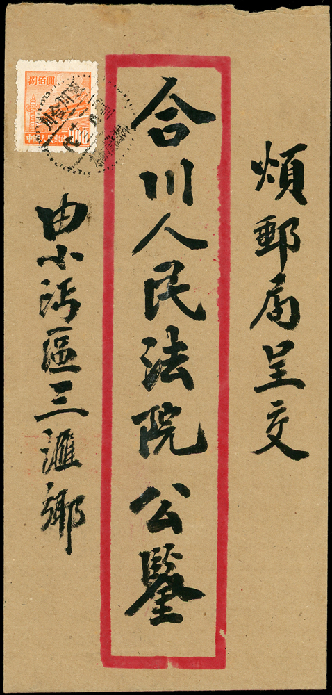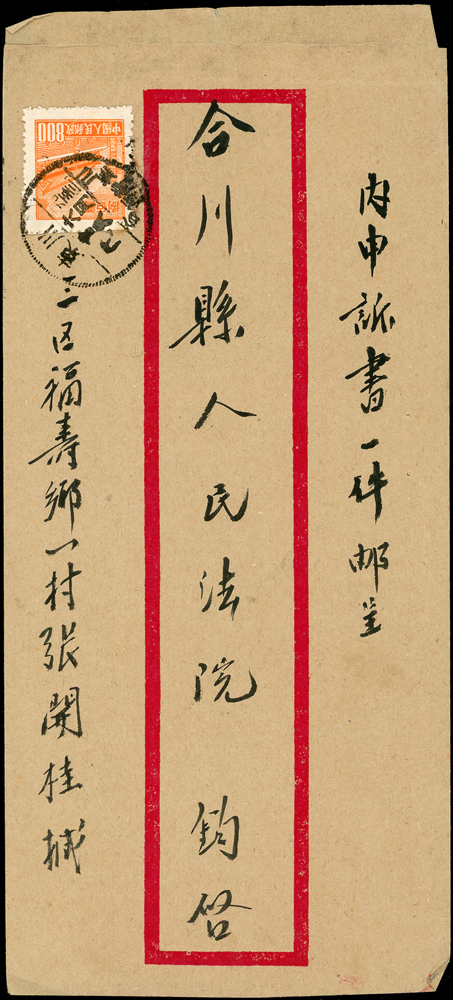實寄封二封:(1)1953年中式封貼天安門圖案(四)800元1枚,銷東川合川1953.6.28戳寄本埠;(2)1953年中式封貼天安門圖案(四)800元1枚,銷東川合川/1953.1.13/獅灘橋寄本埠;林茂興舊藏(Page 137)