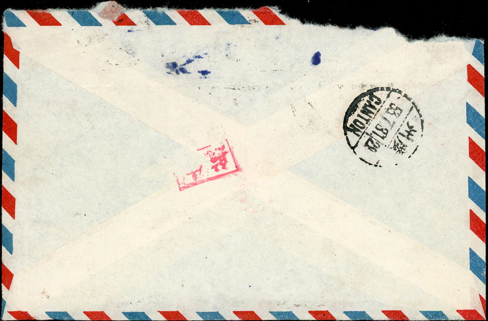 1953年天津寄英國航空西式封,貼天安門圖案(四)3000元3枚,不同圖案普通票200元.2000元各1枚,銷天津1953.7.28中英戳,經廣州1953.7.31;林茂興舊藏(Page 138)