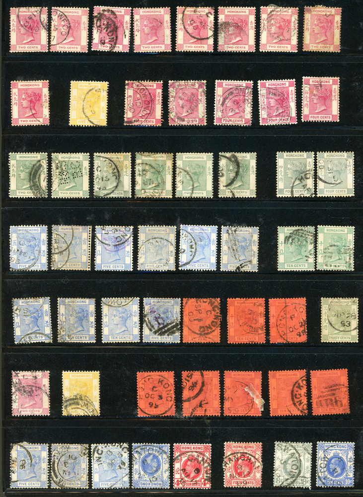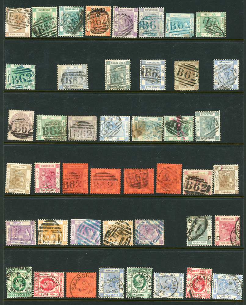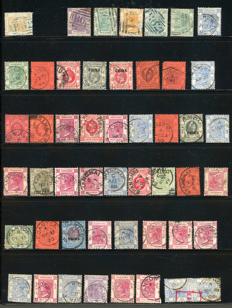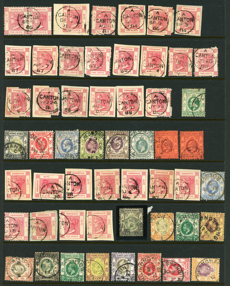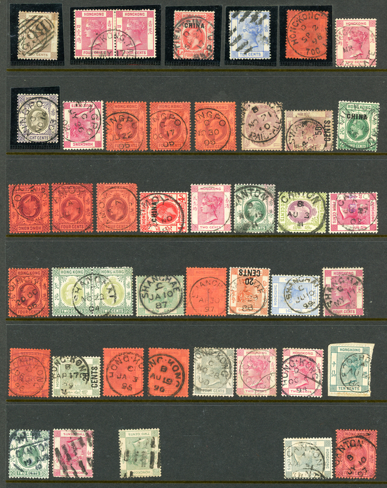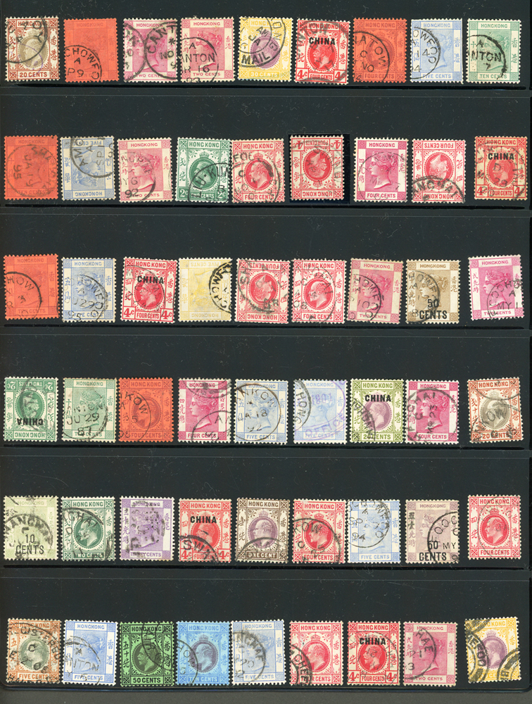英國客郵及香港早期郵票新舊混合一冊,含新票165枚,舊票680枚,樣票1枚,整理整齊於冊中,包括有:維多利亞女皇及其改值.喬治五世及其改值.喬治六世.伊麗莎白女皇等,地名見有廣州,上海,寧波,天津,汕頭,福州,漢口等地客郵戳,,品像混合,VF-F;歡迎至官網瀏覽全貌(Page 139)