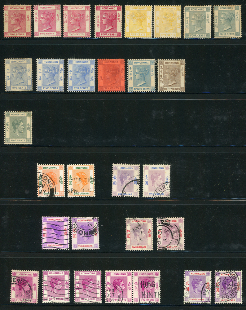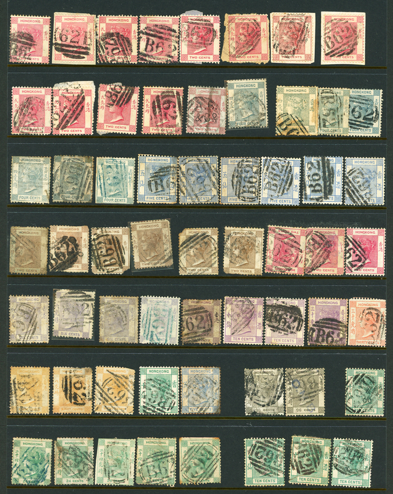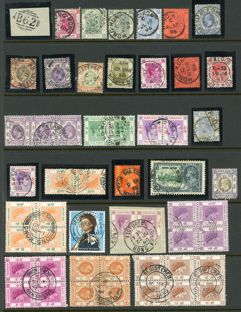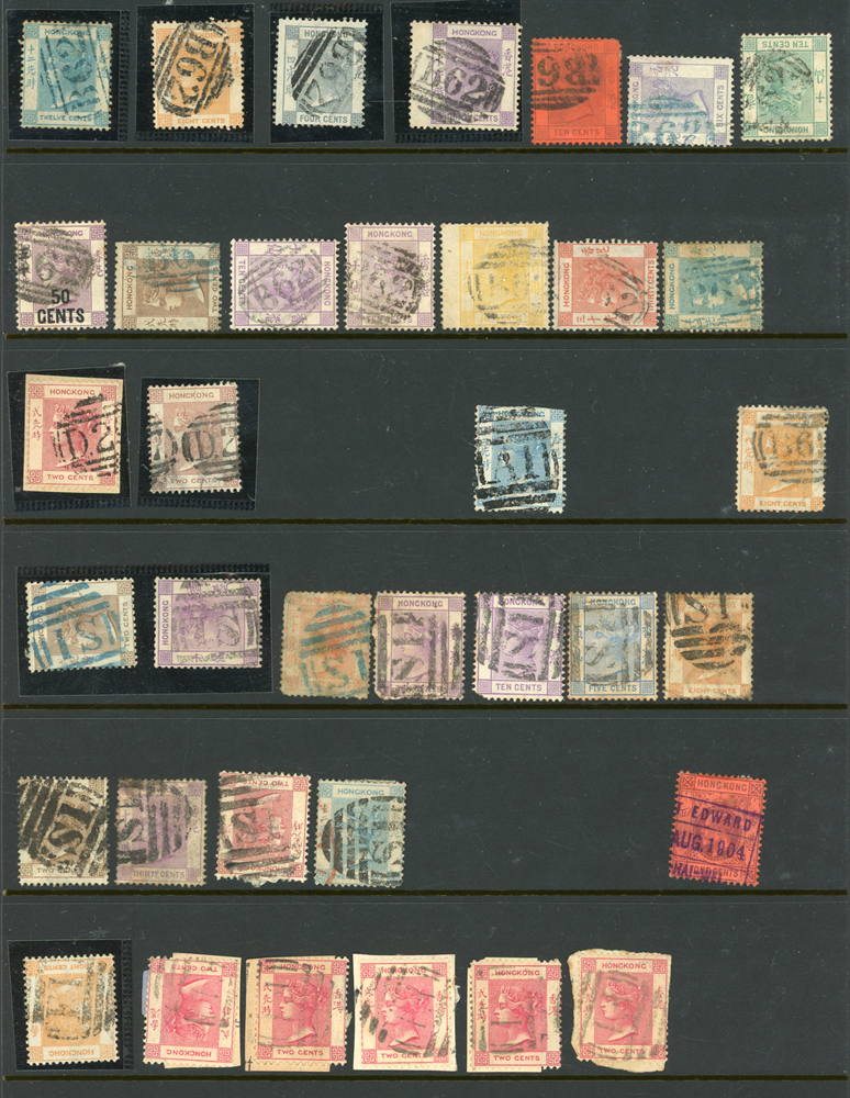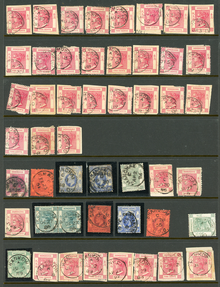 英國客郵及香港早期郵票新舊混合一冊,含新票165枚,舊票680枚,樣票1枚,整理整齊於冊中,包括有:維多利亞女皇及其改值.喬治五世及其改值.喬治六世.伊麗莎白女皇等,地名見有廣州,上海,寧波,天津,汕頭,福州,漢口等地客郵戳,,品像混合,VF-F;歡迎至官網瀏覽全貌(Page 139)