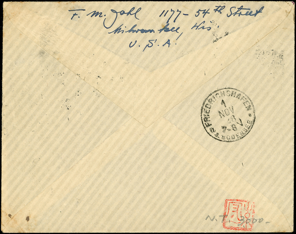 1928年齊柏林飛船從美國至德國首航封,貼美國票6枚,銷MILWAUKEE OCT.27.1928,背銷德國1.NOV.28到戳,正面另銷柏林飛船首航紀念章;林茂興舊藏(Page 141)