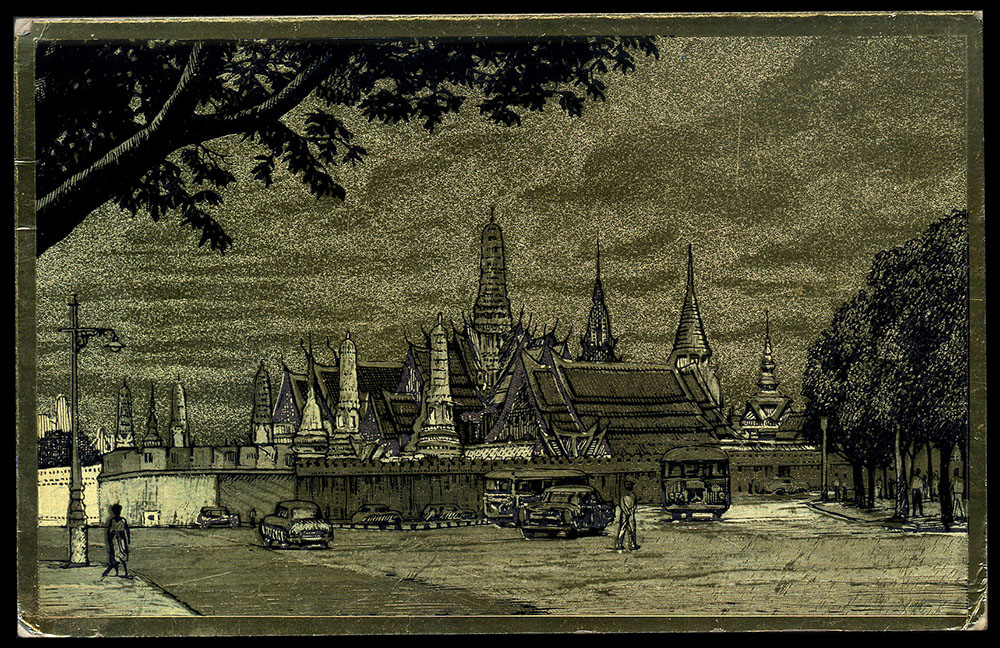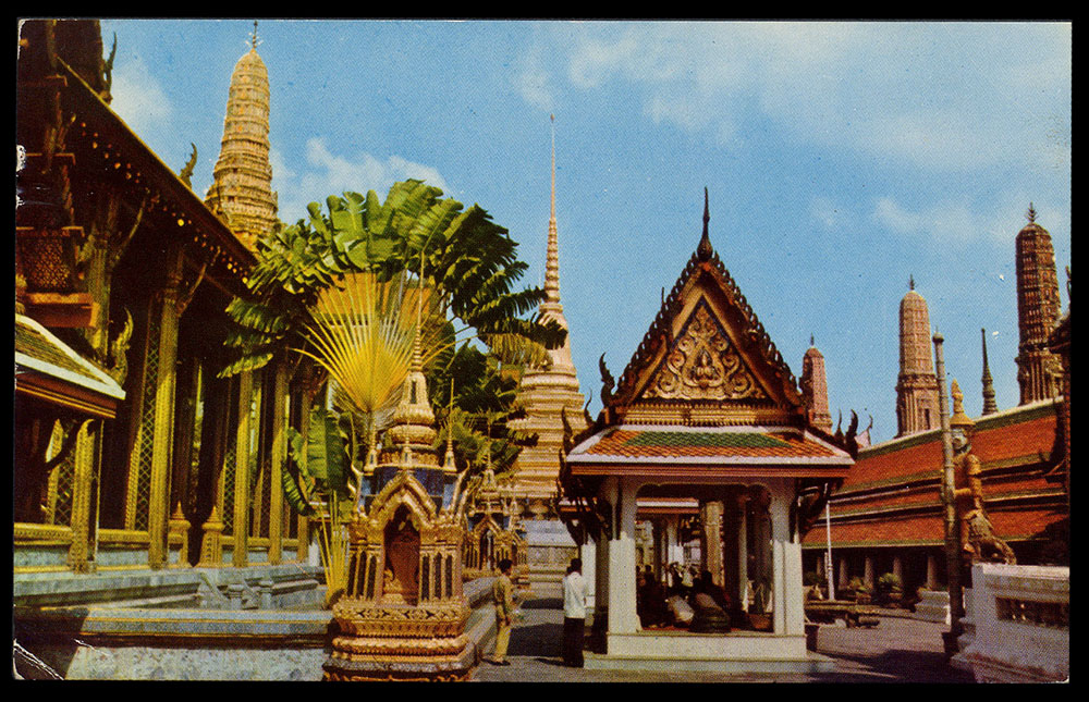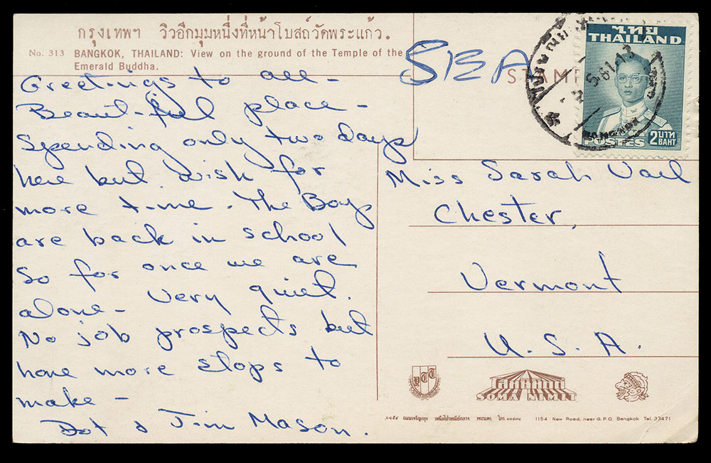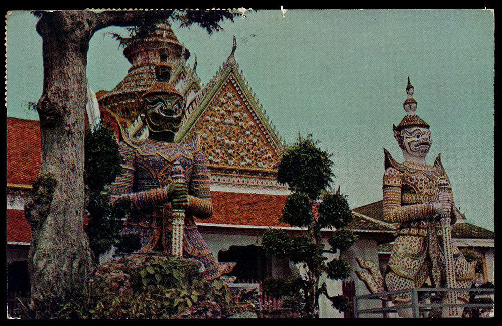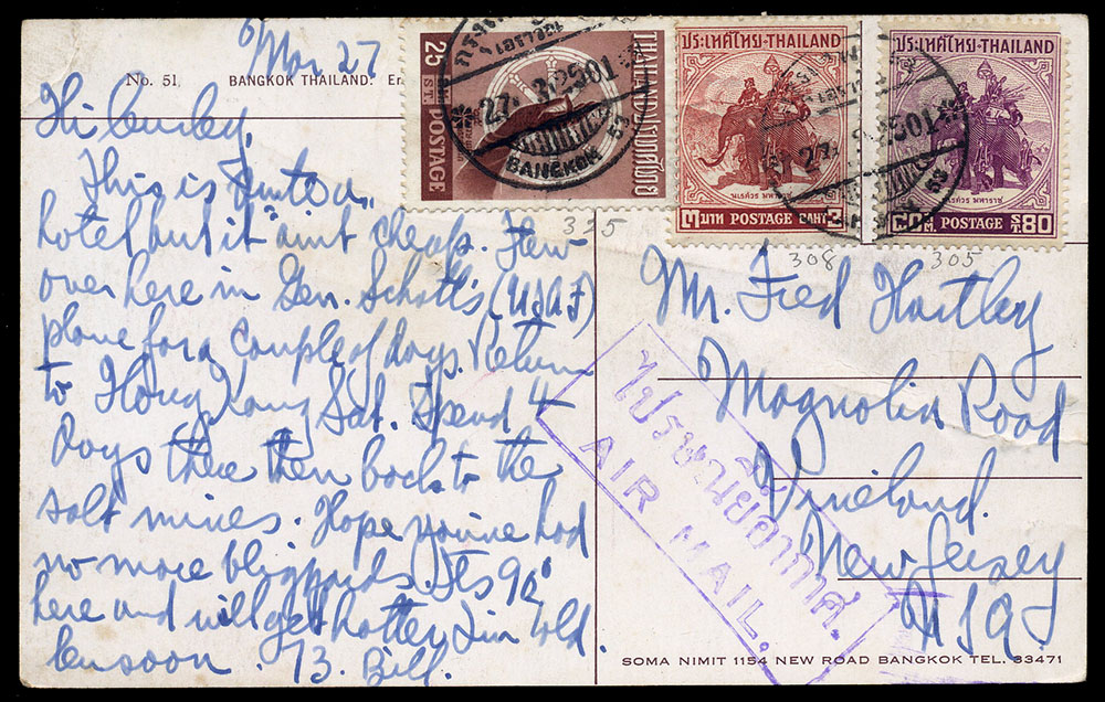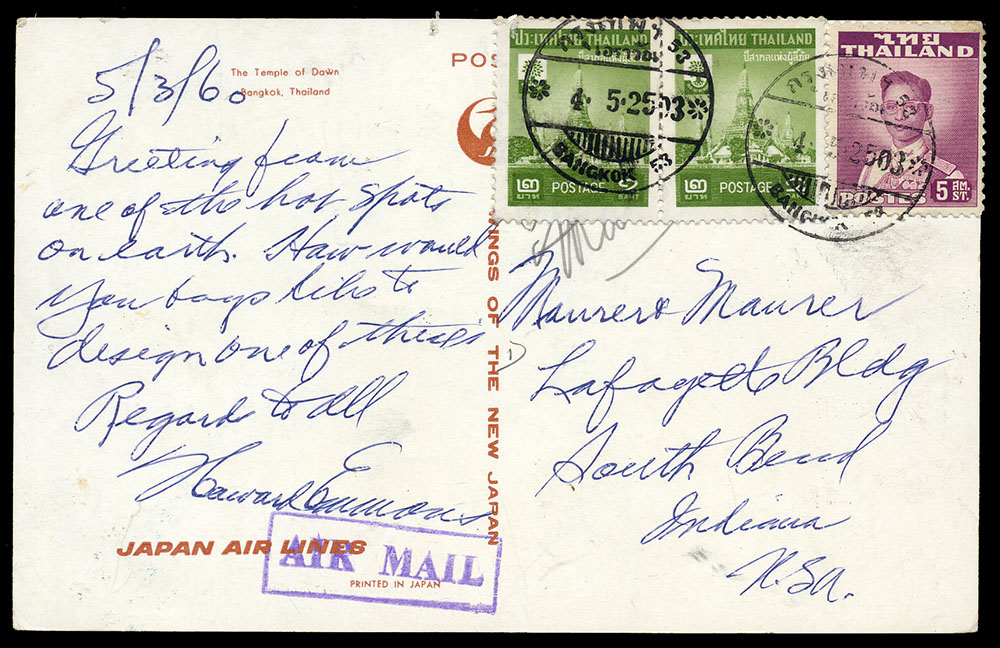 實寄片4片:(1)早期泰國寄沙烏地阿拉伯(金箔圖案)明信片一件,年份不清,貼票二枚;(2)早期泰國寄美國彩色風景明信片一件,年份不清,貼票一枚;(3)1958年泰國寄美國(四面佛)明信片一件,貼票三枚;(4)1960年泰國寄美國(寺廟圖)風景明信片一件,貼票三枚