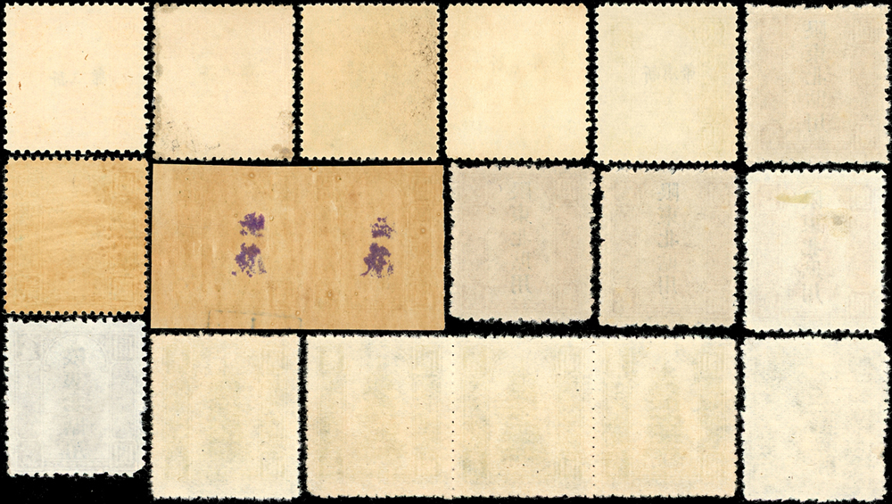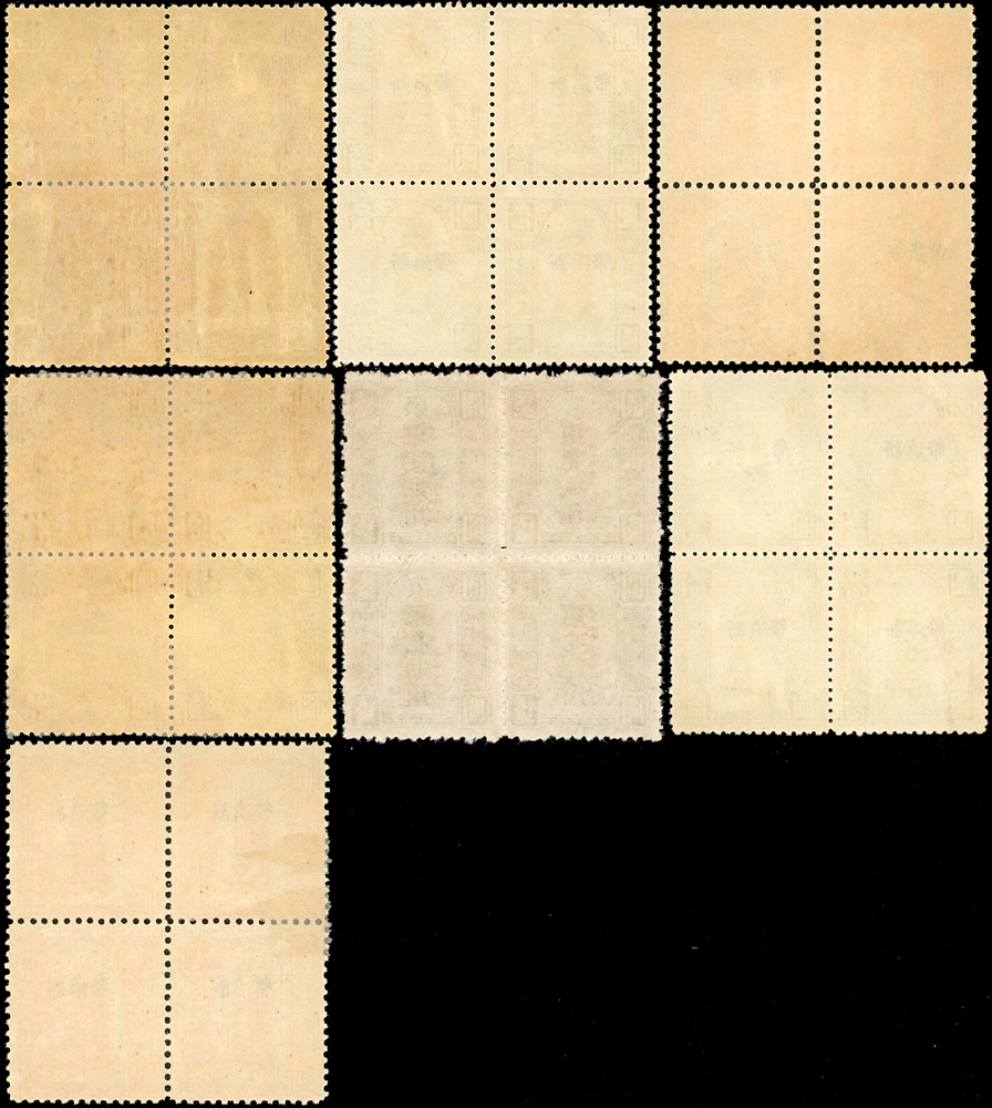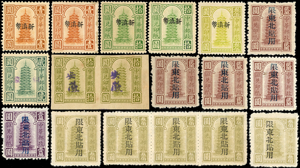 匯兌印紙新票一組共46枚,含:(1)加蓋『新滇幣』1元10枚,10元10枚,300元9枚,含4方連6件共30枚;(2)加蓋『限東北貼用』300元5枚,1萬元1枚,2萬元8枚;(3)加蓋『蒙疆』2元1枚;(4)加蓋『安徽』10元橫雙連無齒一件;VF-F(Page 143)