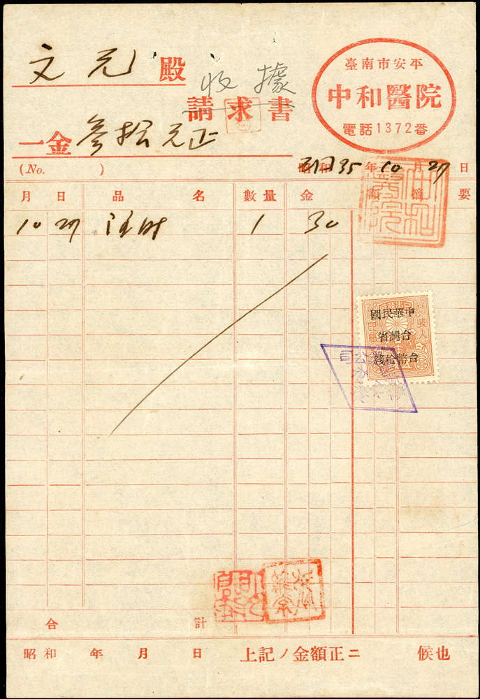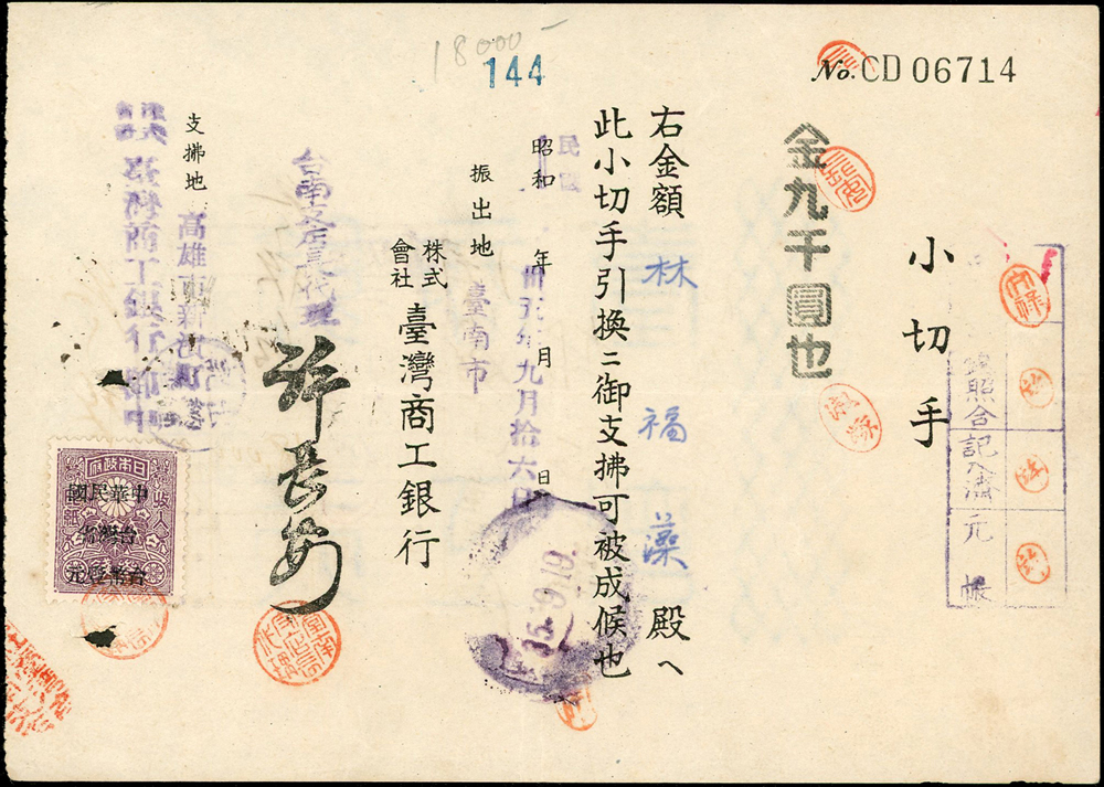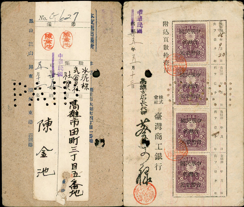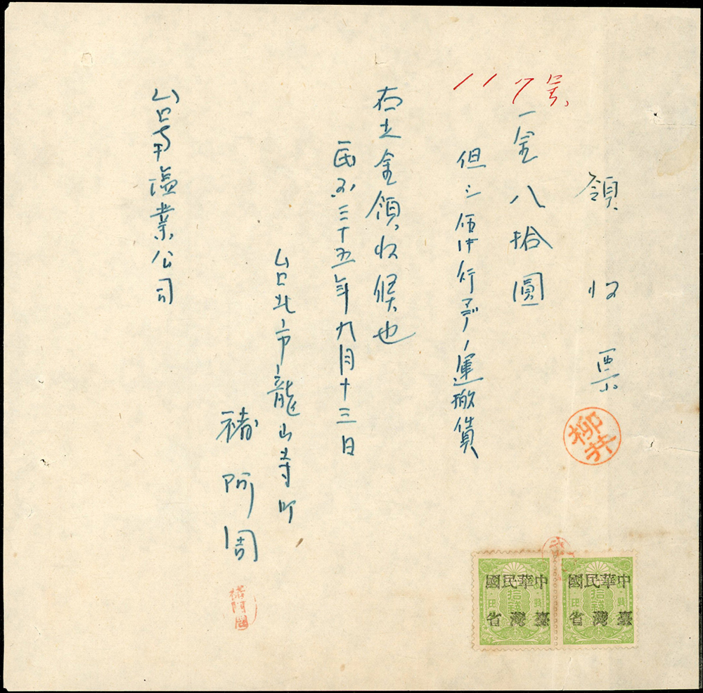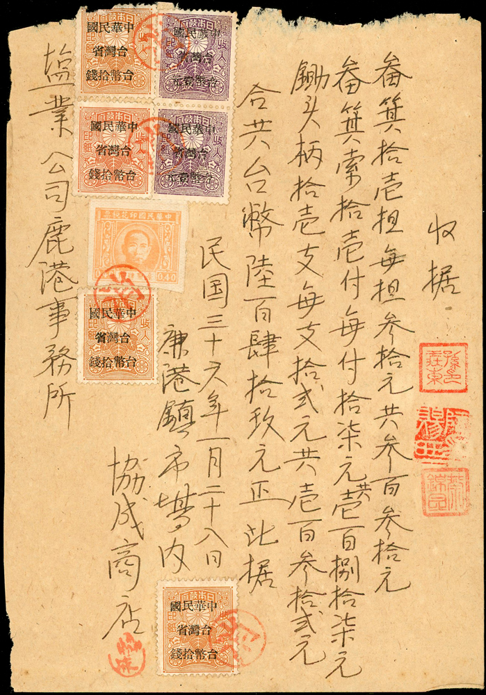 1946~1947年臺灣早期單據文獻9件,包括:(1)小切手(16.9*12cm)2件,(2)南投鎮魚市場代行契約書1件,(3)南投土地贌耕契約書1件,(4)台南安平中和醫院收據1件,(5)鹿港協成商店收據1件,(6)臺南鹽業公司搬運工資領收票1件,(7)臺灣商工銀行高雄分行存摺1本,(8)臺南驛前南郡運送株式會社運賃計算書1件,均已使用,皆貼有日本收入印紙加蓋中華民國台灣省稅票銷印,75-80新
