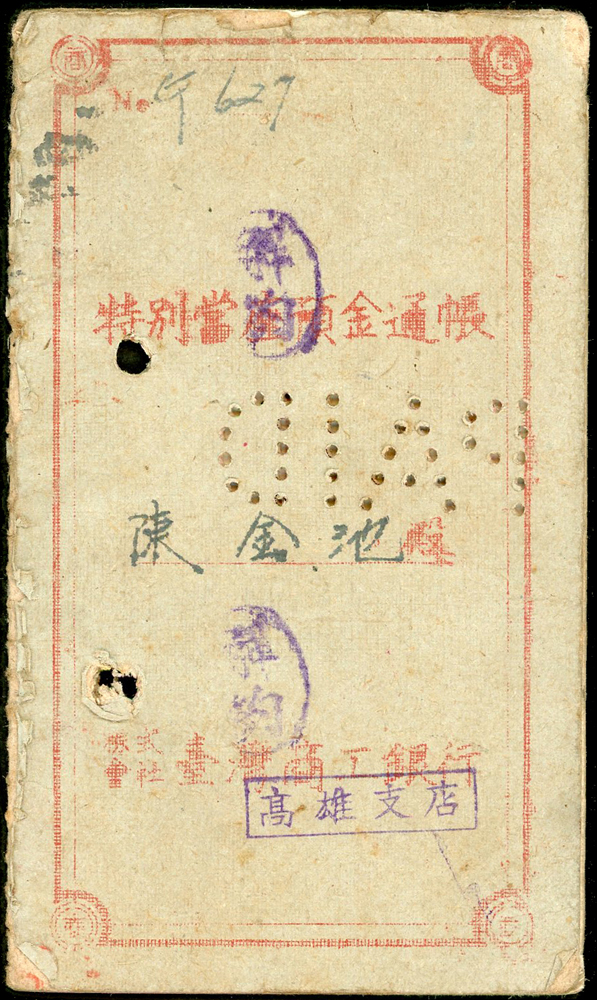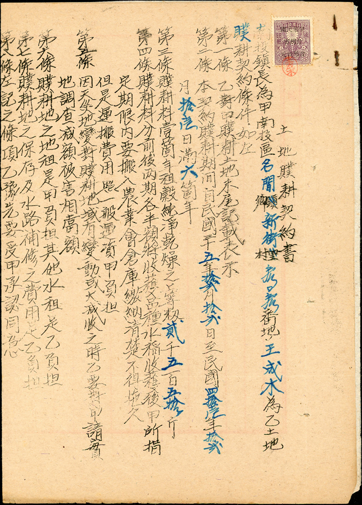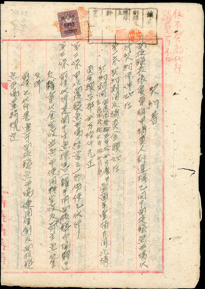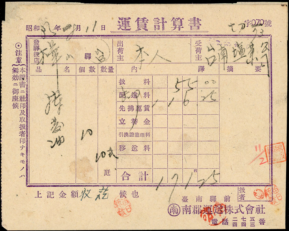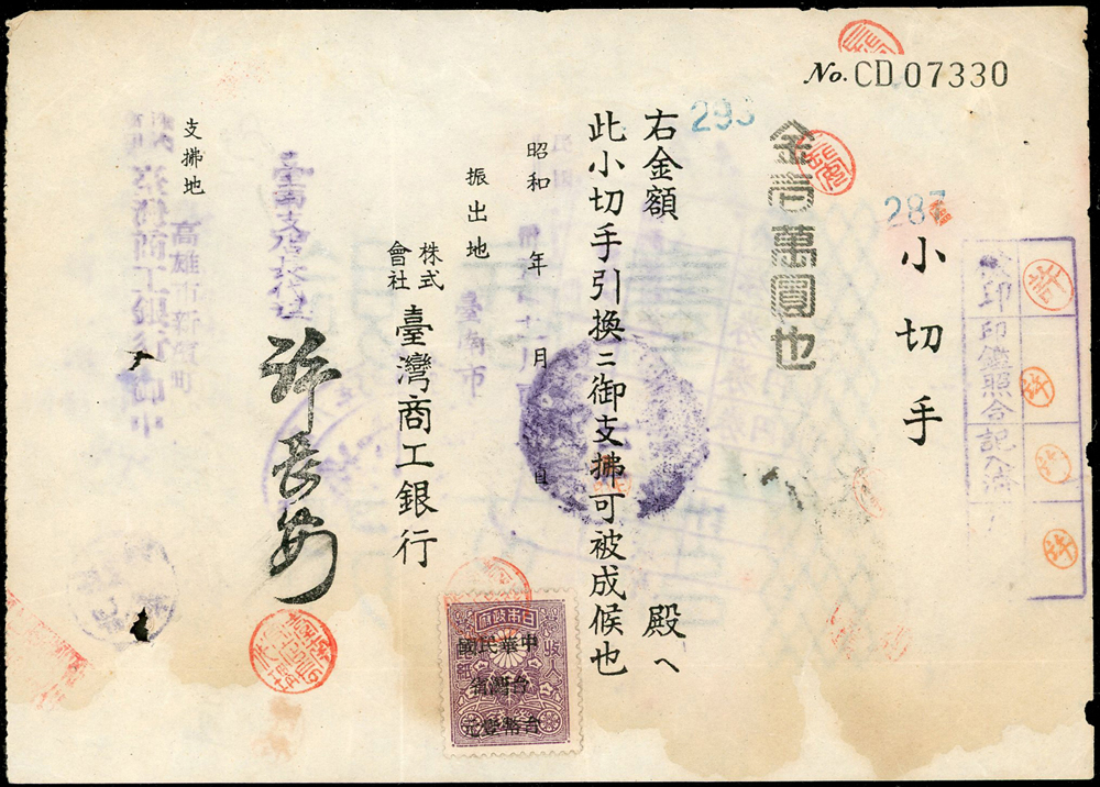 1946~1947年臺灣早期單據文獻9件,包括:(1)小切手(16.9*12cm)2件,(2)南投鎮魚市場代行契約書1件,(3)南投土地贌耕契約書1件,(4)台南安平中和醫院收據1件,(5)鹿港協成商店收據1件,(6)臺南鹽業公司搬運工資領收票1件,(7)臺灣商工銀行高雄分行存摺1本,(8)臺南驛前南郡運送株式會社運賃計算書1件,均已使用,皆貼有日本收入印紙加蓋中華民國台灣省稅票銷印,75-80新
