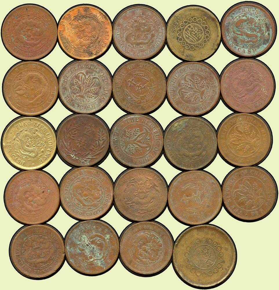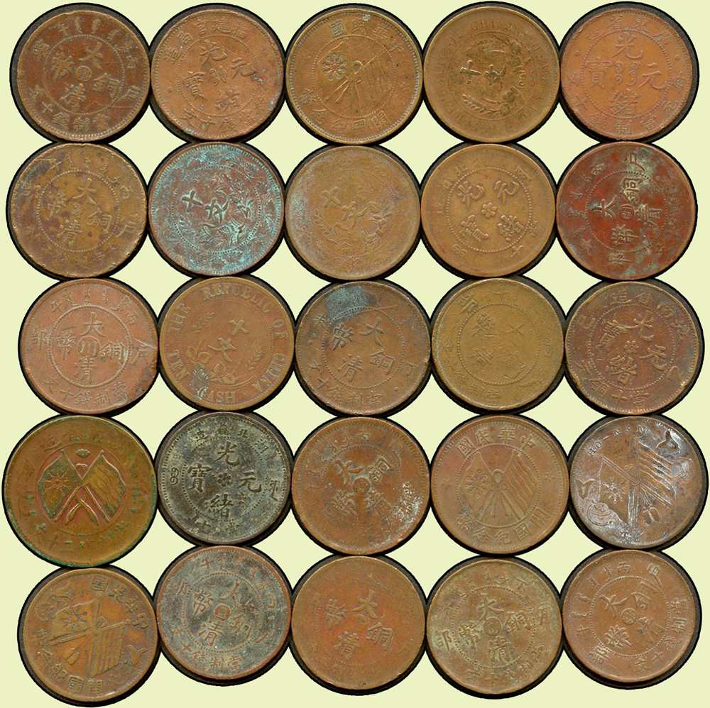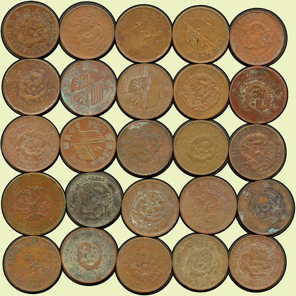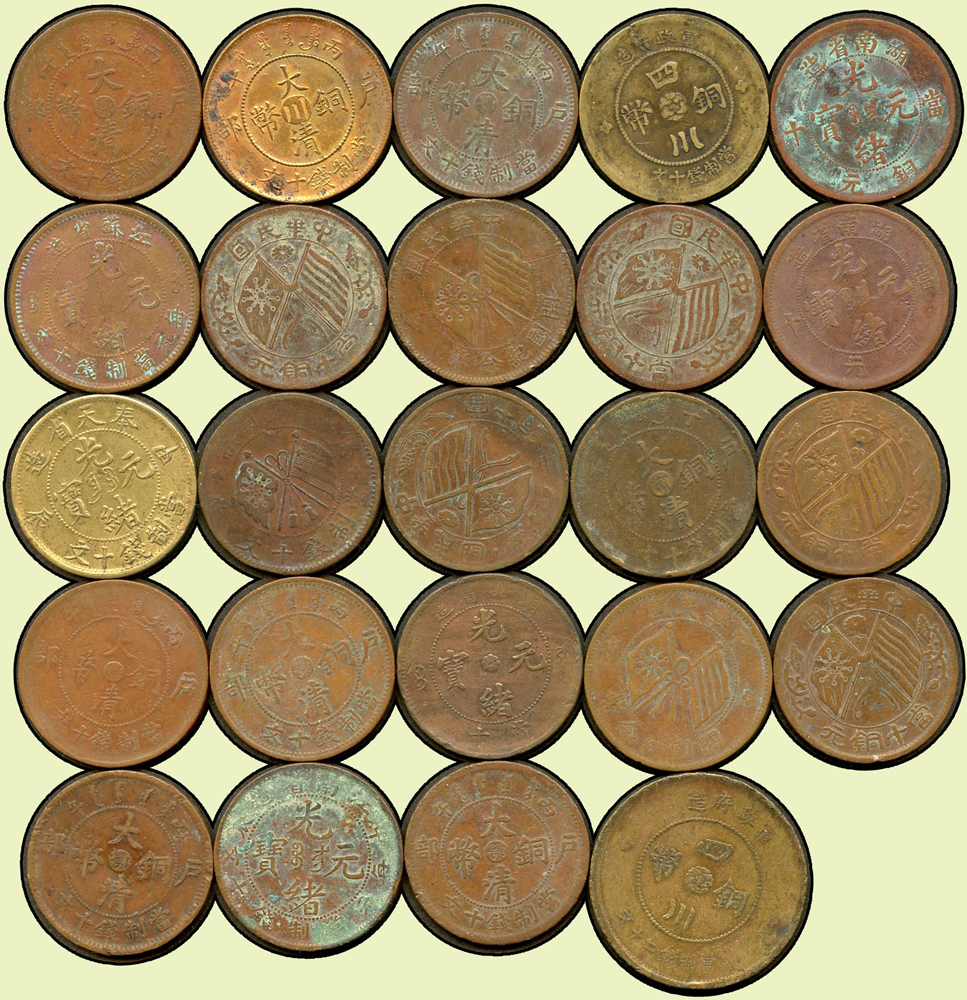 早期銅幣49枚,包括:中華民國開國紀念幣10文,大清銅幣10文.湖南省造20文.福建官局造光緒元寶十文.江蘇省造光緒元寶十文.湖北省造光緒元寶當十.四川軍政府造十文.廣東省造光緒元寶十文等,F-VF;歡迎至官網瀏覽全貌