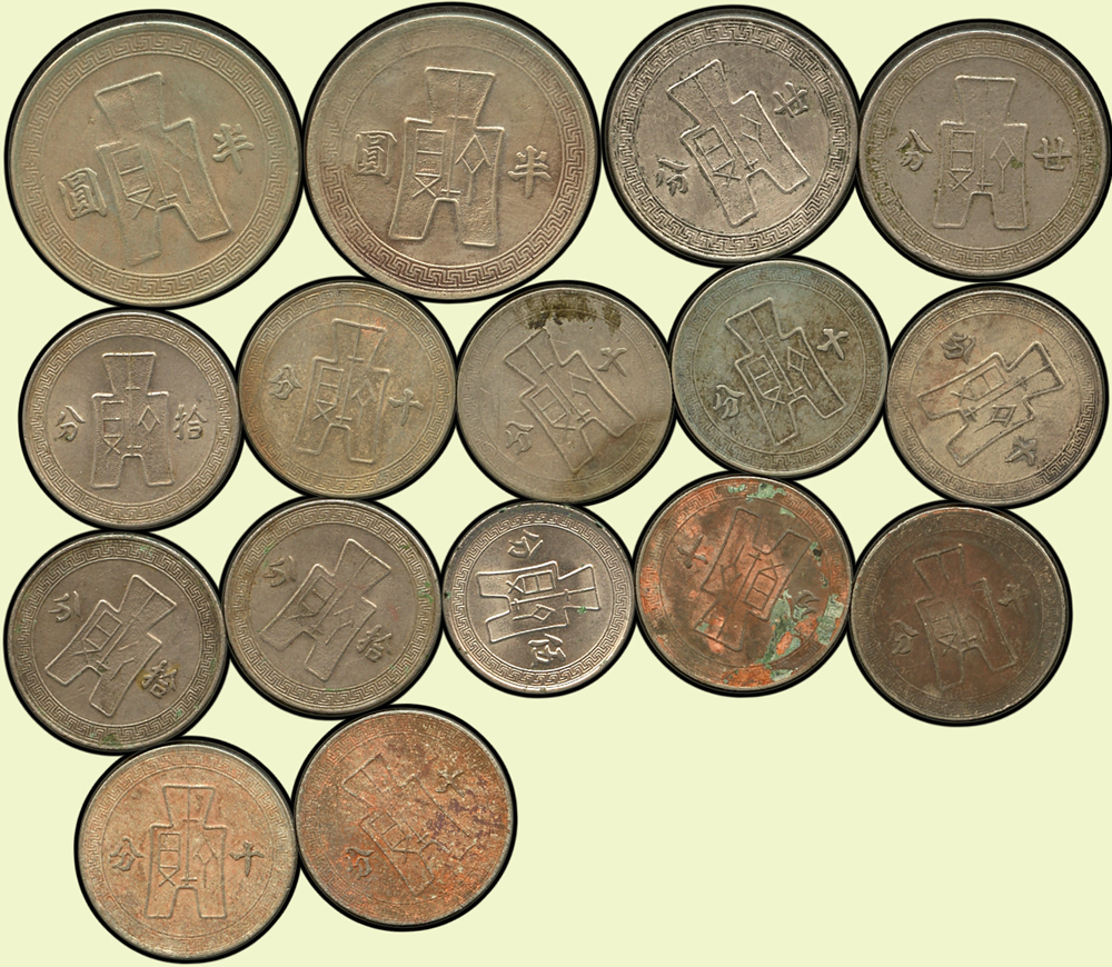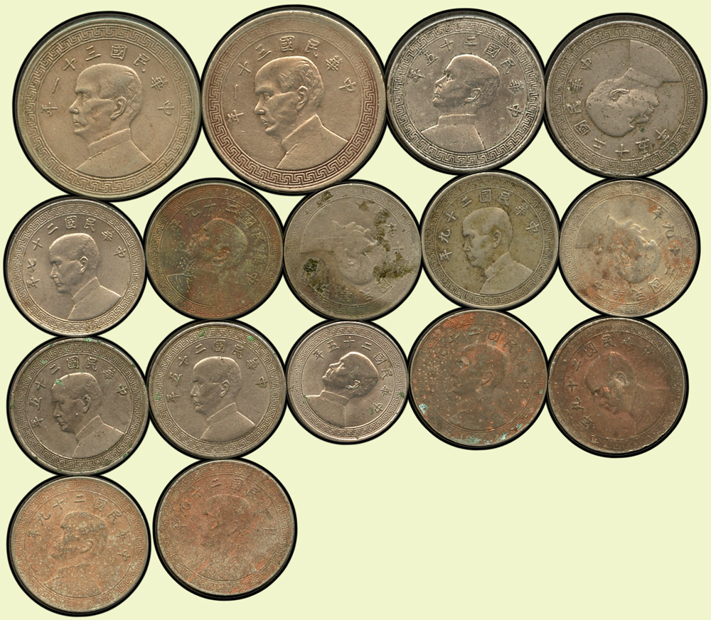 國父像布圖:(1)民國25年20分鎳幣2枚,VF-XF;(2)民國25年5分鎳幣1枚,UNC;(3)民國29年10分鎳幣8枚,微氧化,VF-XF;(4)民國25年10分鎳幣2枚,VF-XF;(5)民國27年10分鎳幣1枚,XF;(6)民國31年半圓鎳幣2枚,XF