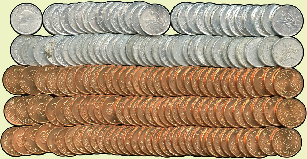 台灣銀行流通硬輔幣一組:(1)民國44年國父像1角鋁幣1枚,AU;(2)民國75年梅花圖5角紅銅幣100枚,BU;(3)民國63年蘭花圖1角鋁幣14枚,UNC;(4)民國62年蘭花圖1角鋁幣13枚,UNC;(5)民國56-63年蘭花圖1角鋁幣34枚,VF-AU;