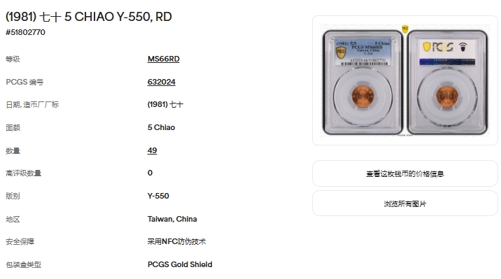 錢幣分類 中國錢幣中國歷代古錢(8001-8022)中國機制銀幣(8023-8108)中國機制銅幣/鎳幣/鋁幣(8109-8142)偽政權錢幣(8143-8144)台灣銀行~流通幣(8145-8187)台灣銀行~試鑄幣(8188)台灣銀行~紀念幣(章)(8189-8210)中國人民銀行~流通幣(8211-8217)中國人民銀行~金銀紀念幣(8218-8236)各時期~紀念章(8238-8258)中國香港錢幣(8259-8263)世界各國錢幣日本錢幣(8264-8283)世界各國錢幣(A~Z)(8284-8309)晚到項次~新中國金.銀幣(8825-8827) 中國錢幣 ↳中國歷代古錢(8001-8022) ↳中國機制銀幣(8023-8108) ↳中國機制銅幣/鎳幣/鋁幣(8109-8142) ↳偽政權錢幣(8143-8144) ↳台灣銀行~流通幣(8145-8187) ↳台灣銀行~試鑄幣(8188) ↳台灣銀行~紀念幣(章)(8189-8210) ↳中國人民銀行~流通幣(8211-8217) ↳中國人民銀行~金銀紀念幣(8218-8236) ↳各時期~紀念章(8238-8258) ↳中國香港錢幣(8259-8263)世界各國錢幣 ↳日本錢幣(8264-8283) ↳世界各國錢幣(A~Z)(8284-8309) ↳晚到項次~新中國金.銀幣(8825-8827) 點大圖放大展示,點小圖切換 3 台灣銀行民國七十年五角PCGS 66RD,最高分(Page 21) 結標時間 2025-12-16 10:58:20 拍品編號:8176 起拍價:NT$1100 當前價:NT$1100 自動出價 直接出價 出價 系統將按出價級數,依序為您比(出)價至上限金額 提醒您:直接出價後不可將金額改低,只能改高,蟠龍無法降低您的出價,最高出價者無法取消出價 (查看出價說明) 得標說明:需按得標價另加10%佣金 當前加價幅度:NT$0元 (查看加價級數表) 回上頁 線上出價記錄 線上 0 人次,書面 0 人次 競價客戶 所在地 出價時間 出價金額 出價方式 問與答 目前尚無提問 我要提問 請先登入會員