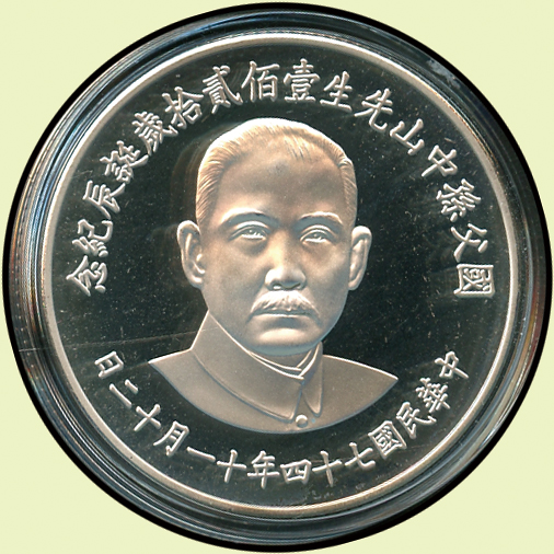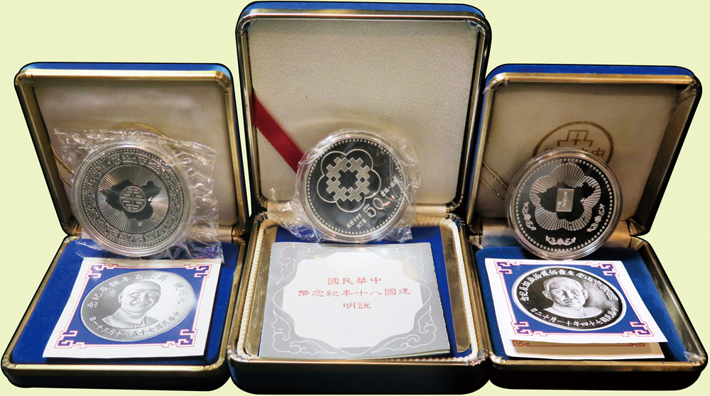 台灣銀行代售銀幣/章三枚:(1)民國74年國父孫中山先生120歲誕辰紀念27克銀章,原盒裝.證書,BU;(2)1991年中華民國建國八十年紀念1盎司銀幣,原盒裝.證書,PROOF;(3)民國75年先總統蔣公百年誕辰紀念銀章,重27克,原盒裝.證書,UNC(Page 22)