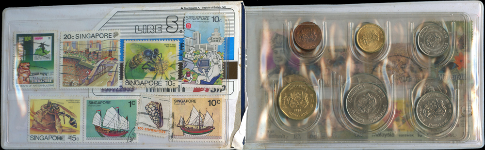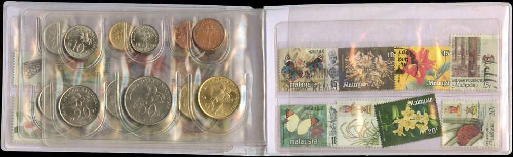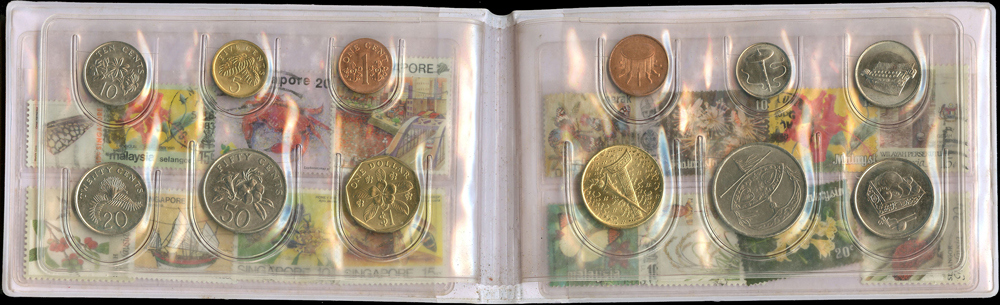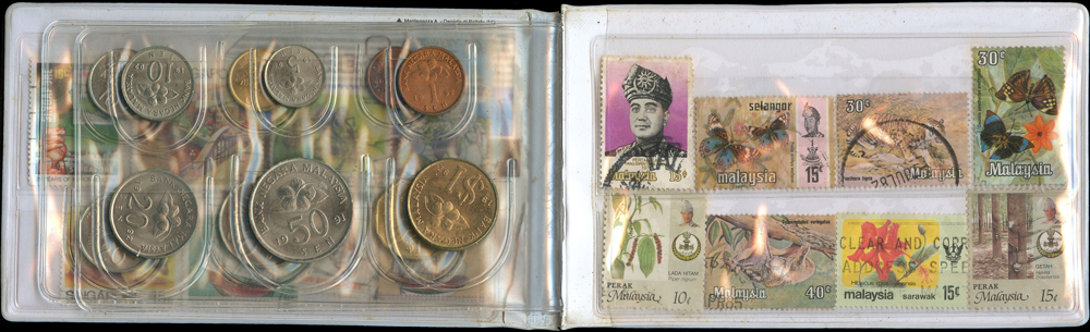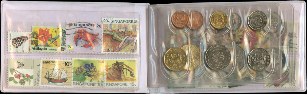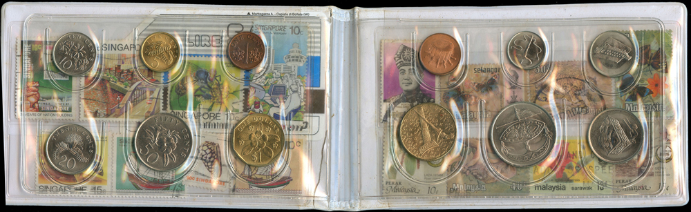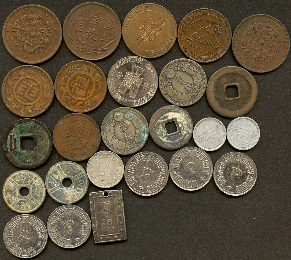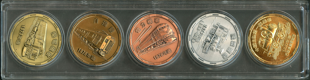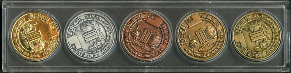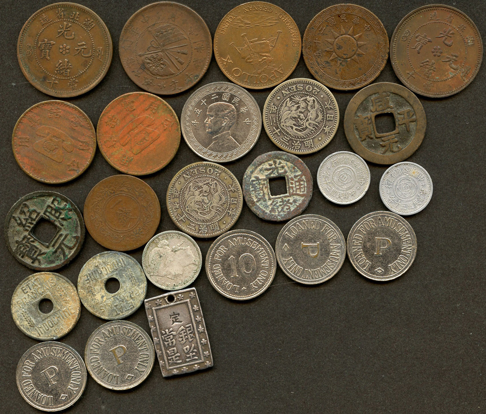 各國各式幣.章一組,包括:(1)中華民國慶祝中國鐵路100周年紀念章,5枚乙套,原盒裝;(2)中華電信公用電話代幣2枚,遊戲娛樂場代幣5枚;(3)黨徽布圖民國25年1分銅幣,國父像布圖民國25年20分A記鎳幣各1枚;(4)中國聯合準備銀行民國30年1分鋁幣2枚;(5)日本明治29年.32年龍20錢銀幣各1枚,大正10年桐1錢銅幣1枚,天保一分銀1枚;(6)湖北省造光緒當十銅幣2枚,中華桐幣壹枚1枚,方孔幣3枚;(7)人類首次登陸月球紀念銅章1枚,法屬印度支那1/4分鋁幣2枚,海峽殖民地10分鎳幣1枚;(8)新加坡及馬來西亞旅行紀念流通幣組2冊,內均含流通幣12枚.舊票16枚;以上品像混合,F-VF,歡迎至官網瀏覽全貌