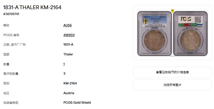 錢幣分類 中國錢幣中國歷代古錢(8001-8022)中國機制銀幣(8023-8108)中國機制銅幣/鎳幣/鋁幣(8109-8142)偽政權錢幣(8143-8144)台灣銀行~流通幣(8145-8187)台灣銀行~試鑄幣(8188)台灣銀行~紀念幣(章)(8189-8210)中國人民銀行~流通幣(8211-8217)中國人民銀行~金銀紀念幣(8218-8236)各時期~紀念章(8238-8258)中國香港錢幣(8259-8263)世界各國錢幣日本錢幣(8264-8283)世界各國錢幣(A~Z)(8284-8309)晚到項次~新中國金.銀幣(8825-8827) 中國錢幣 ↳中國歷代古錢(8001-8022) ↳中國機制銀幣(8023-8108) ↳中國機制銅幣/鎳幣/鋁幣(8109-8142) ↳偽政權錢幣(8143-8144) ↳台灣銀行~流通幣(8145-8187) ↳台灣銀行~試鑄幣(8188) ↳台灣銀行~紀念幣(章)(8189-8210) ↳中國人民銀行~流通幣(8211-8217) ↳中國人民銀行~金銀紀念幣(8218-8236) ↳各時期~紀念章(8238-8258) ↳中國香港錢幣(8259-8263)世界各國錢幣 ↳日本錢幣(8264-8283) ↳世界各國錢幣(A~Z)(8284-8309) ↳晚到項次~新中國金.銀幣(8825-8827) 點大圖放大展示,點小圖切換 奧地利(Austria)1831年弗朗茨一世大型泰勒銀幣,A記,PCGS AU55金盾(Page 33) 結標時間 2025-12-16 11:36:00 拍品編號:8289 起拍價:NT$6500 當前價:NT$6500 自動出價 直接出價 出價 系統將按出價級數,依序為您比(出)價至上限金額 提醒您:直接出價後不可將金額改低,只能改高,蟠龍無法降低您的出價,最高出價者無法取消出價 (查看出價說明) 得標說明:需按得標價另加10%佣金 當前加價幅度:NT$0元 (查看加價級數表) 回上頁 線上出價記錄 線上 0 人次,書面 0 人次 競價客戶 所在地 出價時間 出價金額 出價方式 問與答 目前尚無提問 我要提問 請先登入會員