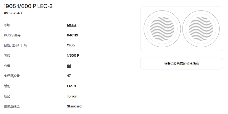 錢幣分類 中國錢幣中國歷代古錢(8001-8022)中國機制銀幣(8023-8108)中國機制銅幣/鎳幣/鋁幣(8109-8142)偽政權錢幣(8143-8144)台灣銀行~流通幣(8145-8187)台灣銀行~試鑄幣(8188)台灣銀行~紀念幣(章)(8189-8210)中國人民銀行~流通幣(8211-8217)中國人民銀行~金銀紀念幣(8218-8236)各時期~紀念章(8238-8258)中國香港錢幣(8259-8263)世界各國錢幣日本錢幣(8264-8283)世界各國錢幣(A~Z)(8284-8309)晚到項次~新中國金.銀幣(8825-8827) 中國錢幣 ↳中國歷代古錢(8001-8022) ↳中國機制銀幣(8023-8108) ↳中國機制銅幣/鎳幣/鋁幣(8109-8142) ↳偽政權錢幣(8143-8144) ↳台灣銀行~流通幣(8145-8187) ↳台灣銀行~試鑄幣(8188) ↳台灣銀行~紀念幣(章)(8189-8210) ↳中國人民銀行~流通幣(8211-8217) ↳中國人民銀行~金銀紀念幣(8218-8236) ↳各時期~紀念章(8238-8258) ↳中國香港錢幣(8259-8263)世界各國錢幣 ↳日本錢幣(8264-8283) ↳世界各國錢幣(A~Z)(8284-8309) ↳晚到項次~新中國金.銀幣(8825-8827) 點大圖放大展示,點小圖切換 安南1905年六百分之一通寶錫幣,PCGS MS64(Page 34) 結標時間 2025-12-16 11:42:20 拍品編號:8308 起拍價:NT$3500 當前價:NT$3500 前往商城直購品專區 自動出價 直接出價 出價 系統將按出價級數,依序為您比(出)價至上限金額 提醒您:直接出價後不可將金額改低,只能改高,蟠龍無法降低您的出價,最高出價者無法取消出價 (查看出價說明) 得標說明:需按得標價另加10%佣金 當前加價幅度:NT$0元 (查看加價級數表) 回上頁 線上出價記錄 線上 0 人次,書面 0 人次 競價客戶 所在地 出價時間 出價金額 出價方式 問與答 目前尚無提問 我要提問 請先登入會員