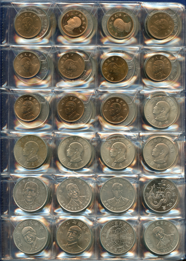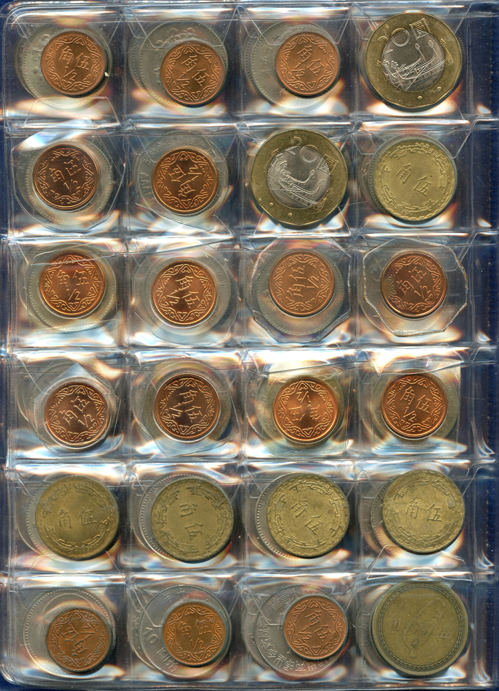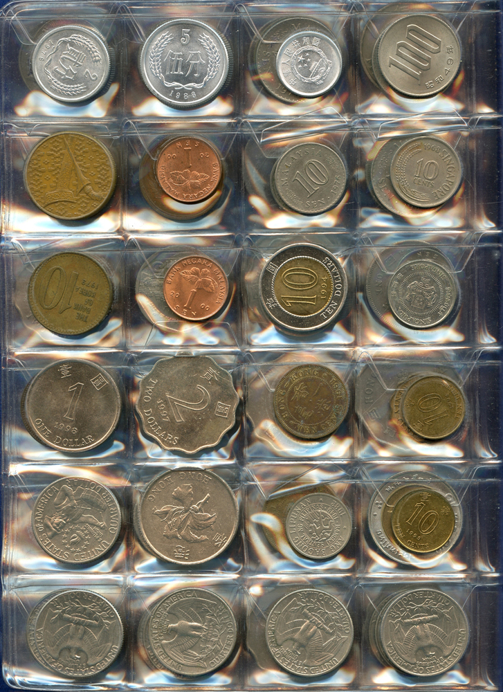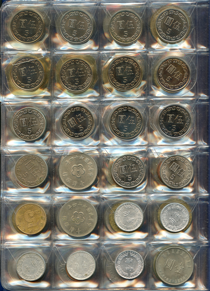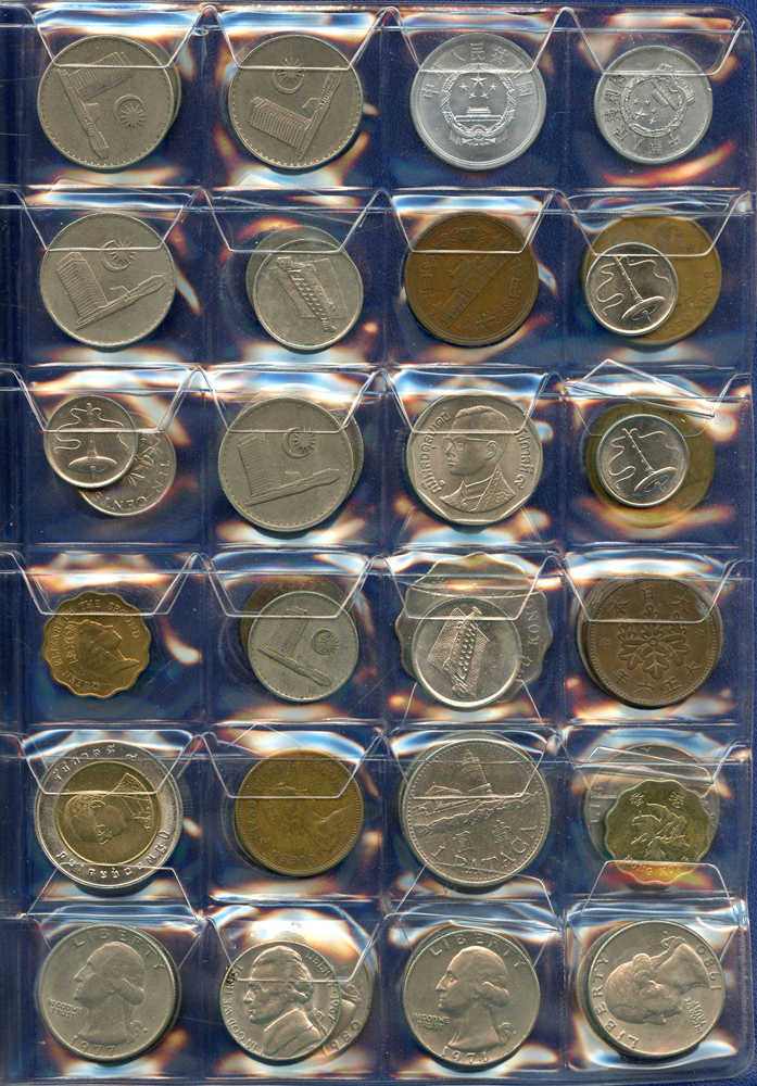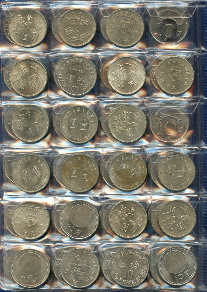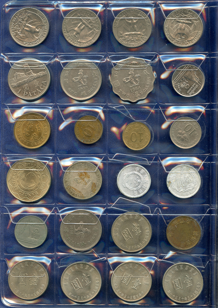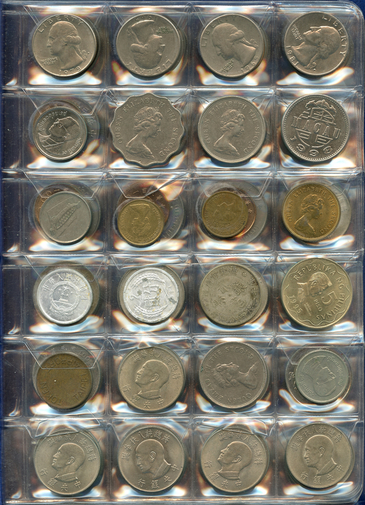 各國中近期流通硬輔幣288枚,整理整齊於二冊中,國家包括有:美國.香港.澳門.泰國.大陸.菲律賓.台灣.新加坡.馬來西亞.日本,其中含台灣民國55年蔣公八秩華誕紀念1元鎳幣11枚,台北航空站看台銅牌代用幣1枚,多重複,XF-UNC;總重約2公斤,歡迎至官網瀏覽全貌;另贈低額人民幣6枚(污舊).港幣10元1枚,共7枚紙幣