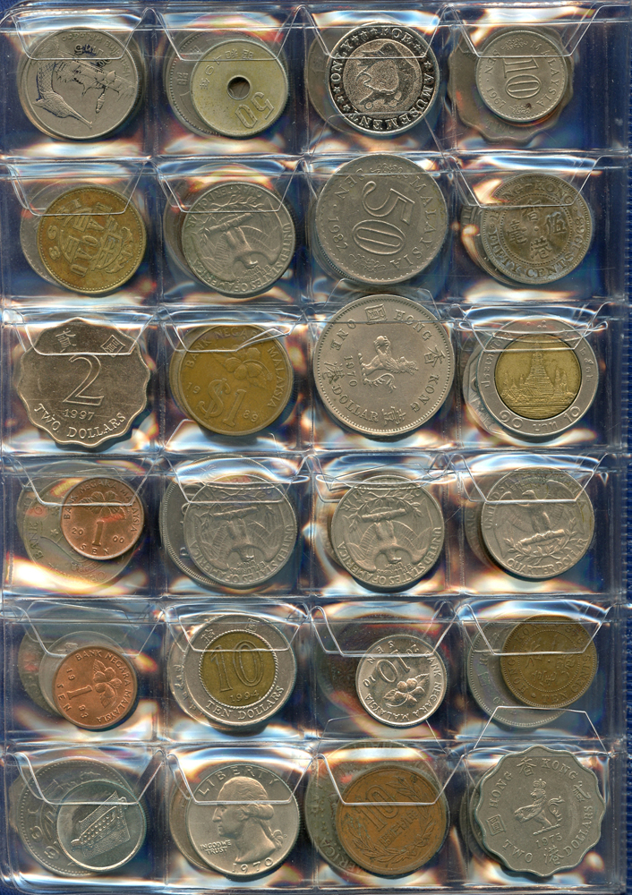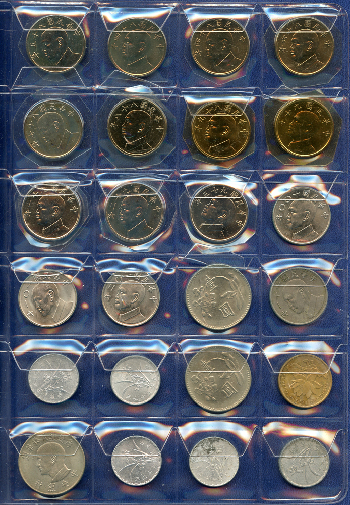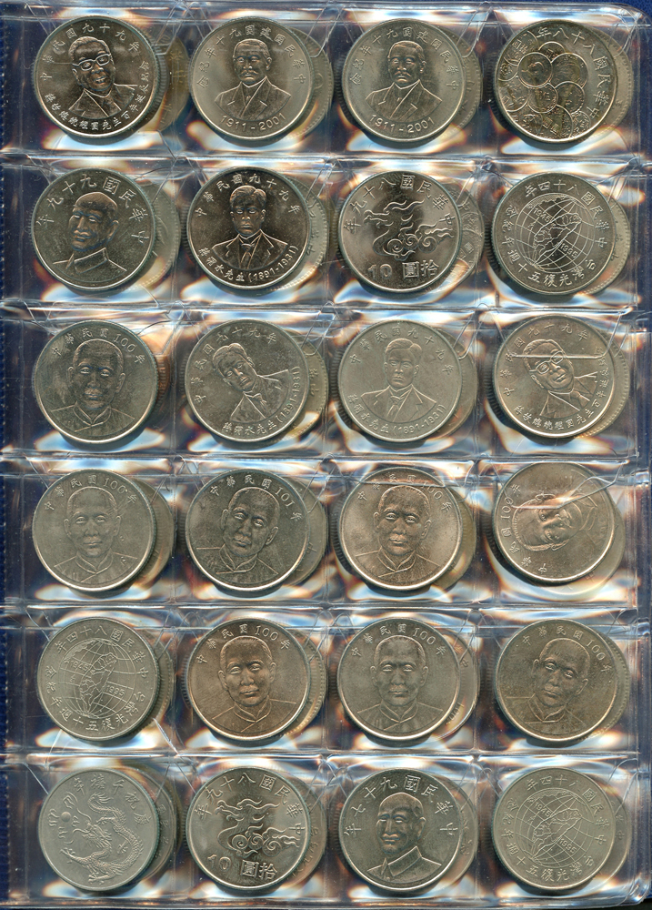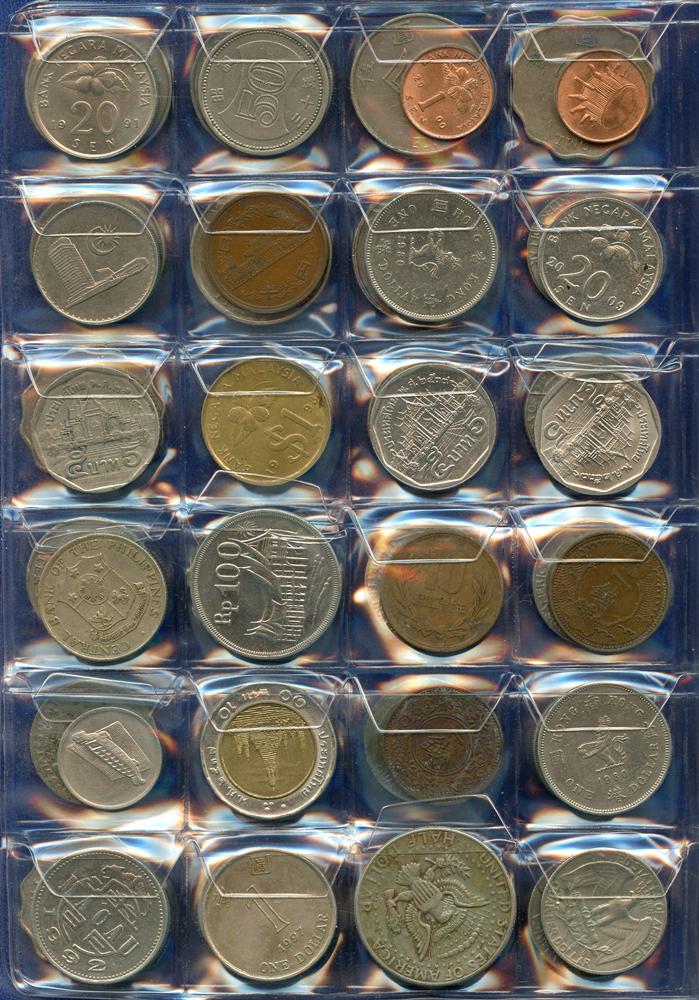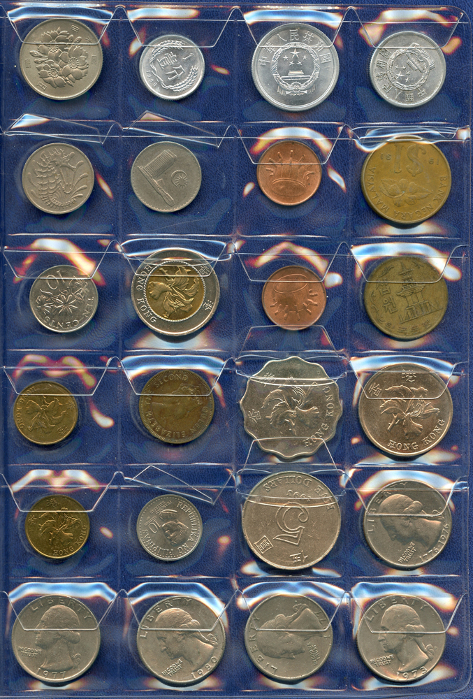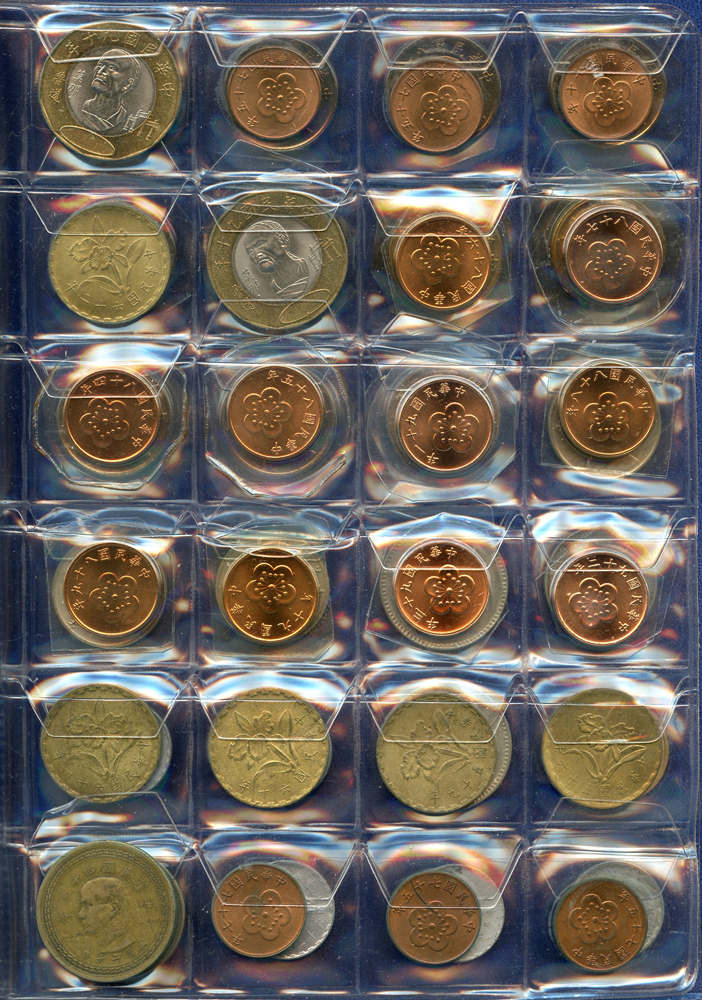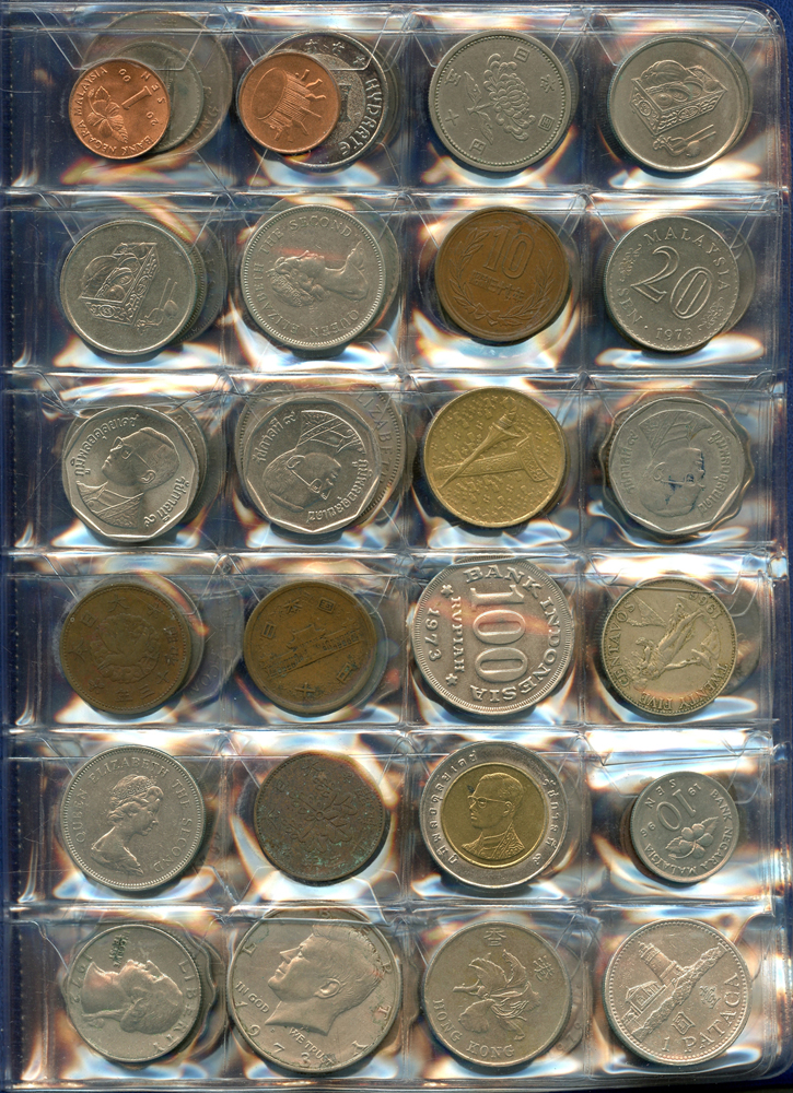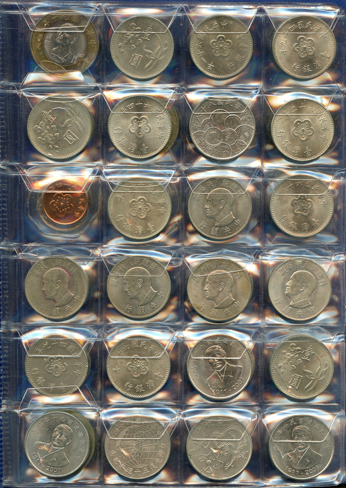 各國中近期流通硬輔幣288枚,整理整齊於二冊中,國家包括有:美國.香港.澳門.泰國.大陸.菲律賓.台灣.新加坡.馬來西亞.日本,其中含台灣民國55年蔣公八秩華誕紀念1元鎳幣11枚,台北航空站看台銅牌代用幣1枚,多重複,XF-UNC;總重約2公斤,歡迎至官網瀏覽全貌;另贈低額人民幣6枚(污舊).港幣10元1枚,共7枚紙幣