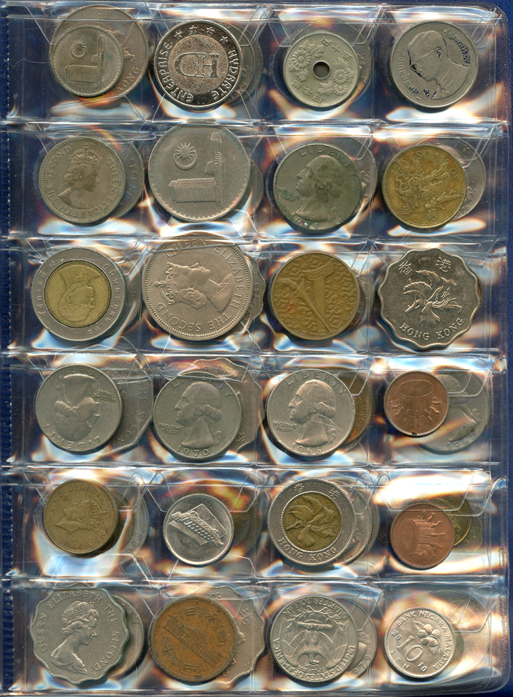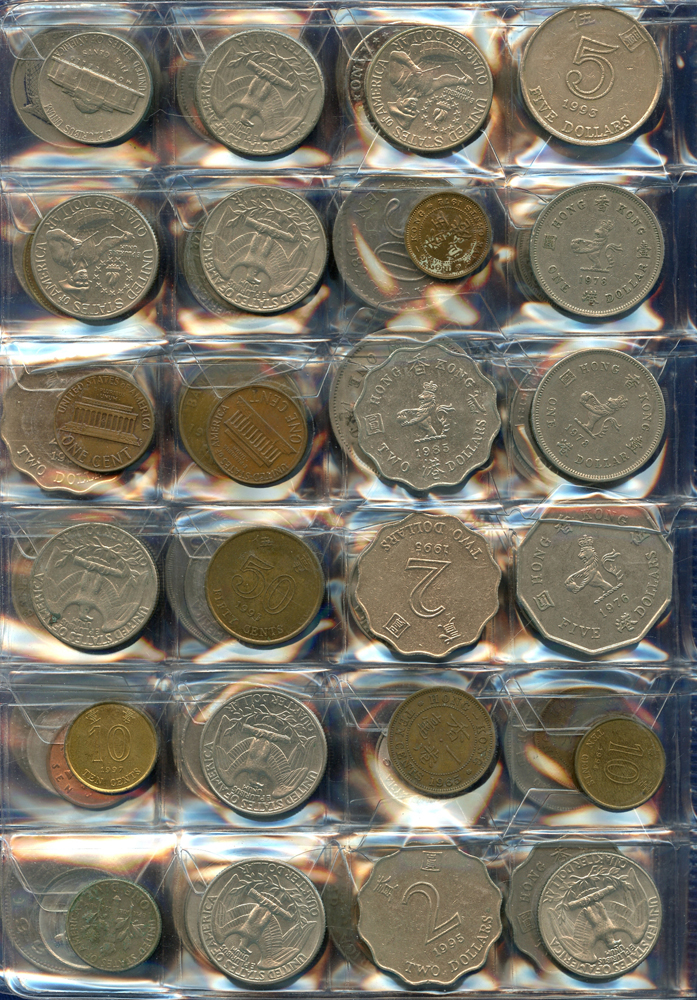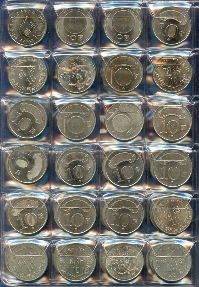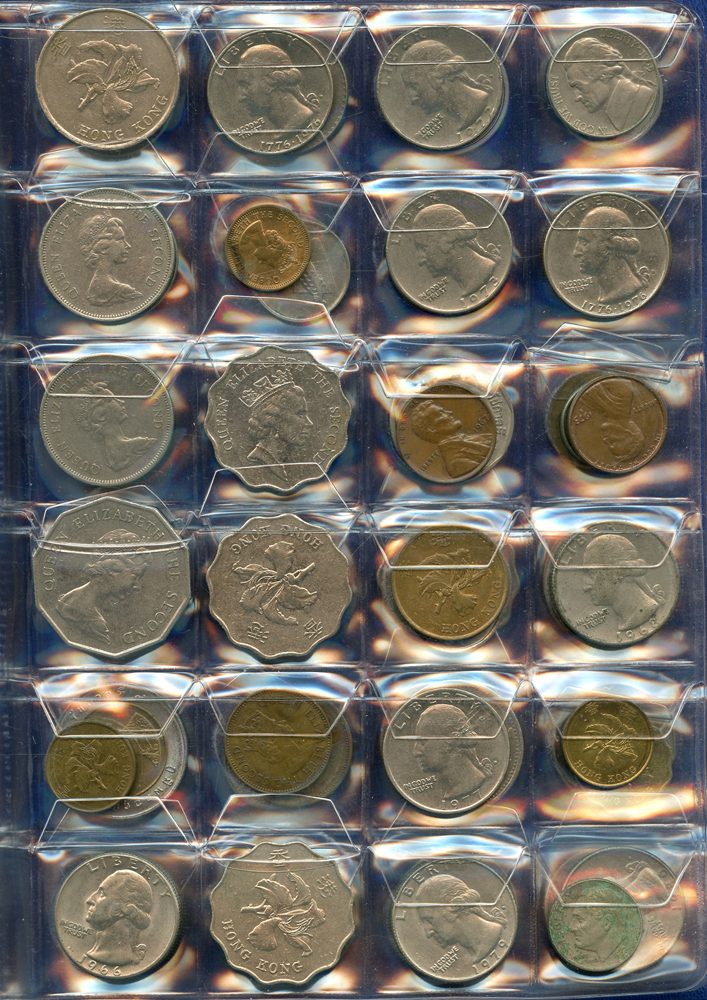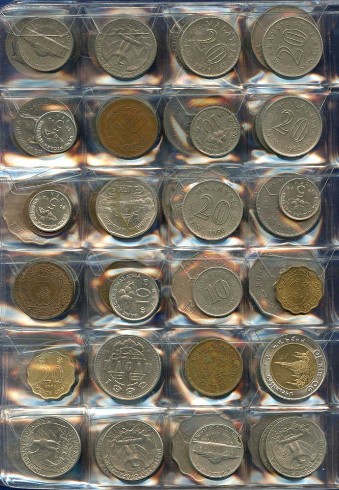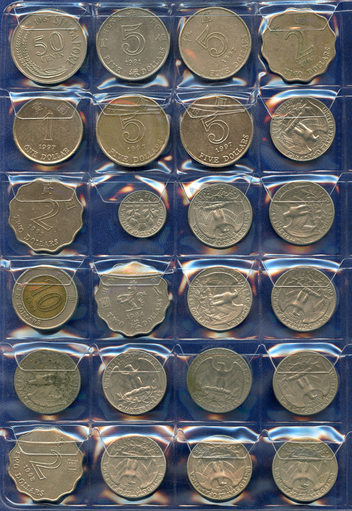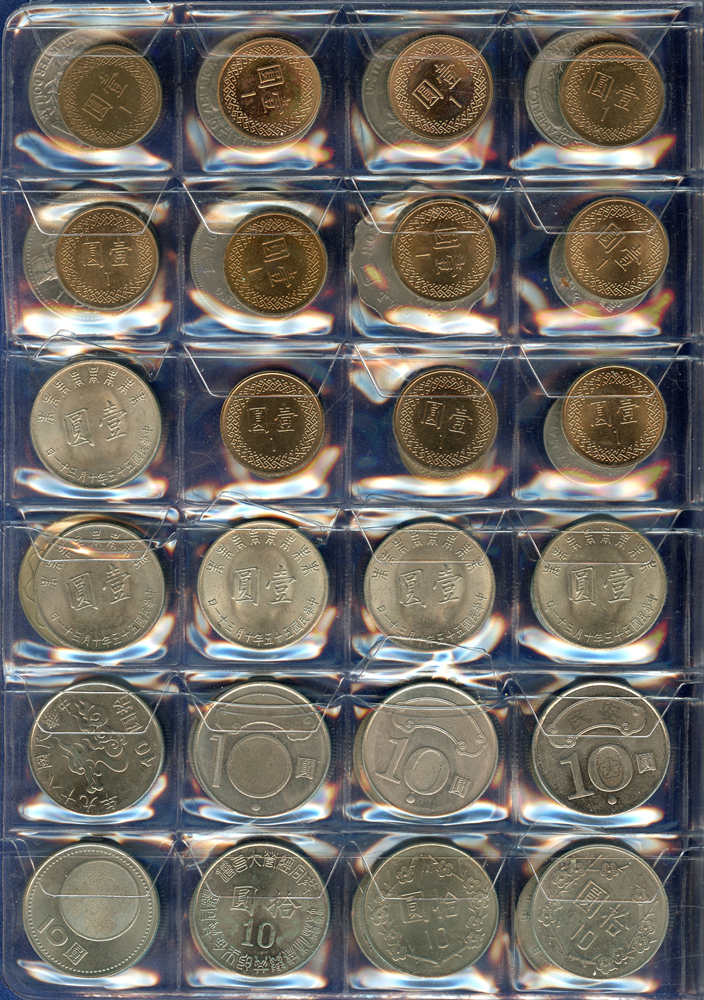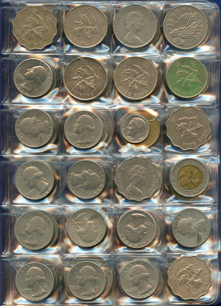 各國中近期流通硬輔幣288枚,整理整齊於二冊中,國家包括有:美國.香港.澳門.泰國.大陸.菲律賓.台灣.新加坡.馬來西亞.日本,其中含台灣民國55年蔣公八秩華誕紀念1元鎳幣11枚,台北航空站看台銅牌代用幣1枚,多重複,XF-UNC;總重約2公斤,歡迎至官網瀏覽全貌;另贈低額人民幣6枚(污舊).港幣10元1枚,共7枚紙幣