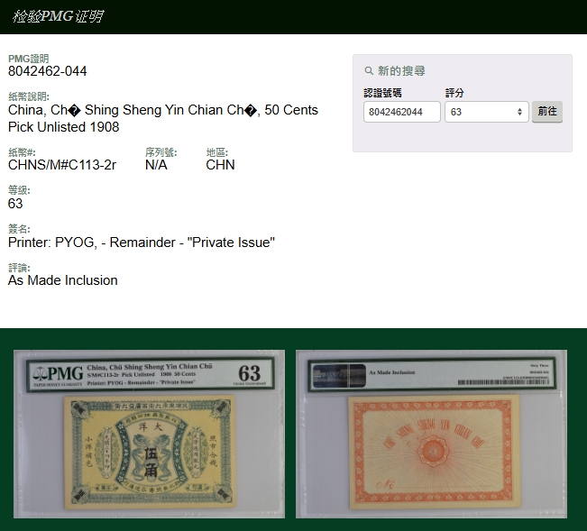 紙鈔分類 中國紙鈔清代~紙幣/股票/債券(8310-8323)『楊展孝』收藏~中央銀行銀元兑換券(8324-8380)民國~中央銀行紙幣(8381-8424)民國~中國銀行(8425-8448)民國~交通銀行(8449-8459)民國~中國農民銀行(8460-8462)民國~各省銀行券(8463-8491)民國~軍用鈔票(8492-8504)民國~地方券/錢莊票(8505-8510)民國~偽政權紙幣(8511-8519)民國金融票證~債券/股票(8520-8543)臺灣銀行~日治時期(8544-8552)臺灣銀行~老台幣(8553-8577)臺灣銀行~新台幣(8578-8679)臺灣銀行~限金門/限馬祖通用(8680-8694)臺灣銀行~限大陳島通用(8695-8696)臺灣/中央銀行~趣味號(8697-8706)中央銀行~三連鈔(8707-8709)臺灣各式金融票證(8710-8715)日本『山崎 修之亮』收藏~中國及外國紙幣(8716-8738)新中國紙幣解放區時期紙幣/債券(8739-8740)中國人民銀行~各版人民幣/外匯券/金融票證(8741-8759)世界各國紙幣日本紙幣(8760-8773)世界各國紙幣(A~Z)(8774-8783) 中國紙鈔 ↳清代~紙幣/股票/債券(8310-8323) ↳『楊展孝』收藏~中央銀行銀元兑換券(8324-8380) ↳民國~中央銀行紙幣(8381-8424) ↳民國~中國銀行(8425-8448) ↳民國~交通銀行(8449-8459) ↳民國~中國農民銀行(8460-8462) ↳民國~各省銀行券(8463-8491) ↳民國~軍用鈔票(8492-8504) ↳民國~地方券/錢莊票(8505-8510) ↳民國~偽政權紙幣(8511-8519) ↳民國金融票證~債券/股票(8520-8543) ↳臺灣銀行~日治時期(8544-8552) ↳臺灣銀行~老台幣(8553-8577) ↳臺灣銀行~新台幣(8578-8679) ↳臺灣銀行~限金門/限馬祖通用(8680-8694) ↳臺灣銀行~限大陳島通用(8695-8696) ↳臺灣/中央銀行~趣味號(8697-8706) ↳中央銀行~三連鈔(8707-8709) ↳臺灣各式金融票證(8710-8715) ↳日本『山崎 修之亮』收藏~中國及外國紙幣(8716-8738)新中國紙幣 ↳解放區時期紙幣/債券(8739-8740) ↳中國人民銀行~各版人民幣/外匯券/金融票證(8741-8759)世界各國紙幣 ↳日本紙幣(8760-8773) ↳世界各國紙幣(A~Z)(8774-8783) 點大圖放大展示,點小圖切換 7 (1908年)天津南市大街西廣益大街/江蘇聚興甡印錢局,光緒34年大洋伍角,PMG Choice Uncirculated 63;高分少(Page 35) 結標時間 2025-12-16 11:45:40 拍品編號:8318 起拍價:NT$13000 當前價:NT$13000 自動出價 直接出價 出價 系統將按出價級數,依序為您比(出)價至上限金額 提醒您:直接出價後不可將金額改低,只能改高,蟠龍無法降低您的出價,最高出價者無法取消出價 (查看出價說明) 得標說明:需按得標價另加10%佣金 當前加價幅度:NT$0元 (查看加價級數表) 回上頁 線上出價記錄 線上 0 人次,書面 0 人次 競價客戶 所在地 出價時間 出價金額 出價方式 問與答 目前尚無提問 我要提問 請先登入會員