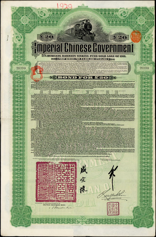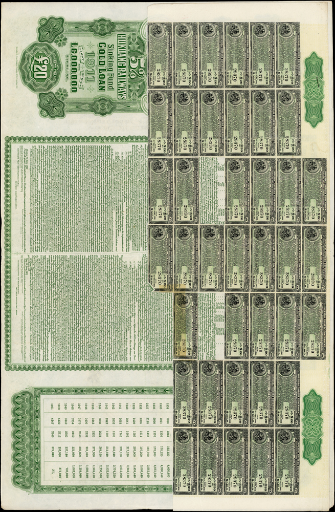 紙鈔分類 中國紙鈔清代~紙幣/股票/債券(8310-8323)『楊展孝』收藏~中央銀行銀元兑換券(8324-8380)民國~中央銀行紙幣(8381-8424)民國~中國銀行(8425-8448)民國~交通銀行(8449-8459)民國~中國農民銀行(8460-8462)民國~各省銀行券(8463-8491)民國~軍用鈔票(8492-8504)民國~地方券/錢莊票(8505-8510)民國~偽政權紙幣(8511-8519)民國金融票證~債券/股票(8520-8543)臺灣銀行~日治時期(8544-8552)臺灣銀行~老台幣(8553-8577)臺灣銀行~新台幣(8578-8679)臺灣銀行~限金門/限馬祖通用(8680-8694)臺灣銀行~限大陳島通用(8695-8696)臺灣/中央銀行~趣味號(8697-8706)中央銀行~三連鈔(8707-8709)臺灣各式金融票證(8710-8715)日本『山崎 修之亮』收藏~中國及外國紙幣(8716-8738)新中國紙幣解放區時期紙幣/債券(8739-8740)中國人民銀行~各版人民幣/外匯券/金融票證(8741-8759)世界各國紙幣日本紙幣(8760-8773)世界各國紙幣(A~Z)(8774-8783) 中國紙鈔 ↳清代~紙幣/股票/債券(8310-8323) ↳『楊展孝』收藏~中央銀行銀元兑換券(8324-8380) ↳民國~中央銀行紙幣(8381-8424) ↳民國~中國銀行(8425-8448) ↳民國~交通銀行(8449-8459) ↳民國~中國農民銀行(8460-8462) ↳民國~各省銀行券(8463-8491) ↳民國~軍用鈔票(8492-8504) ↳民國~地方券/錢莊票(8505-8510) ↳民國~偽政權紙幣(8511-8519) ↳民國金融票證~債券/股票(8520-8543) ↳臺灣銀行~日治時期(8544-8552) ↳臺灣銀行~老台幣(8553-8577) ↳臺灣銀行~新台幣(8578-8679) ↳臺灣銀行~限金門/限馬祖通用(8680-8694) ↳臺灣銀行~限大陳島通用(8695-8696) ↳臺灣/中央銀行~趣味號(8697-8706) ↳中央銀行~三連鈔(8707-8709) ↳臺灣各式金融票證(8710-8715) ↳日本『山崎 修之亮』收藏~中國及外國紙幣(8716-8738)新中國紙幣 ↳解放區時期紙幣/債券(8739-8740) ↳中國人民銀行~各版人民幣/外匯券/金融票證(8741-8759)世界各國紙幣 ↳日本紙幣(8760-8773) ↳世界各國紙幣(A~Z)(8774-8783) 點大圖放大展示,點小圖切換 1911年英國亞洲銀行代理發行,清末湖廣鐵路債券 £20英鎊(55.3*36.4cm),郵傳部盛宣懷簽署,均含部份息票,邊微損,對折,80新(Page 36) 結標時間 2025-12-16 11:47:00 拍品編號:8322 起拍價:NT$100 當前價:NT$100 自動出價 直接出價 出價 系統將按出價級數,依序為您比(出)價至上限金額 提醒您:直接出價後不可將金額改低,只能改高,蟠龍無法降低您的出價,最高出價者無法取消出價 (查看出價說明) 得標說明:需按得標價另加10%佣金 當前加價幅度:NT$0元 (查看加價級數表) 回上頁 線上出價記錄 線上 0 人次,書面 0 人次 競價客戶 所在地 出價時間 出價金額 出價方式 問與答 目前尚無提問 我要提問 請先登入會員