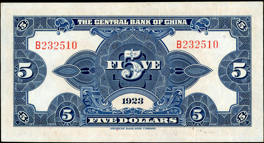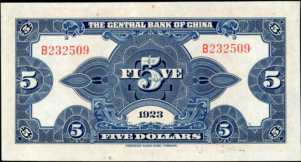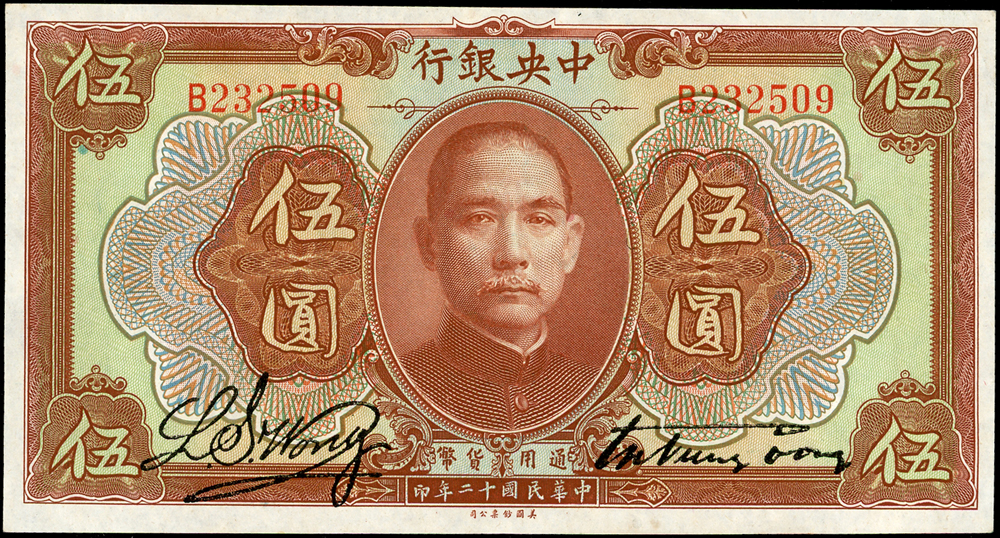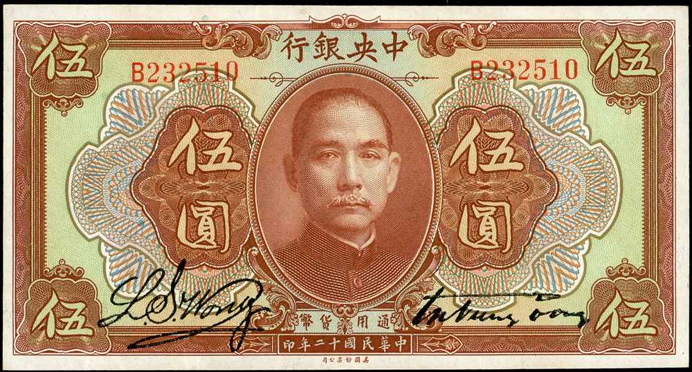 中央銀行十二年5元,共2枚連號,鈔號B232509,B232510(丙券)。全新未流通,但B232510上有原廠的皺痕,非流通所造成的,約9成新。存世僅此一對連號。楊著「中央銀行銀元兑換券」第24頁(Page 39)