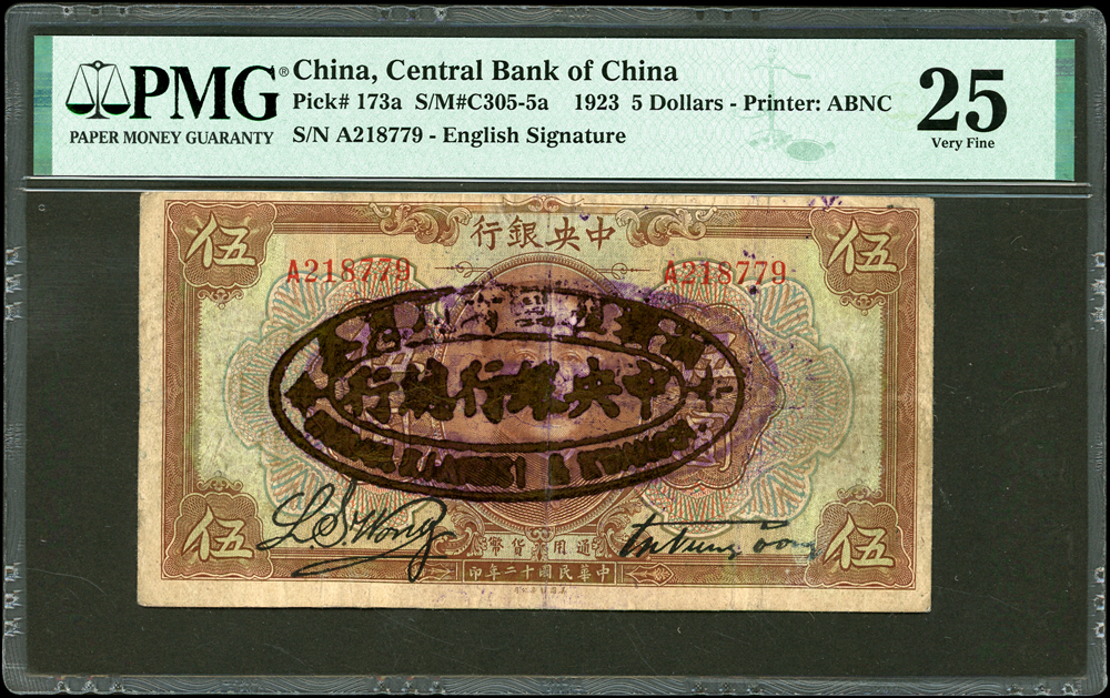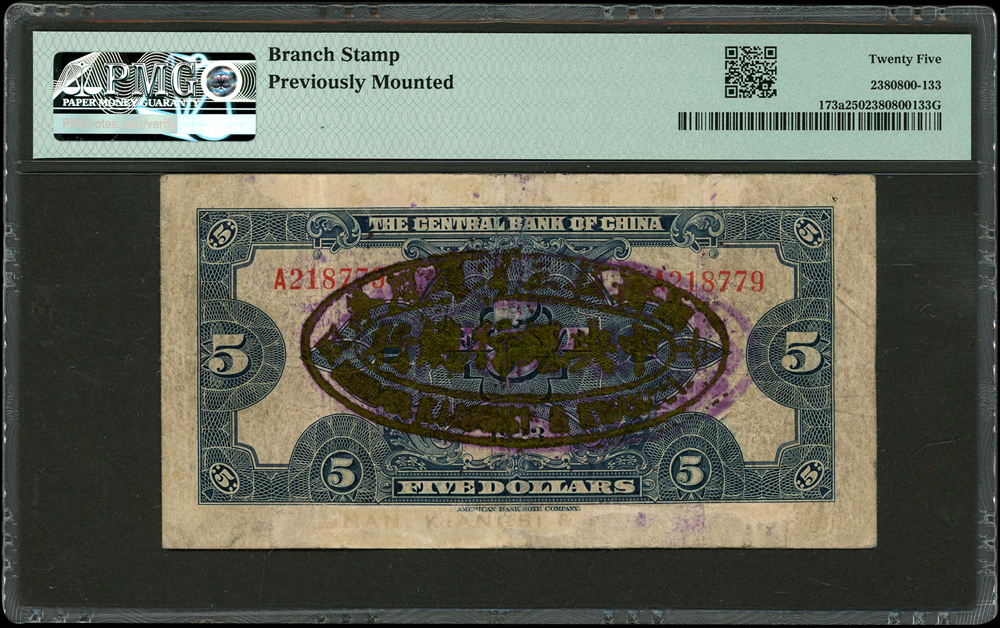 中央銀行十二年湘贛桂通用券5元被塗抹掉,在銀行兌現時被發現後,加蓋中央銀行總行湘贛桂三省通用券橢圓戳,鈔號A218779。此種5元的橢圓戳加蓋僅紀錄有5枚。PMG 25。楊著「中央銀行銀元兑換券」第34頁(Page 40)