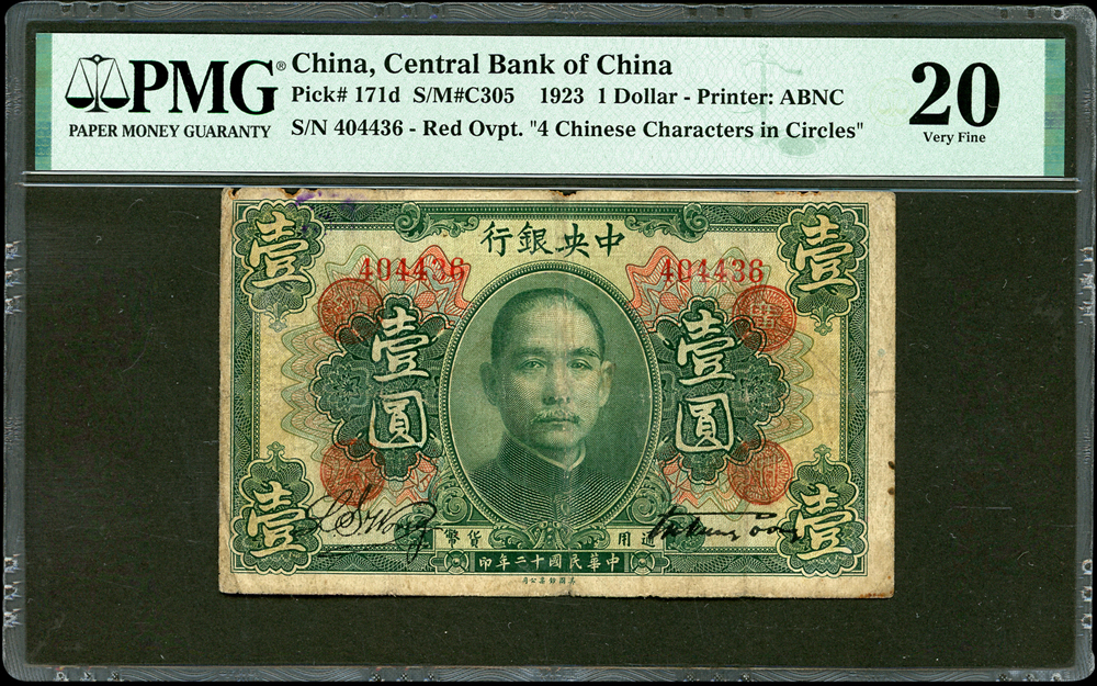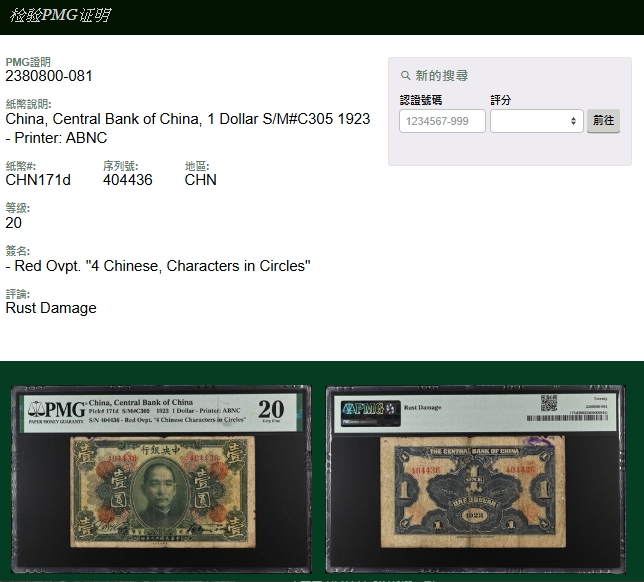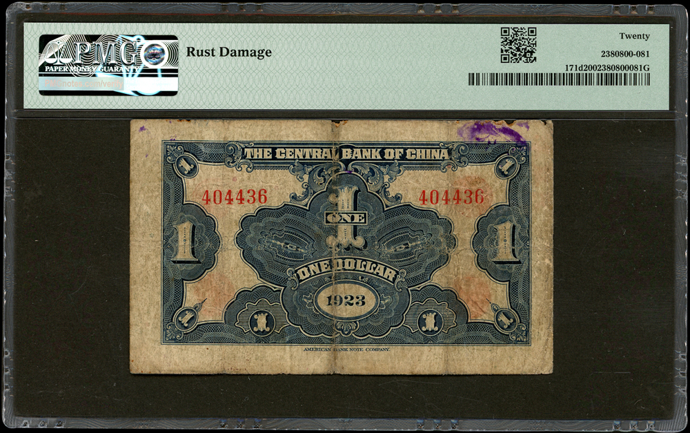 中央銀行十二年加蓋廣州總行1元,鈔號404436。甲券無字軌加蓋,存世僅此一枚,PMG 20 Rust Damage(註:PMG評級不分字軌)。蘇駿「中央銀行紙幣•壹」第112頁實物。楊著「中央銀行銀元兑換券」第43頁(Page 42)