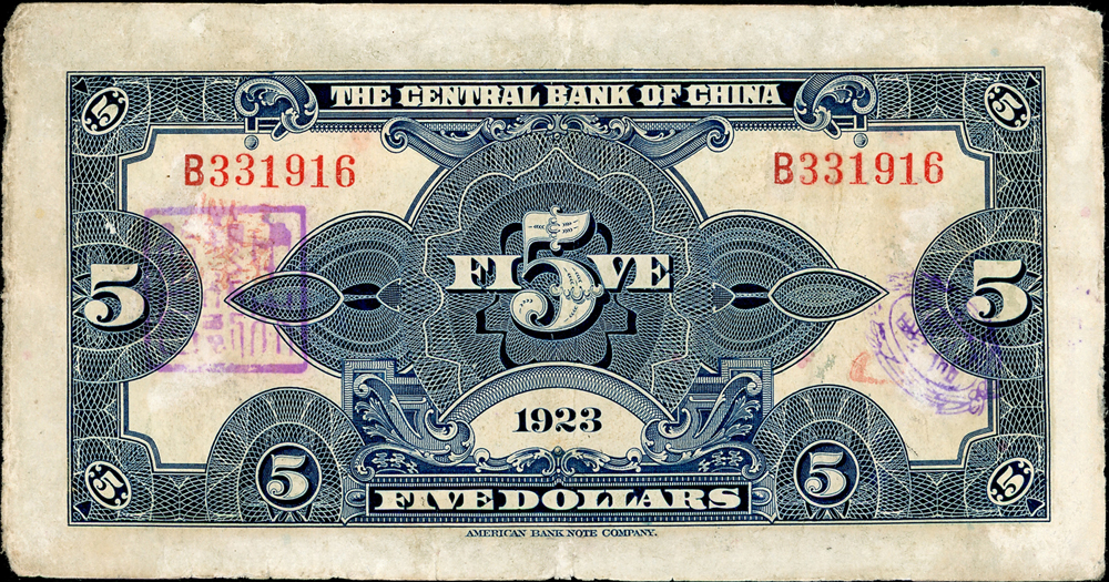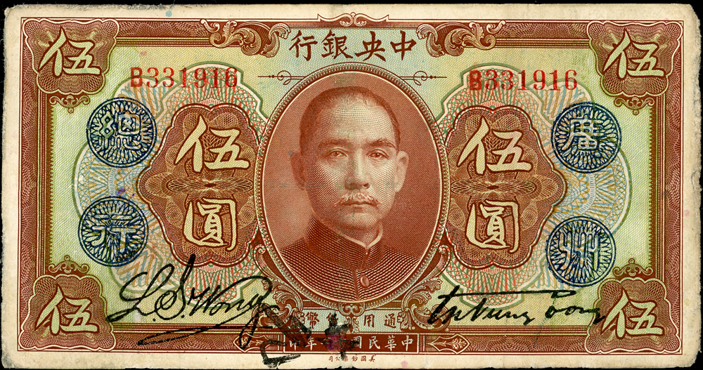 中央銀行十二年加蓋廣州總行5元,鈔號B331916。是加蓋在真正廣州發行的丙券上,僅紀錄有6枚。約7成新,顏色鮮明,狀態良好。此枚是蘇駿「中央銀行紙幣•壹」第118頁實物。楊著「中央銀行銀元兑換券」第45頁(Page 42)