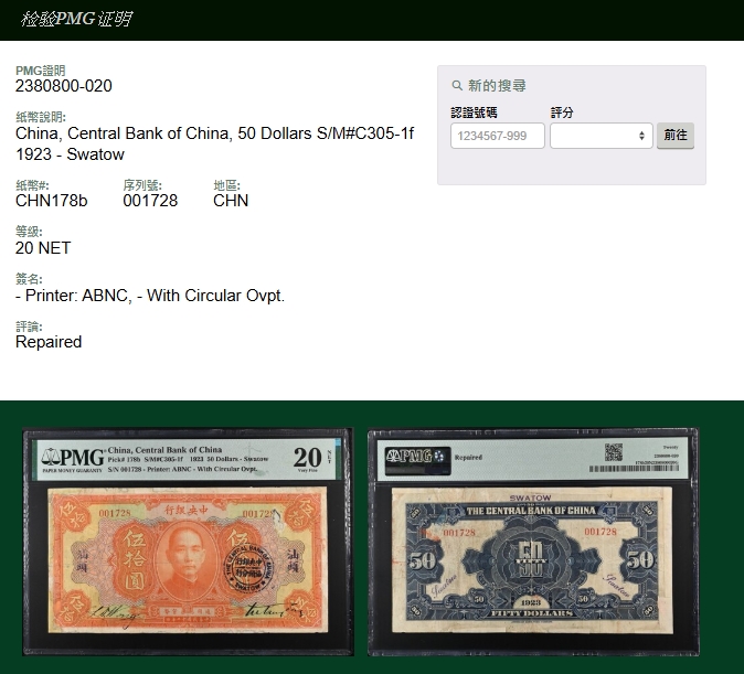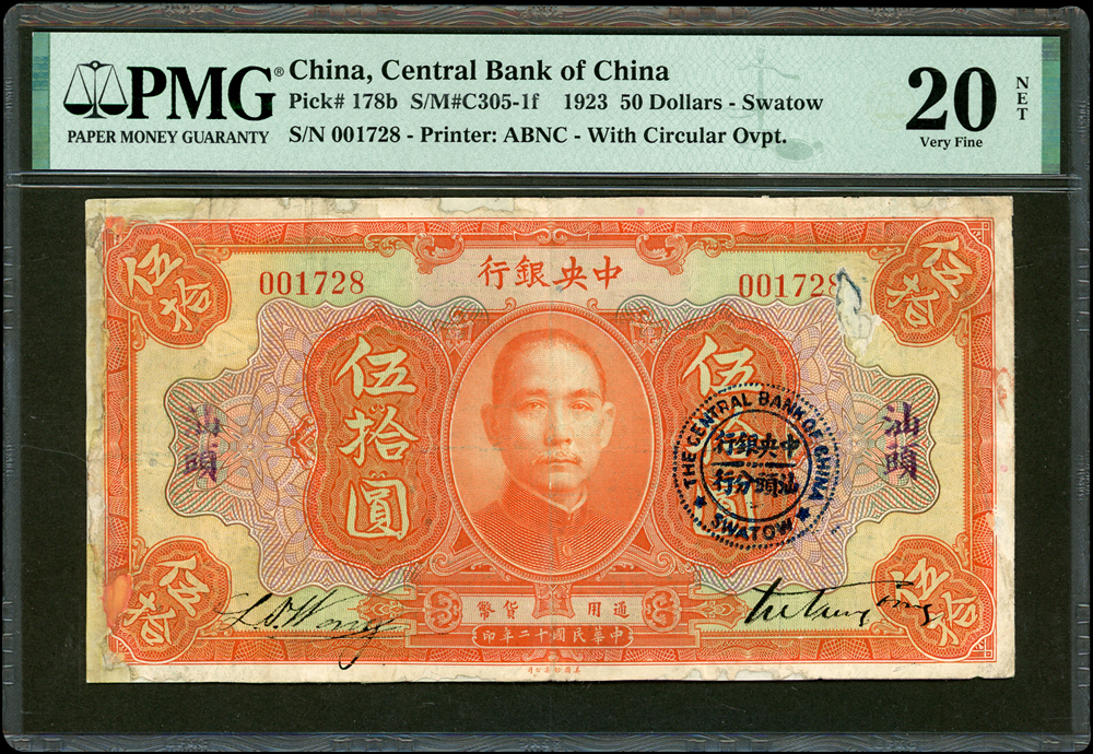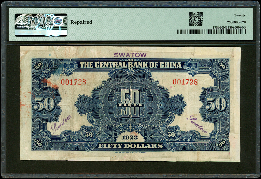 中央銀行汕頭分行十二年50元,鈔號001728,宋子文、黃隆生手簽的英文簽名,不是印刷的。加蓋汕頭分行圓戳。PMG 20NET Repaired。僅紀錄有2枚,另一枚為誠軒2013春(八新修補)拍149,500元人民幣。楊著「中央銀行銀元兑換券」第60頁(Page 43)