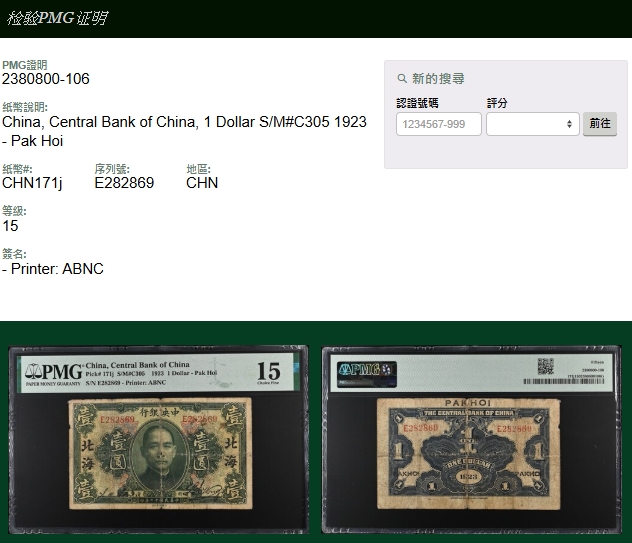紙鈔分類 中國紙鈔清代~紙幣/股票/債券(8310-8323)『楊展孝』收藏~中央銀行銀元兑換券(8324-8380)民國~中央銀行紙幣(8381-8424)民國~中國銀行(8425-8448)民國~交通銀行(8449-8459)民國~中國農民銀行(8460-8462)民國~各省銀行券(8463-8491)民國~軍用鈔票(8492-8504)民國~地方券/錢莊票(8505-8510)民國~偽政權紙幣(8511-8519)民國金融票證~債券/股票(8520-8543)臺灣銀行~日治時期(8544-8552)臺灣銀行~老台幣(8553-8577)臺灣銀行~新台幣(8578-8679)臺灣銀行~限金門/限馬祖通用(8680-8694)臺灣銀行~限大陳島通用(8695-8696)臺灣/中央銀行~趣味號(8697-8706)中央銀行~三連鈔(8707-8709)臺灣各式金融票證(8710-8715)日本『山崎 修之亮』收藏~中國及外國紙幣(8716-8738)新中國紙幣解放區時期紙幣/債券(8739-8740)中國人民銀行~各版人民幣/外匯券/金融票證(8741-8759)世界各國紙幣日本紙幣(8760-8773)世界各國紙幣(A~Z)(8774-8783) 中國紙鈔 ↳清代~紙幣/股票/債券(8310-8323) ↳『楊展孝』收藏~中央銀行銀元兑換券(8324-8380) ↳民國~中央銀行紙幣(8381-8424) ↳民國~中國銀行(8425-8448) ↳民國~交通銀行(8449-8459) ↳民國~中國農民銀行(8460-8462) ↳民國~各省銀行券(8463-8491) ↳民國~軍用鈔票(8492-8504) ↳民國~地方券/錢莊票(8505-8510) ↳民國~偽政權紙幣(8511-8519) ↳民國金融票證~債券/股票(8520-8543) ↳臺灣銀行~日治時期(8544-8552) ↳臺灣銀行~老台幣(8553-8577) ↳臺灣銀行~新台幣(8578-8679) ↳臺灣銀行~限金門/限馬祖通用(8680-8694) ↳臺灣銀行~限大陳島通用(8695-8696) ↳臺灣/中央銀行~趣味號(8697-8706) ↳中央銀行~三連鈔(8707-8709) ↳臺灣各式金融票證(8710-8715) ↳日本『山崎 修之亮』收藏~中國及外國紙幣(8716-8738)新中國紙幣 ↳解放區時期紙幣/債券(8739-8740) ↳中國人民銀行~各版人民幣/外匯券/金融票證(8741-8759)世界各國紙幣 ↳日本紙幣(8760-8773) ↳世界各國紙幣(A~Z)(8774-8783) 點大圖放大展示,點小圖切換 2 中央銀行十二年北海地名1元,鈔號E282869。紀錄僅有此一枚。PMG 15。蘇駿「中央銀行紙幣•壹」第144頁實物。楊著「中央銀行銀元兑換券」第62頁(Page 44) 結標時間 2025-12-16 11:58:00 拍品編號:8355 起拍價:NT$270000 當前價:NT$270000 前往商城直購品專區 自動出價 直接出價 出價 系統將按出價級數,依序為您比(出)價至上限金額 提醒您:直接出價後不可將金額改低,只能改高,蟠龍無法降低您的出價,最高出價者無法取消出價 (查看出價說明) 得標說明:需按得標價另加10%佣金 當前加價幅度:NT$0元 (查看加價級數表) 回上頁 線上出價記錄 線上 0 人次,書面 0 人次 競價客戶 所在地 出價時間 出價金額 出價方式 問與答 目前尚無提問 我要提問 請先登入會員