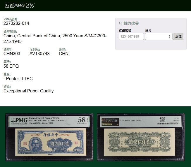 紙鈔分類 中國紙鈔清代~紙幣/股票/債券(8310-8323)『楊展孝』收藏~中央銀行銀元兑換券(8324-8380)民國~中央銀行紙幣(8381-8424)民國~中國銀行(8425-8448)民國~交通銀行(8449-8459)民國~中國農民銀行(8460-8462)民國~各省銀行券(8463-8491)民國~軍用鈔票(8492-8504)民國~地方券/錢莊票(8505-8510)民國~偽政權紙幣(8511-8519)民國金融票證~債券/股票(8520-8543)臺灣銀行~日治時期(8544-8552)臺灣銀行~老台幣(8553-8577)臺灣銀行~新台幣(8578-8679)臺灣銀行~限金門/限馬祖通用(8680-8694)臺灣銀行~限大陳島通用(8695-8696)臺灣/中央銀行~趣味號(8697-8706)中央銀行~三連鈔(8707-8709)臺灣各式金融票證(8710-8715)日本『山崎 修之亮』收藏~中國及外國紙幣(8716-8738)新中國紙幣解放區時期紙幣/債券(8739-8740)中國人民銀行~各版人民幣/外匯券/金融票證(8741-8759)世界各國紙幣日本紙幣(8760-8773)世界各國紙幣(A~Z)(8774-8783) 中國紙鈔 ↳清代~紙幣/股票/債券(8310-8323) ↳『楊展孝』收藏~中央銀行銀元兑換券(8324-8380) ↳民國~中央銀行紙幣(8381-8424) ↳民國~中國銀行(8425-8448) ↳民國~交通銀行(8449-8459) ↳民國~中國農民銀行(8460-8462) ↳民國~各省銀行券(8463-8491) ↳民國~軍用鈔票(8492-8504) ↳民國~地方券/錢莊票(8505-8510) ↳民國~偽政權紙幣(8511-8519) ↳民國金融票證~債券/股票(8520-8543) ↳臺灣銀行~日治時期(8544-8552) ↳臺灣銀行~老台幣(8553-8577) ↳臺灣銀行~新台幣(8578-8679) ↳臺灣銀行~限金門/限馬祖通用(8680-8694) ↳臺灣銀行~限大陳島通用(8695-8696) ↳臺灣/中央銀行~趣味號(8697-8706) ↳中央銀行~三連鈔(8707-8709) ↳臺灣各式金融票證(8710-8715) ↳日本『山崎 修之亮』收藏~中國及外國紙幣(8716-8738)新中國紙幣 ↳解放區時期紙幣/債券(8739-8740) ↳中國人民銀行~各版人民幣/外匯券/金融票證(8741-8759)世界各國紙幣 ↳日本紙幣(8760-8773) ↳世界各國紙幣(A~Z)(8774-8783) 點大圖放大展示,點小圖切換 5 中央銀行法幣大東版民國34年2500元,PMG Choice About Unc 58 EPQ(Page 52) 結標時間 2025-12-16 12:08:20 拍品編號:8386 起拍價:NT$5000 當前價:NT$5000 自動出價 直接出價 出價 系統將按出價級數,依序為您比(出)價至上限金額 提醒您:直接出價後不可將金額改低,只能改高,蟠龍無法降低您的出價,最高出價者無法取消出價 (查看出價說明) 得標說明:需按得標價另加10%佣金 當前加價幅度:NT$0元 (查看加價級數表) 回上頁 線上出價記錄 線上 0 人次,書面 0 人次 競價客戶 所在地 出價時間 出價金額 出價方式 問與答 目前尚無提問 我要提問 請先登入會員