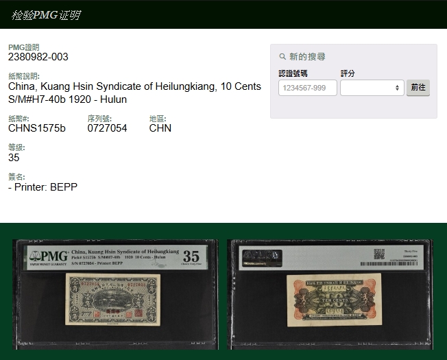 紙鈔分類 中國紙鈔清代~紙幣/股票/債券(8310-8323)『楊展孝』收藏~中央銀行銀元兑換券(8324-8380)民國~中央銀行紙幣(8381-8424)民國~中國銀行(8425-8448)民國~交通銀行(8449-8459)民國~中國農民銀行(8460-8462)民國~各省銀行券(8463-8491)民國~軍用鈔票(8492-8504)民國~地方券/錢莊票(8505-8510)民國~偽政權紙幣(8511-8519)民國金融票證~債券/股票(8520-8543)臺灣銀行~日治時期(8544-8552)臺灣銀行~老台幣(8553-8577)臺灣銀行~新台幣(8578-8679)臺灣銀行~限金門/限馬祖通用(8680-8694)臺灣銀行~限大陳島通用(8695-8696)臺灣/中央銀行~趣味號(8697-8706)中央銀行~三連鈔(8707-8709)臺灣各式金融票證(8710-8715)日本『山崎 修之亮』收藏~中國及外國紙幣(8716-8738)新中國紙幣解放區時期紙幣/債券(8739-8740)中國人民銀行~各版人民幣/外匯券/金融票證(8741-8759)世界各國紙幣日本紙幣(8760-8773)世界各國紙幣(A~Z)(8774-8783) 中國紙鈔 ↳清代~紙幣/股票/債券(8310-8323) ↳『楊展孝』收藏~中央銀行銀元兑換券(8324-8380) ↳民國~中央銀行紙幣(8381-8424) ↳民國~中國銀行(8425-8448) ↳民國~交通銀行(8449-8459) ↳民國~中國農民銀行(8460-8462) ↳民國~各省銀行券(8463-8491) ↳民國~軍用鈔票(8492-8504) ↳民國~地方券/錢莊票(8505-8510) ↳民國~偽政權紙幣(8511-8519) ↳民國金融票證~債券/股票(8520-8543) ↳臺灣銀行~日治時期(8544-8552) ↳臺灣銀行~老台幣(8553-8577) ↳臺灣銀行~新台幣(8578-8679) ↳臺灣銀行~限金門/限馬祖通用(8680-8694) ↳臺灣銀行~限大陳島通用(8695-8696) ↳臺灣/中央銀行~趣味號(8697-8706) ↳中央銀行~三連鈔(8707-8709) ↳臺灣各式金融票證(8710-8715) ↳日本『山崎 修之亮』收藏~中國及外國紙幣(8716-8738)新中國紙幣 ↳解放區時期紙幣/債券(8739-8740) ↳中國人民銀行~各版人民幣/外匯券/金融票證(8741-8759)世界各國紙幣 ↳日本紙幣(8760-8773) ↳世界各國紙幣(A~Z)(8774-8783) 點大圖放大展示,點小圖切換 4 黑龍江廣信公司兌換券輔幣民國9年1角,加蓋『呼倫發』地名,稀少,PMG Choice Very Fine35(Page 59) 結標時間 2025-12-16 12:37:40 拍品編號:8474 起拍價:NT$8500 當前價:NT$8500 自動出價 直接出價 出價 系統將按出價級數,依序為您比(出)價至上限金額 提醒您:直接出價後不可將金額改低,只能改高,蟠龍無法降低您的出價,最高出價者無法取消出價 (查看出價說明) 得標說明:需按得標價另加10%佣金 當前加價幅度:NT$0元 (查看加價級數表) 回上頁 線上出價記錄 線上 0 人次,書面 0 人次 競價客戶 所在地 出價時間 出價金額 出價方式 問與答 目前尚無提問 我要提問 請先登入會員