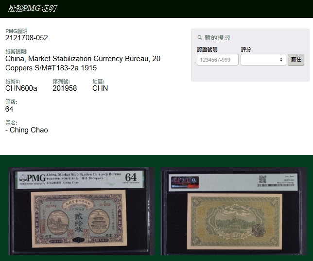 紙鈔分類 中國紙鈔清代~紙幣/股票/債券(8310-8323)『楊展孝』收藏~中央銀行銀元兑換券(8324-8380)民國~中央銀行紙幣(8381-8424)民國~中國銀行(8425-8448)民國~交通銀行(8449-8459)民國~中國農民銀行(8460-8462)民國~各省銀行券(8463-8491)民國~軍用鈔票(8492-8504)民國~地方券/錢莊票(8505-8510)民國~偽政權紙幣(8511-8519)民國金融票證~債券/股票(8520-8543)臺灣銀行~日治時期(8544-8552)臺灣銀行~老台幣(8553-8577)臺灣銀行~新台幣(8578-8679)臺灣銀行~限金門/限馬祖通用(8680-8694)臺灣銀行~限大陳島通用(8695-8696)臺灣/中央銀行~趣味號(8697-8706)中央銀行~三連鈔(8707-8709)臺灣各式金融票證(8710-8715)日本『山崎 修之亮』收藏~中國及外國紙幣(8716-8738)新中國紙幣解放區時期紙幣/債券(8739-8740)中國人民銀行~各版人民幣/外匯券/金融票證(8741-8759)世界各國紙幣日本紙幣(8760-8773)世界各國紙幣(A~Z)(8774-8783) 中國紙鈔 ↳清代~紙幣/股票/債券(8310-8323) ↳『楊展孝』收藏~中央銀行銀元兑換券(8324-8380) ↳民國~中央銀行紙幣(8381-8424) ↳民國~中國銀行(8425-8448) ↳民國~交通銀行(8449-8459) ↳民國~中國農民銀行(8460-8462) ↳民國~各省銀行券(8463-8491) ↳民國~軍用鈔票(8492-8504) ↳民國~地方券/錢莊票(8505-8510) ↳民國~偽政權紙幣(8511-8519) ↳民國金融票證~債券/股票(8520-8543) ↳臺灣銀行~日治時期(8544-8552) ↳臺灣銀行~老台幣(8553-8577) ↳臺灣銀行~新台幣(8578-8679) ↳臺灣銀行~限金門/限馬祖通用(8680-8694) ↳臺灣銀行~限大陳島通用(8695-8696) ↳臺灣/中央銀行~趣味號(8697-8706) ↳中央銀行~三連鈔(8707-8709) ↳臺灣各式金融票證(8710-8715) ↳日本『山崎 修之亮』收藏~中國及外國紙幣(8716-8738)新中國紙幣 ↳解放區時期紙幣/債券(8739-8740) ↳中國人民銀行~各版人民幣/外匯券/金融票證(8741-8759)世界各國紙幣 ↳日本紙幣(8760-8773) ↳世界各國紙幣(A~Z)(8774-8783) 點大圖放大展示,點小圖切換 3 財政部平市官錢局民國4年20枚京兆,PMG Choice Uncirculated 64(Page 62) 結標時間 2025-12-16 12:46:00 拍品編號:8499 起拍價:NT$4500 當前價:NT$4500 自動出價 直接出價 出價 系統將按出價級數,依序為您比(出)價至上限金額 提醒您:直接出價後不可將金額改低,只能改高,蟠龍無法降低您的出價,最高出價者無法取消出價 (查看出價說明) 得標說明:需按得標價另加10%佣金 當前加價幅度:NT$0元 (查看加價級數表) 回上頁 線上出價記錄 線上 0 人次,書面 0 人次 競價客戶 所在地 出價時間 出價金額 出價方式 問與答 目前尚無提問 我要提問 請先登入會員