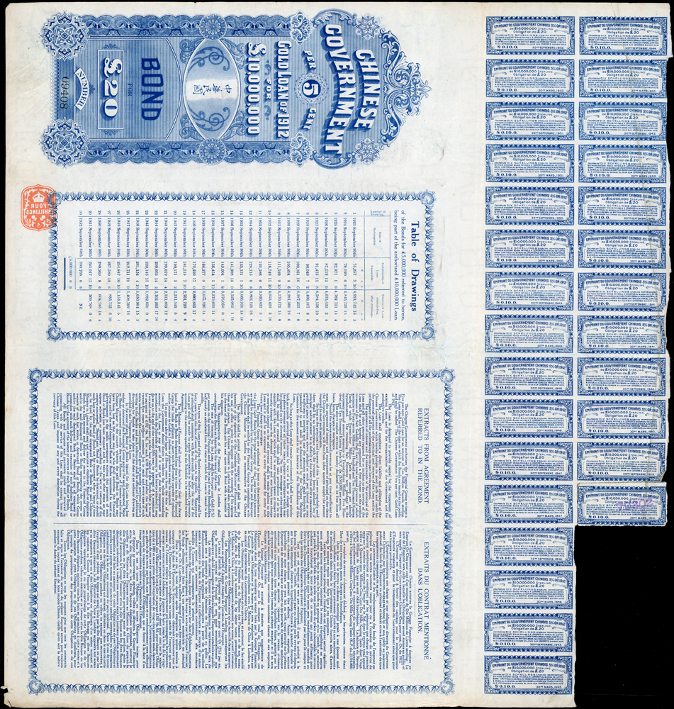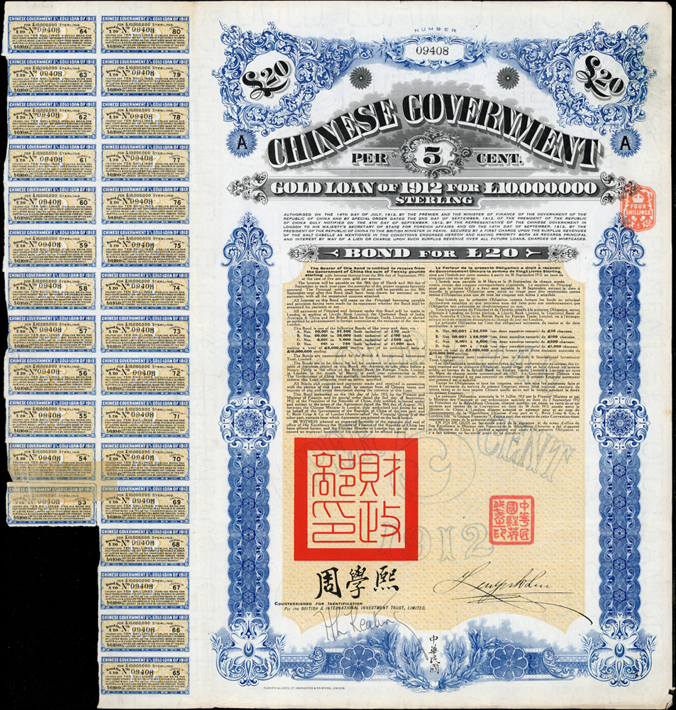 1912年中華民國與英商克里斯浦銀行團借款-五厘黃金貸款債券£20英鎊(42.5*45.3cm),有水印,蓋有中華民國駐英代辦關防,駐英公使劉玉麟及北洋政府財政總長周學熙簽名,含部分息票,對折,右下角尖微損,80新(Page 63)